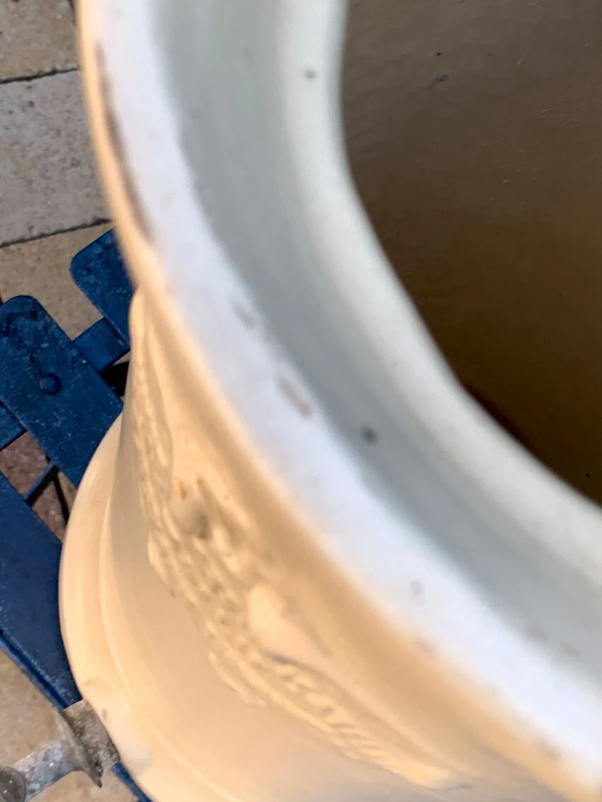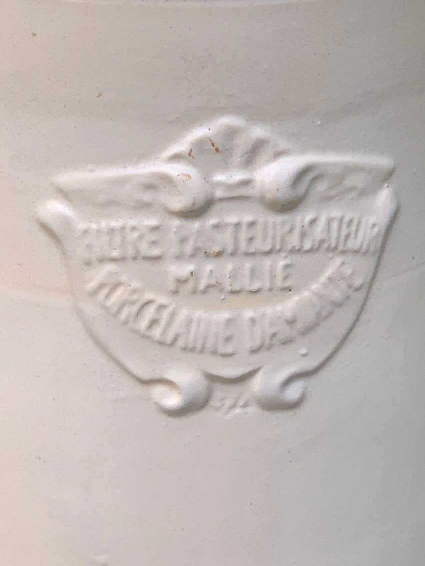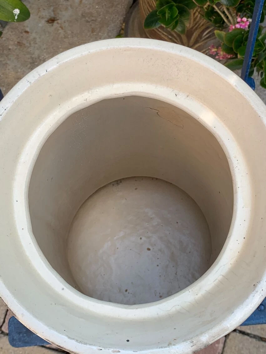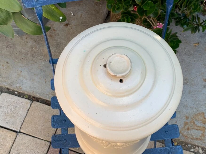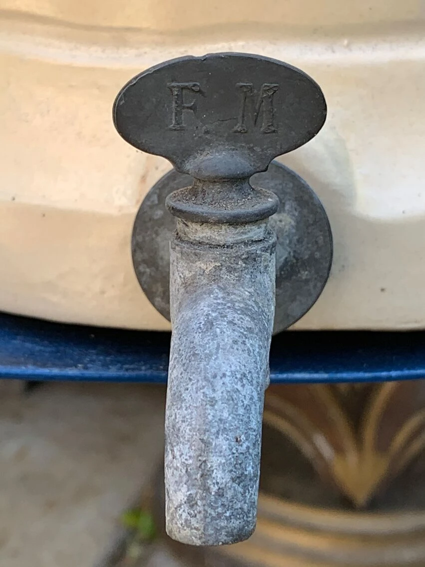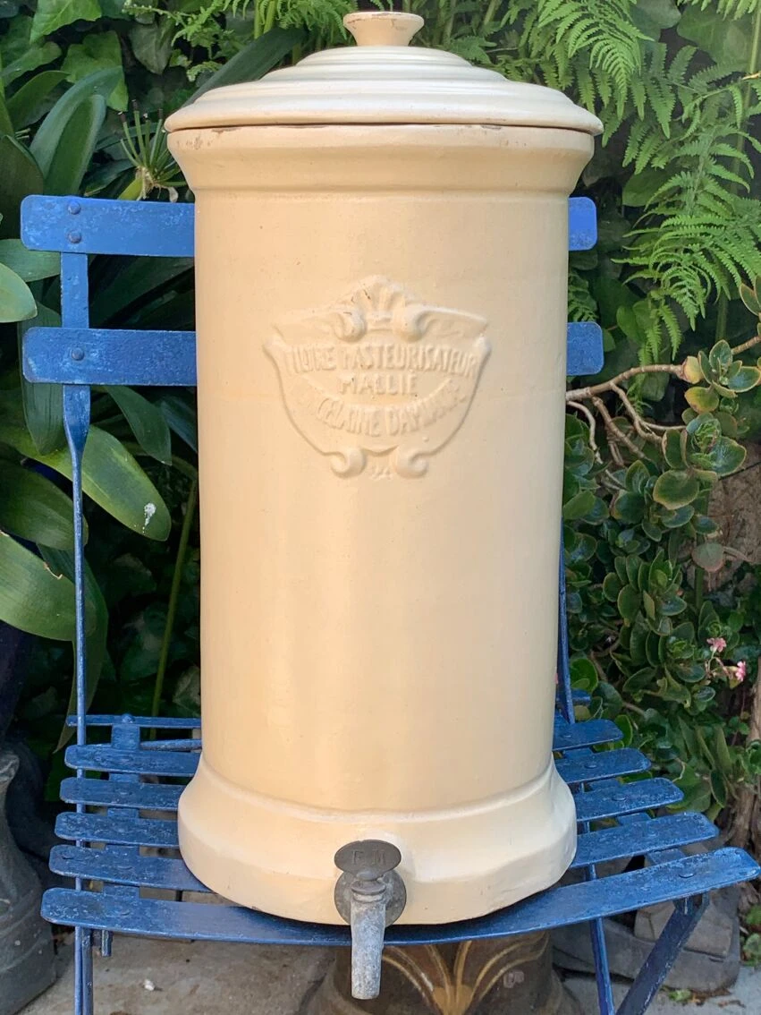 Ancienne fontaine filtre à eau pasteurisateur maille porcelaine damiante en grès et robinet en étain.