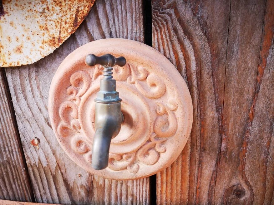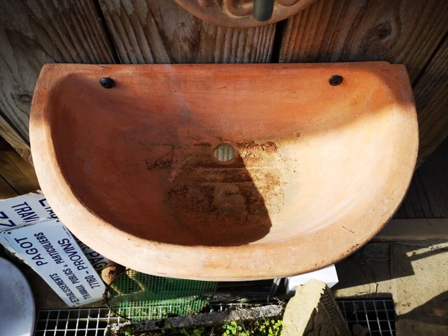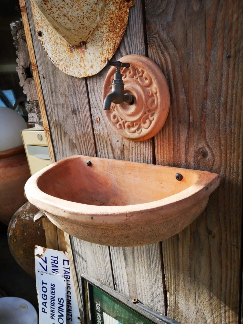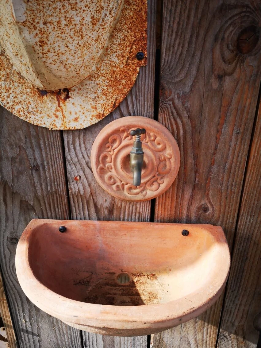 Fontaine en terre cuite, fait main, avec robinet et rosace.