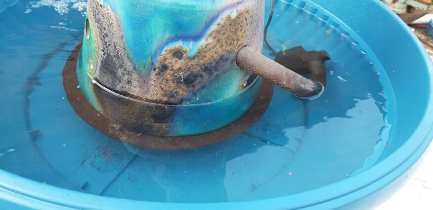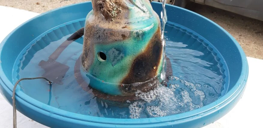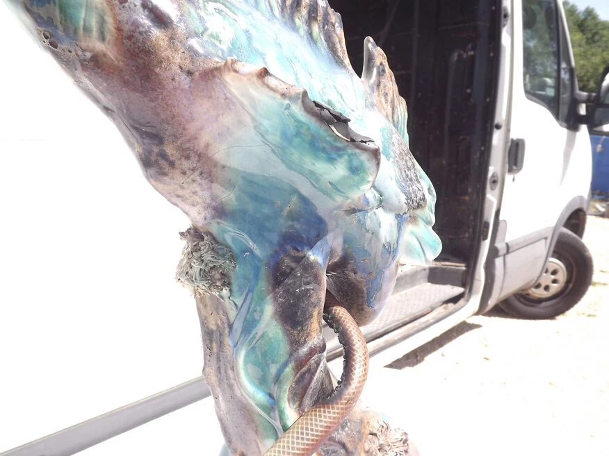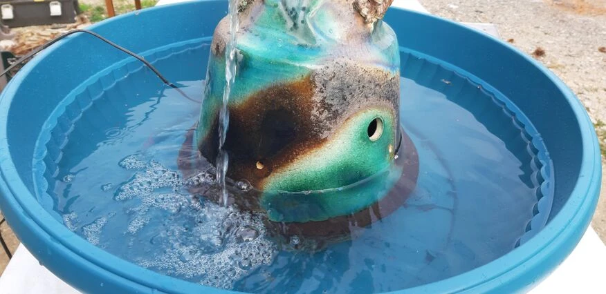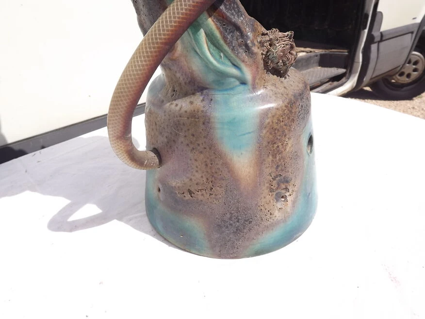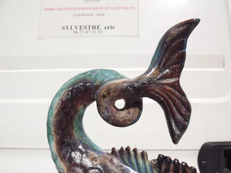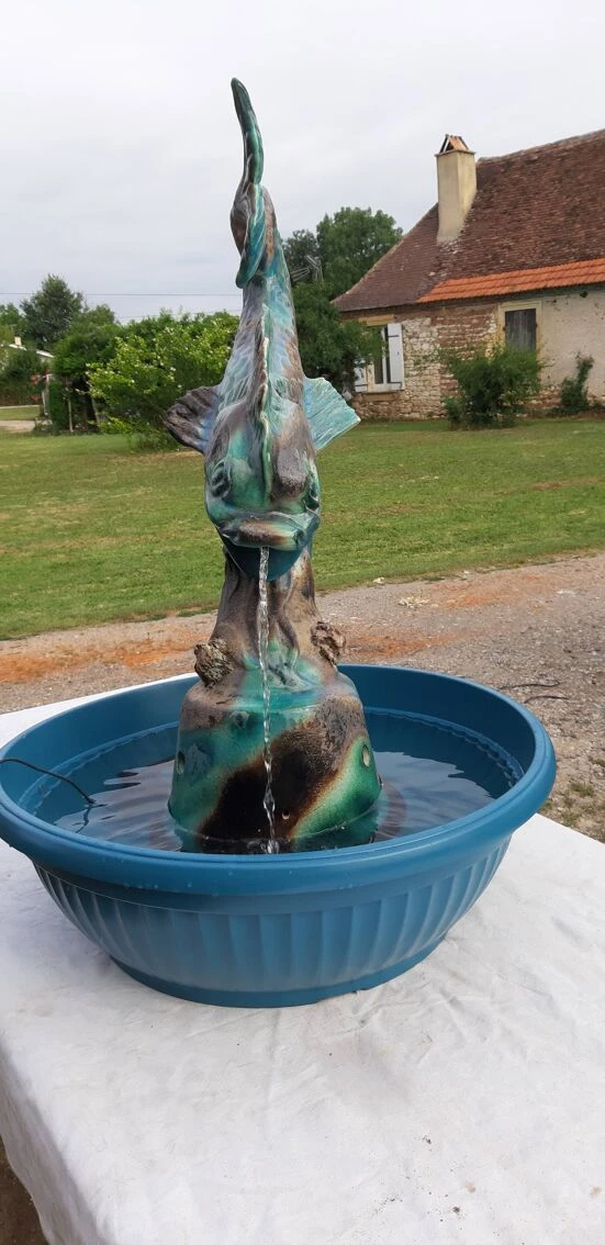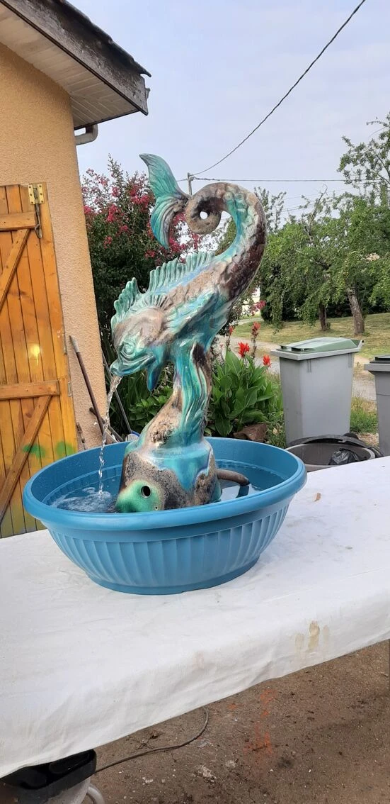 Fontaine faience de vallauris «dauphin armoirie de la ville d’antibes» haut: 83 cm, long et larg: 40 cm sur 25 cm, poid: 8, 6 kg, trés bon ètat, avec moteur pompe et bac plastic, .