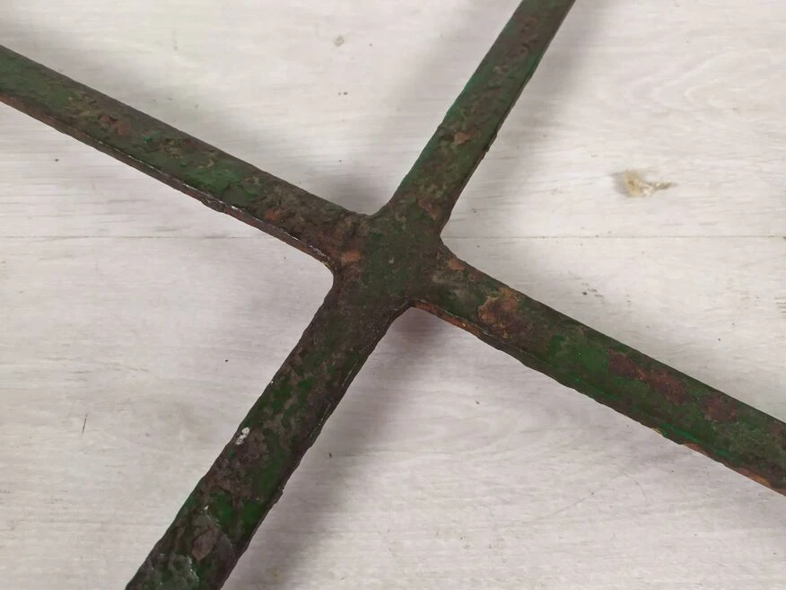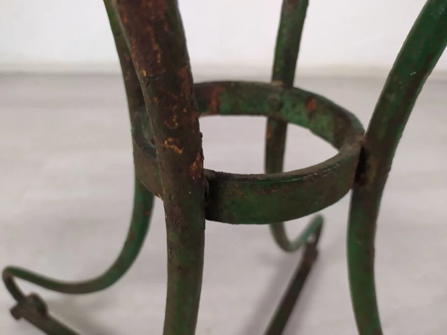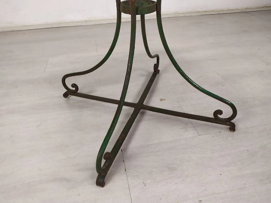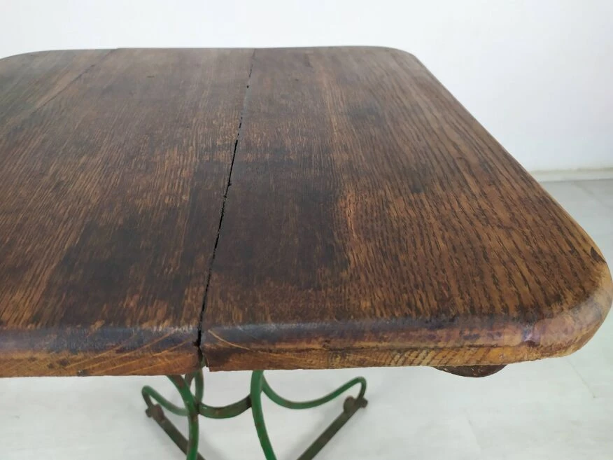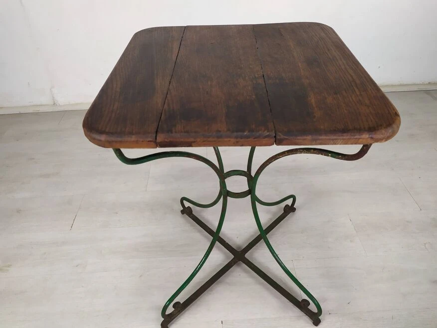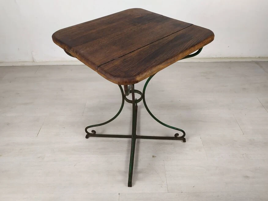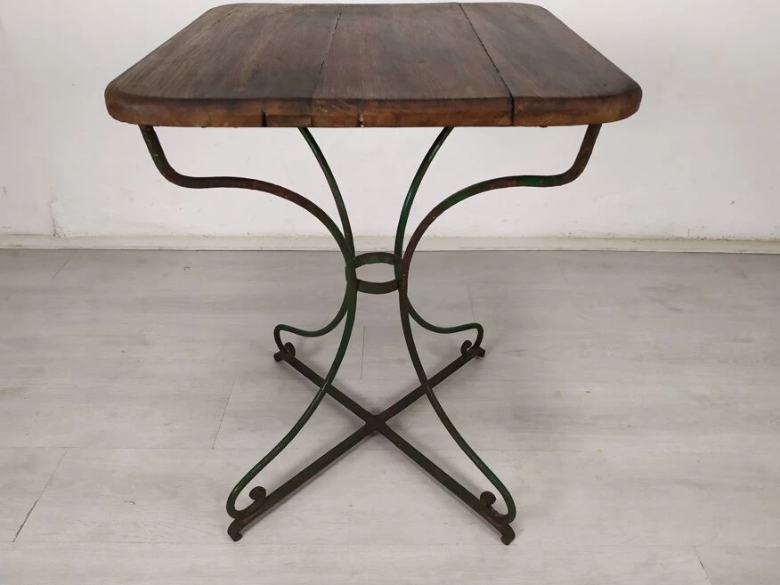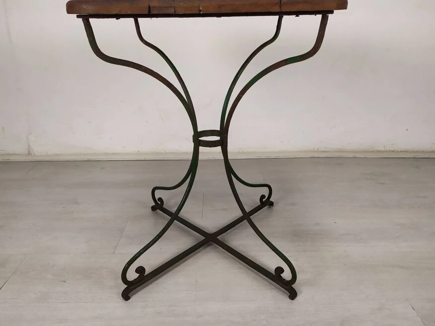 Ancien guéridon de jardin, fer forgé, plateau chêne massif.