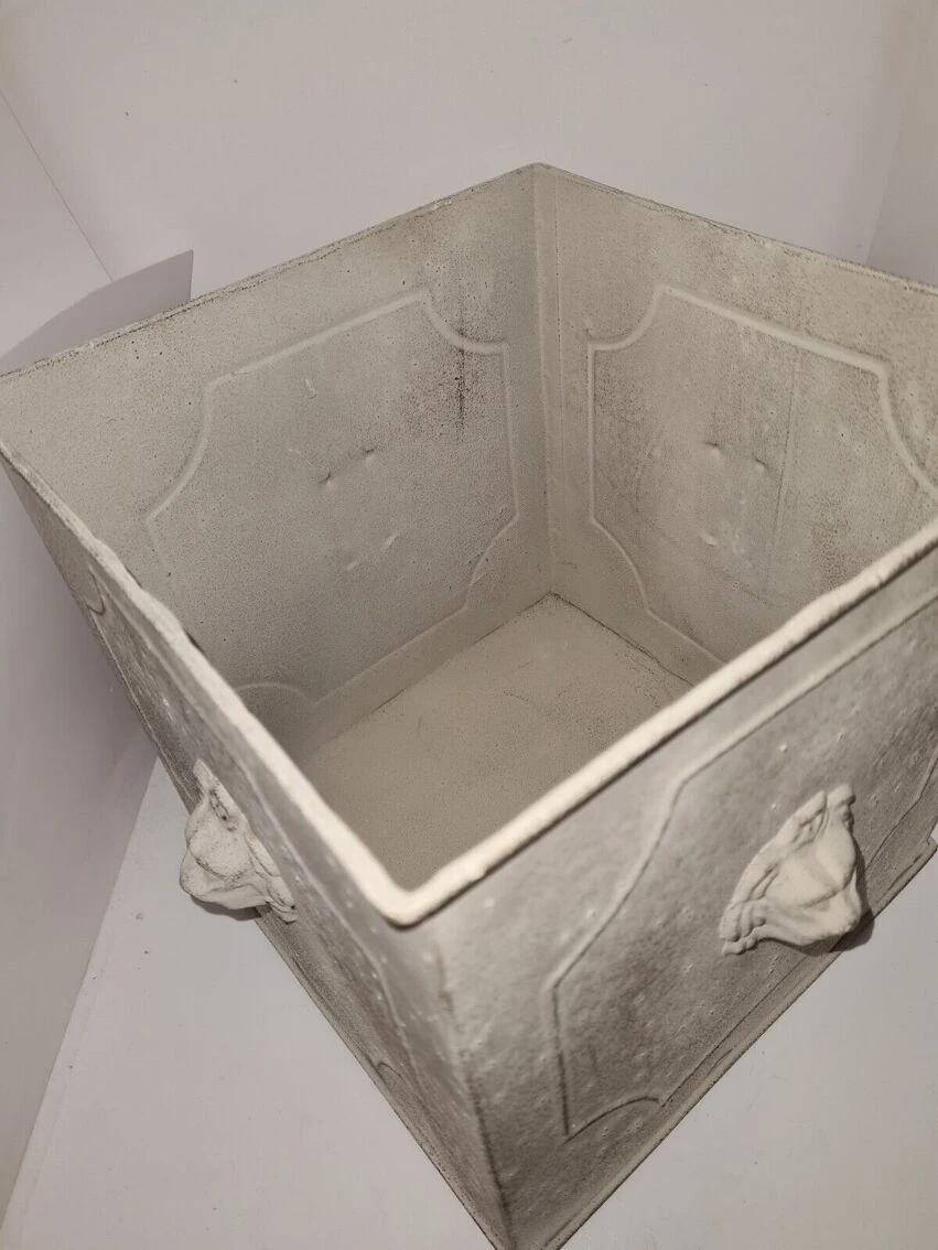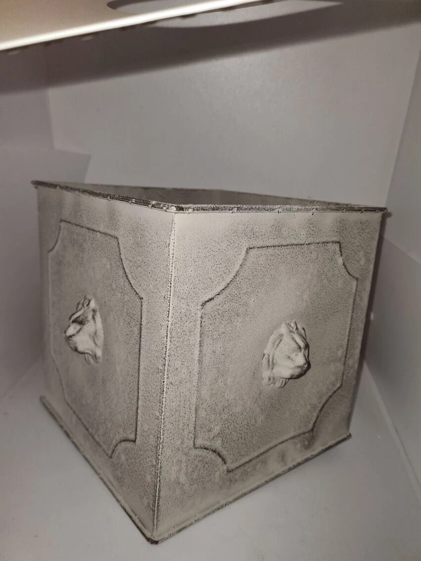 Pot de fleurs / jardinière avec des têtes de lion en métal patiné.