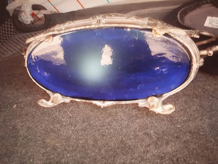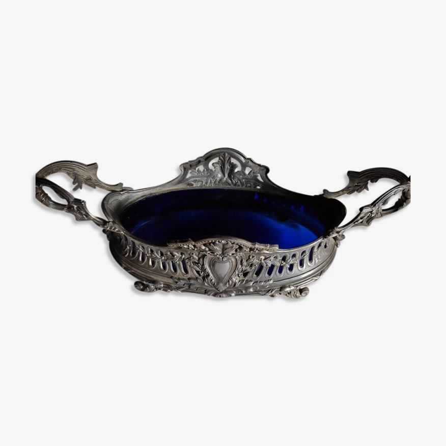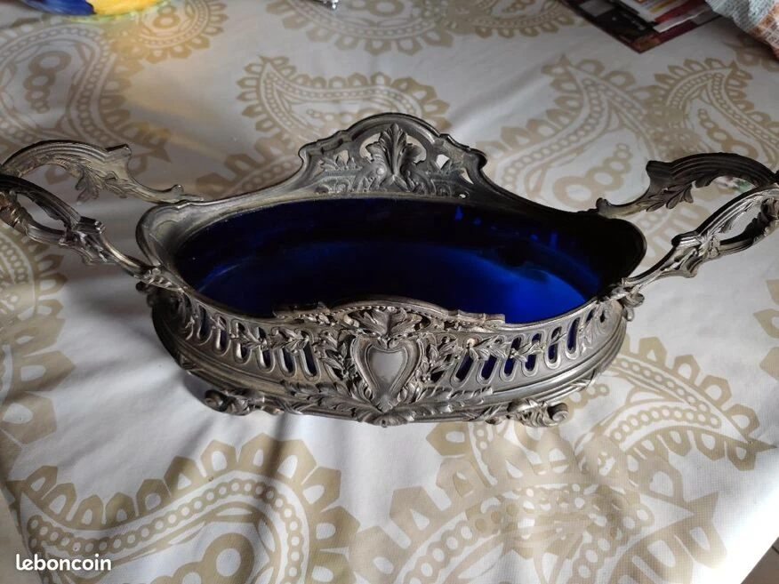 Superbe jardinière ancienne de table ou cache pot métal gris argent et noir intérieur en verre bleu.