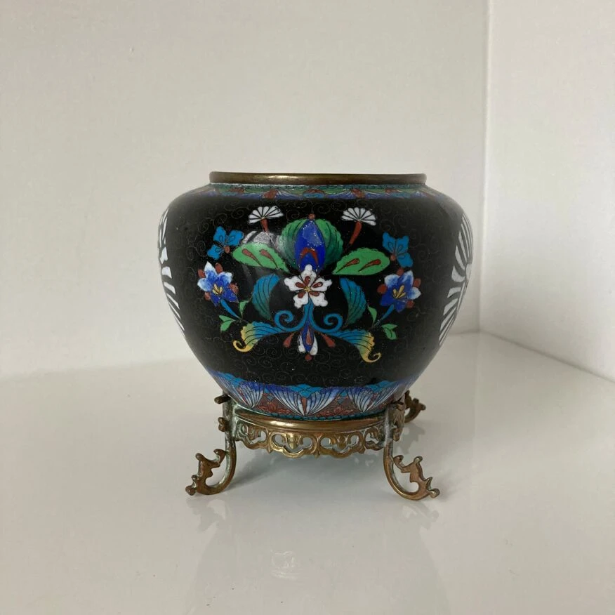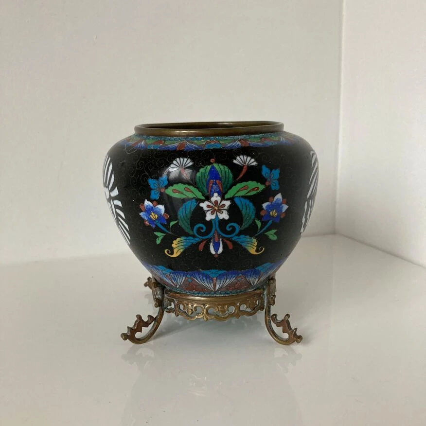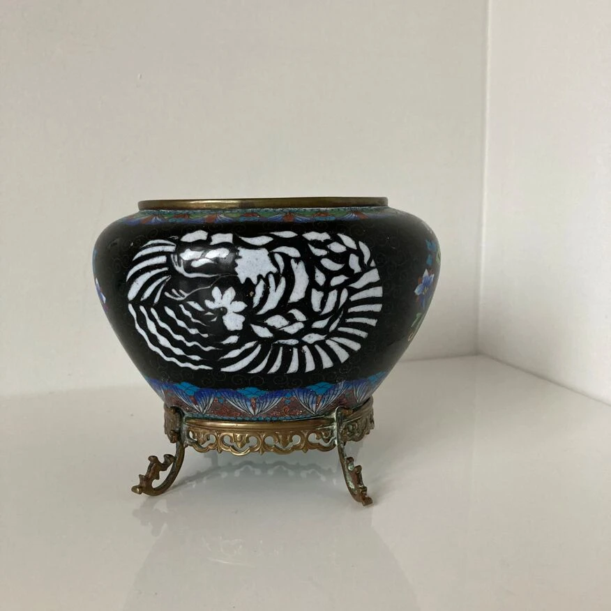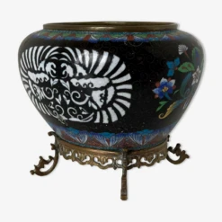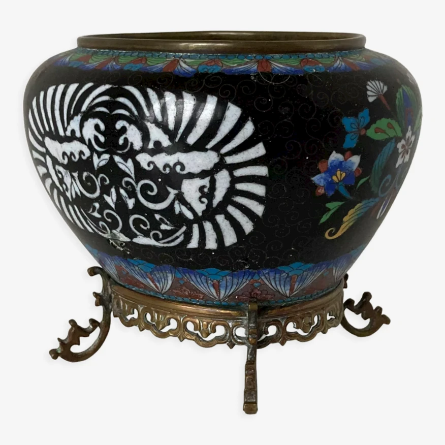 Jolie petite jardinière bombée en cuivre et émaux cloisonnés polychromes à décor d’un dragon et d’un phénix stylisés et de fleurs.