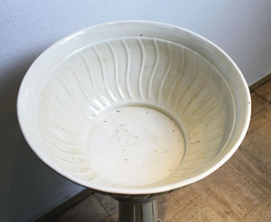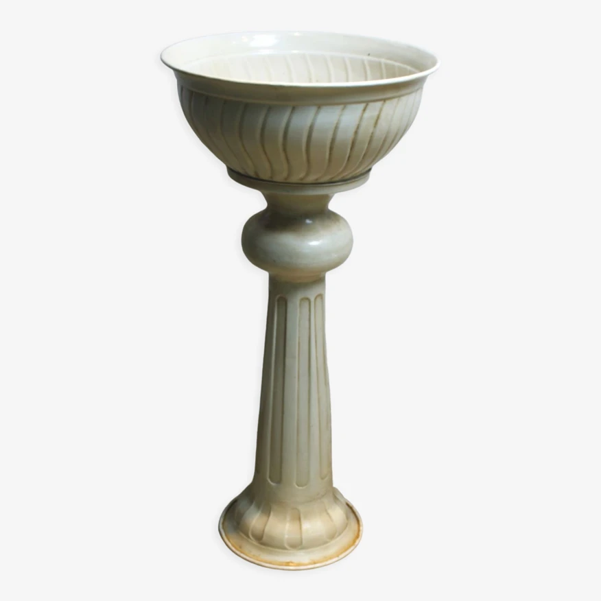 Vasque en métal émaillé sur pied ionique de style médicis.tant comme jardinière d’intérieur que comme “mangeoire” ou bain d’oiseaux au jardin ou en terrasse, cette pièce émaillée dans les tons écrus, de belle proportion, est en parfait état.
