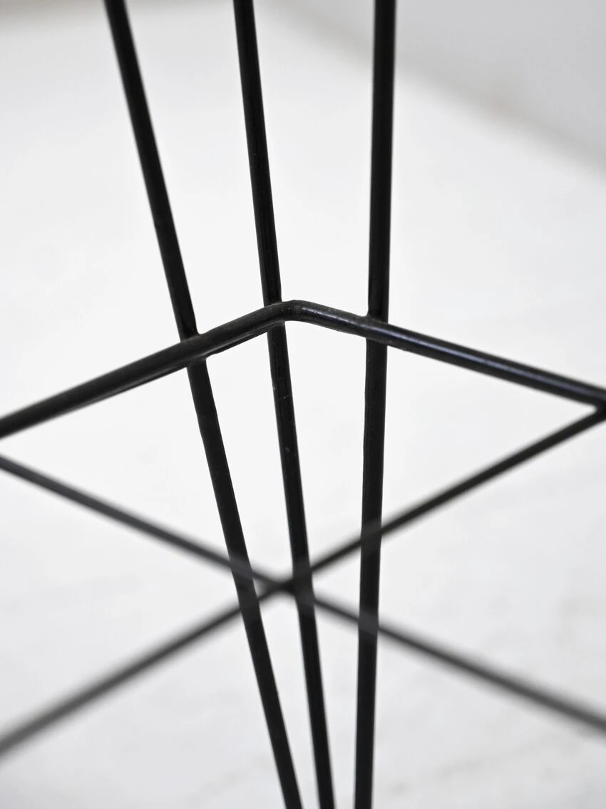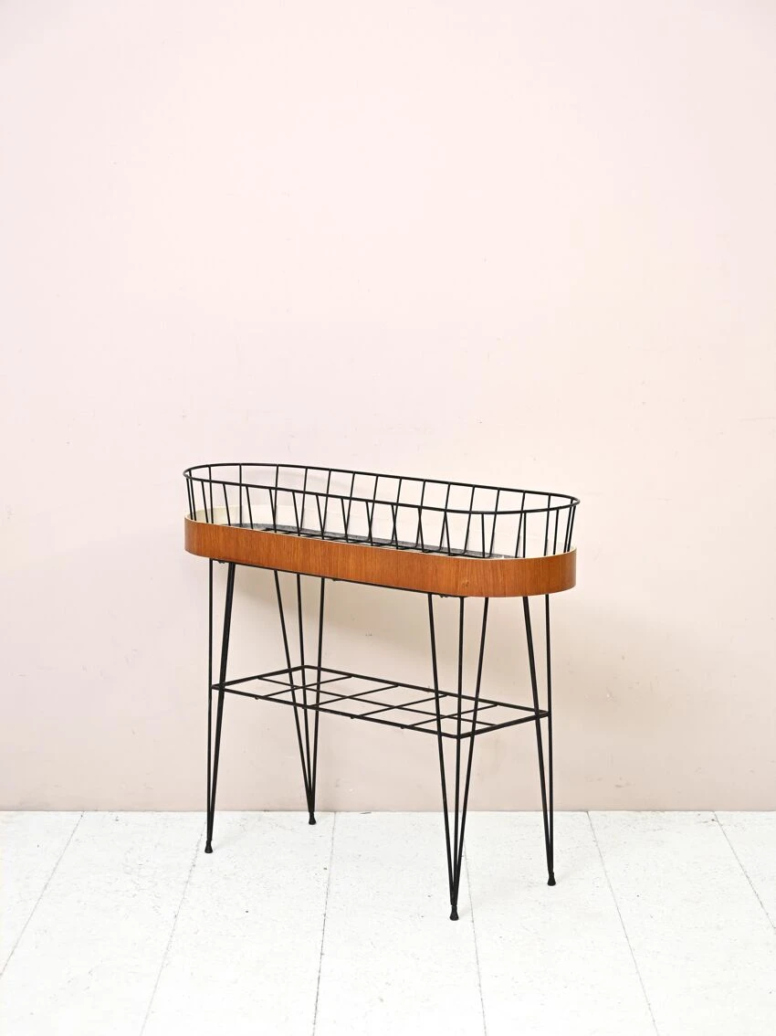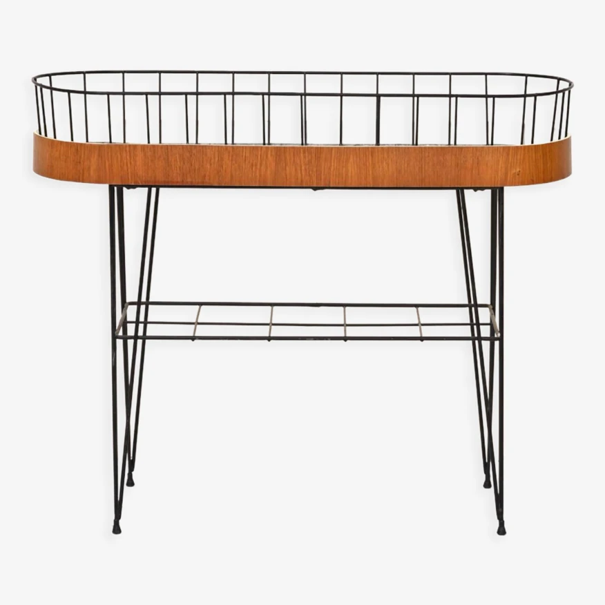 Meuble particulier composé d’une base métallique et d’une bordure de jardinière en bois de teck incurvée.