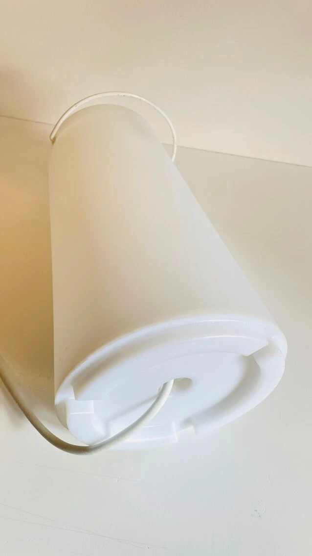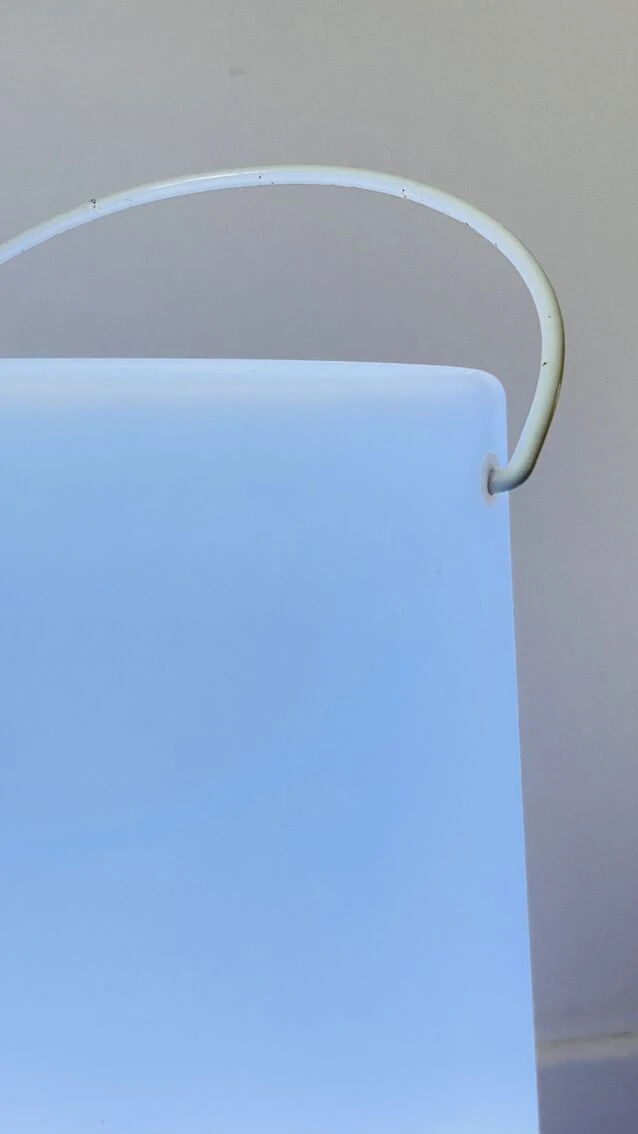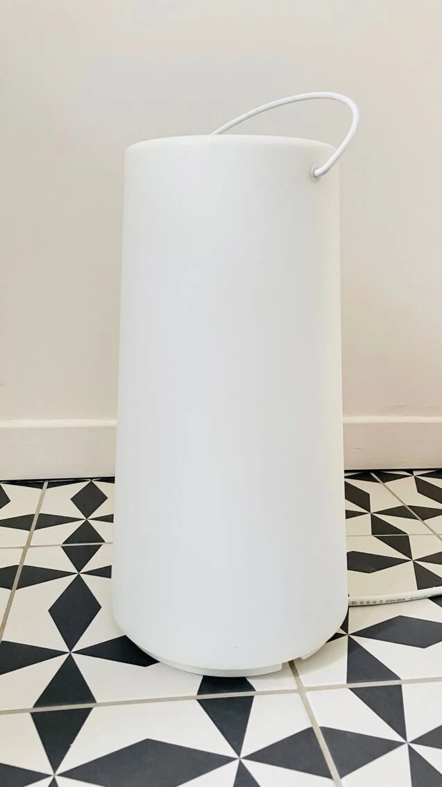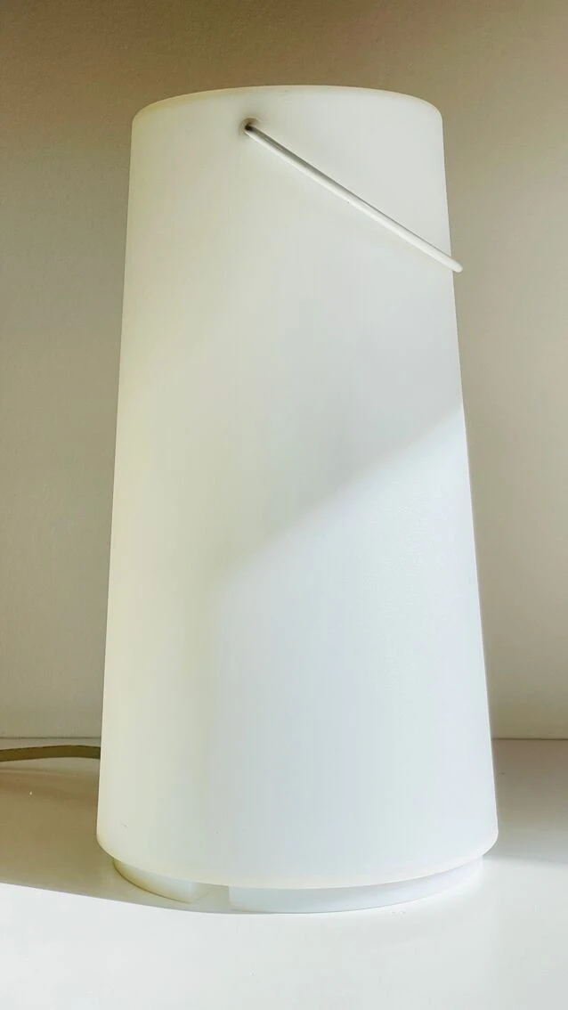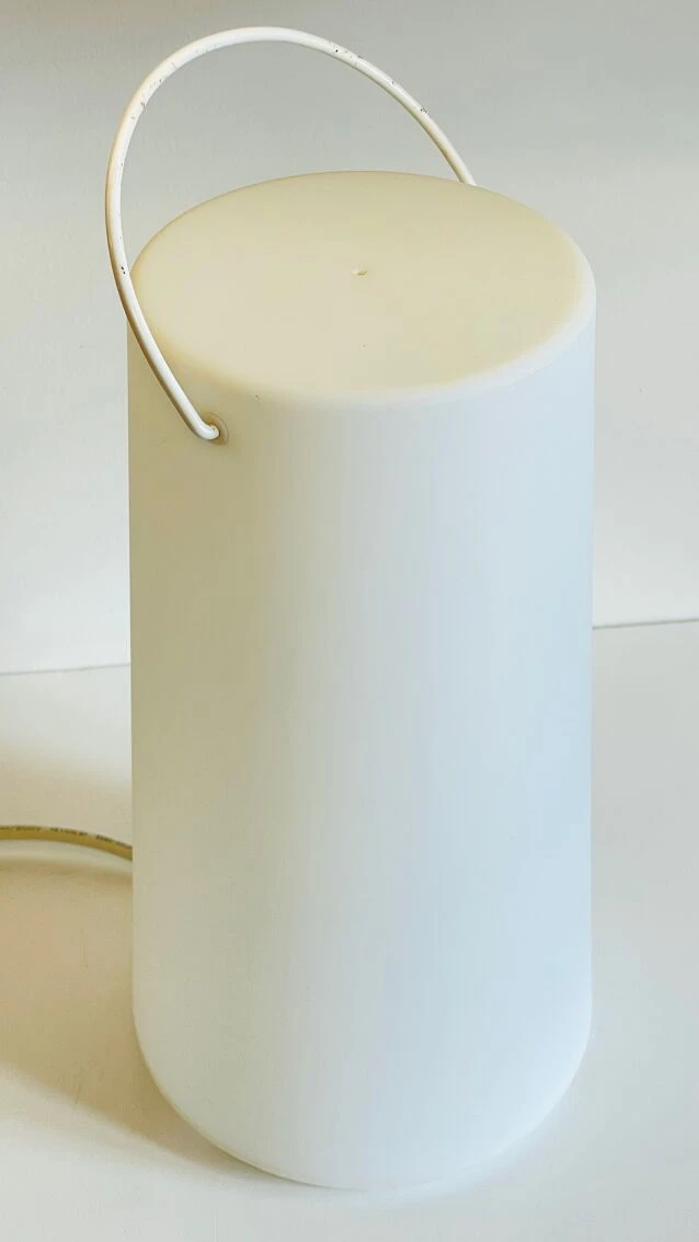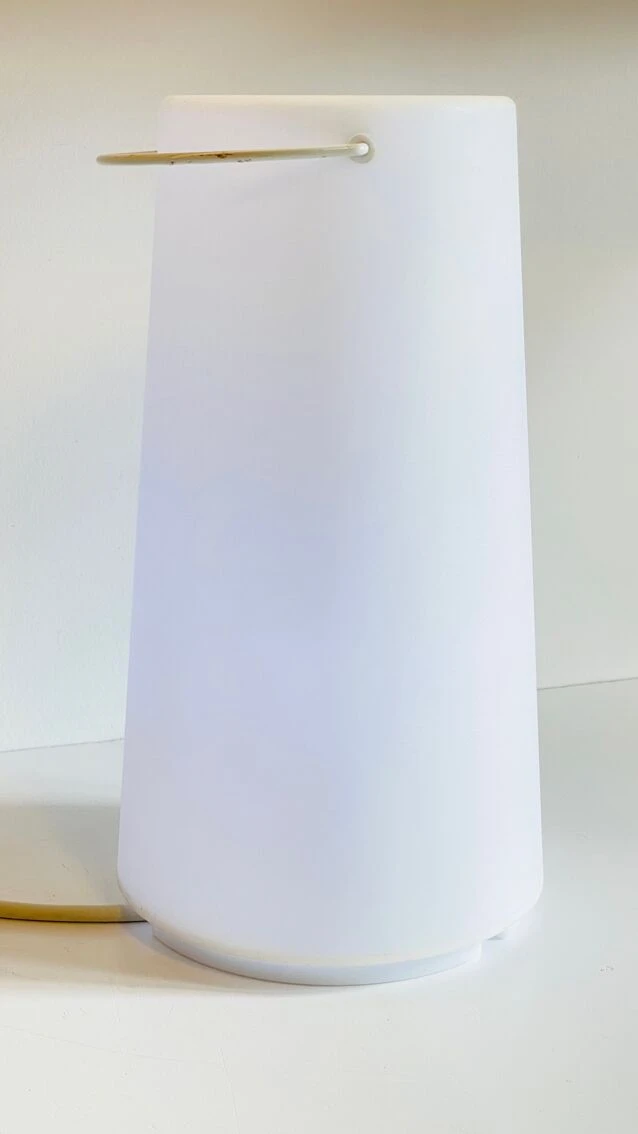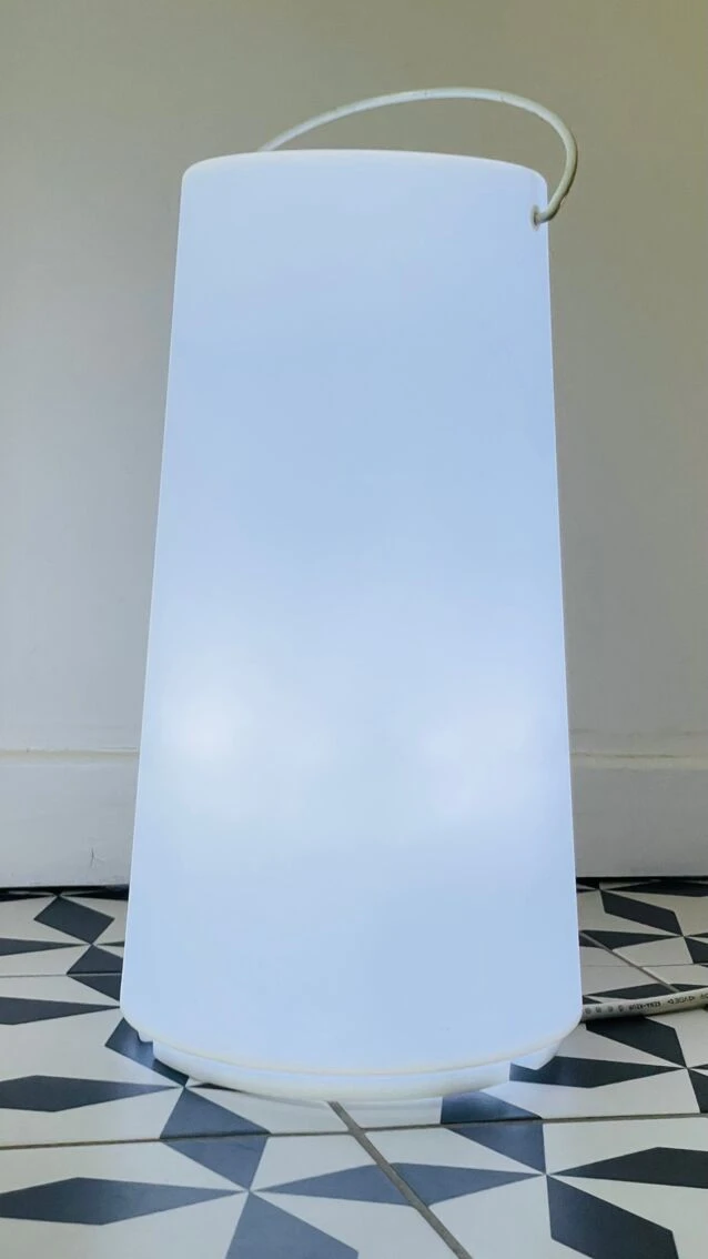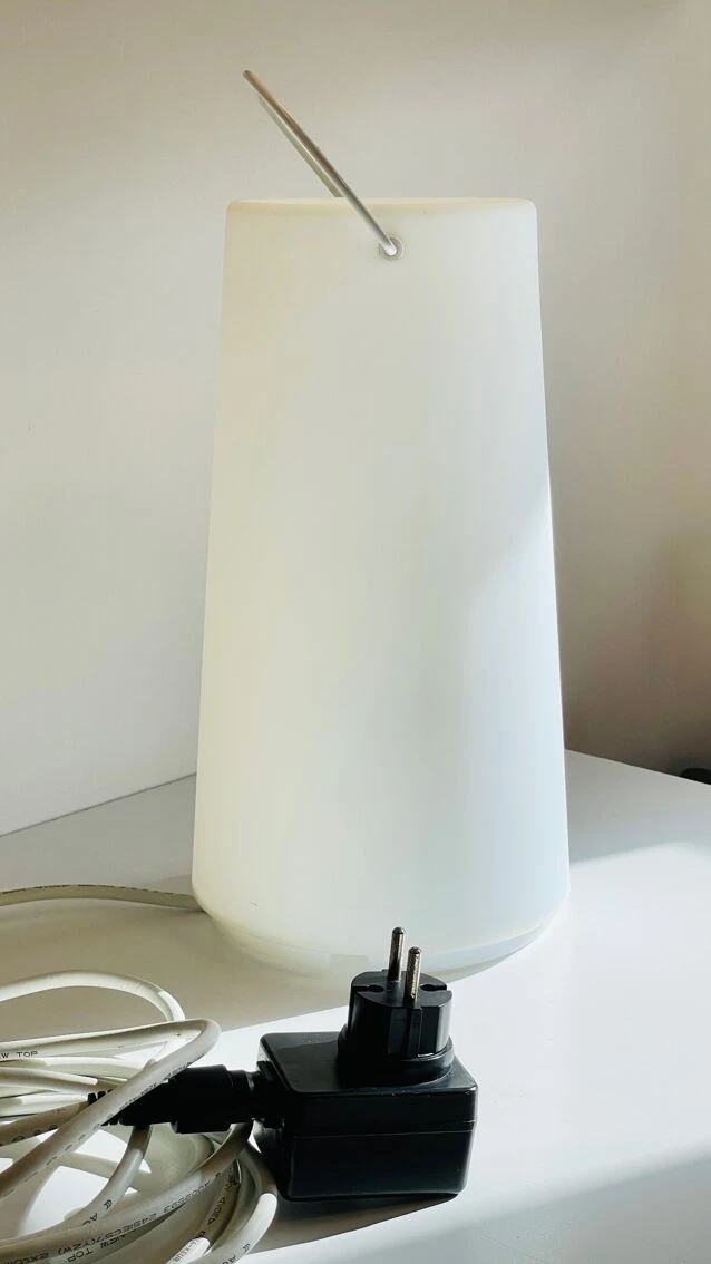 Très belle lampe baladeuse ikea vintage par le designer suédois ola wihlborg, une lampe avec anse pour l’extérieur mais aussi l’intérieur. 1 lampe chic à poser, à suspendre et à déplacer aisément en matière synthétique et métal, modèle épuré et géométrique sous le nom de glansa lysa des années 90, plus éditée aujourd’hui.