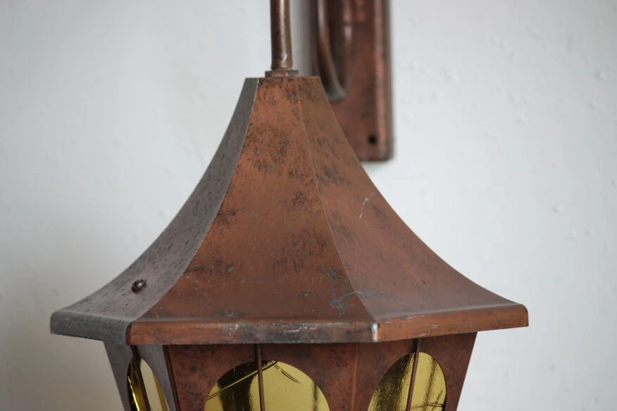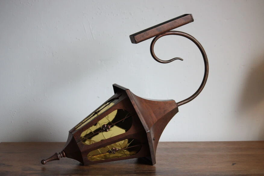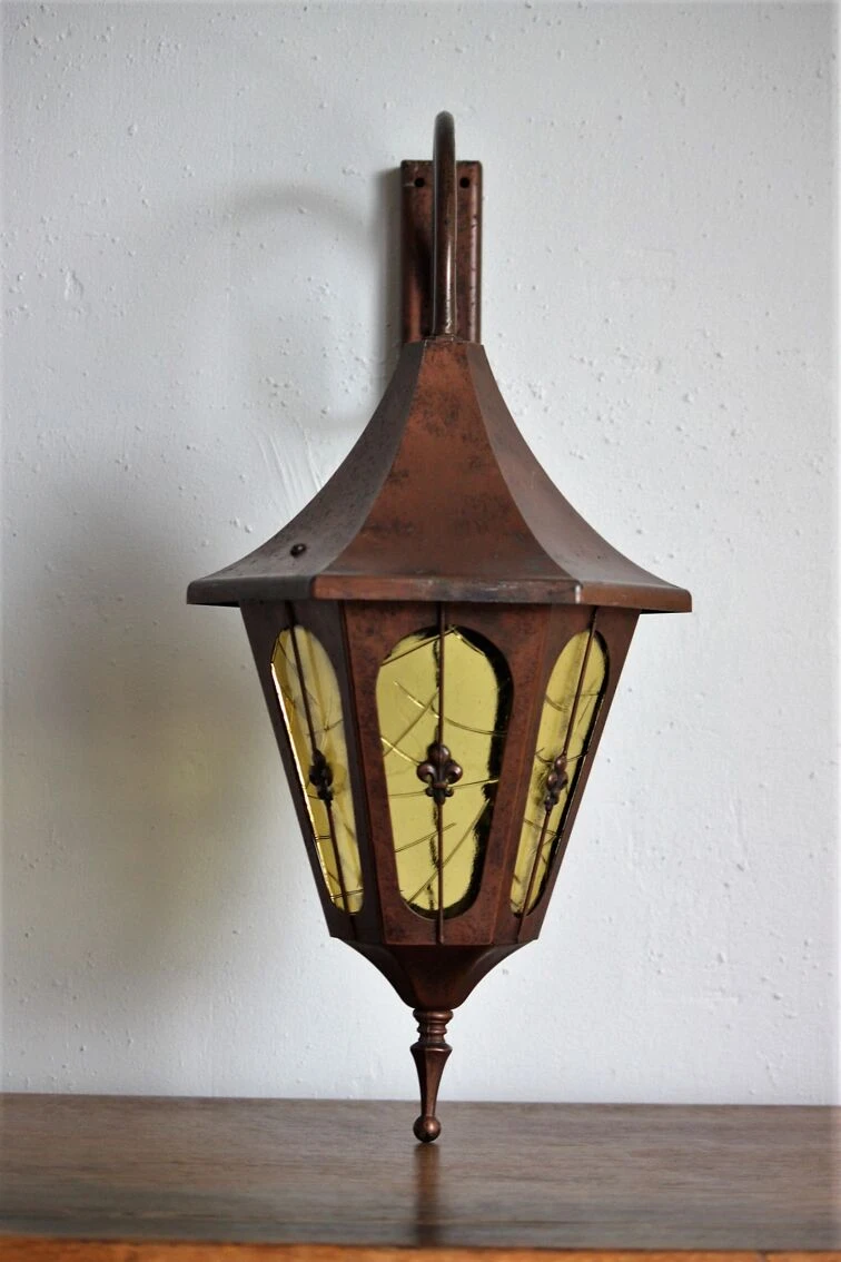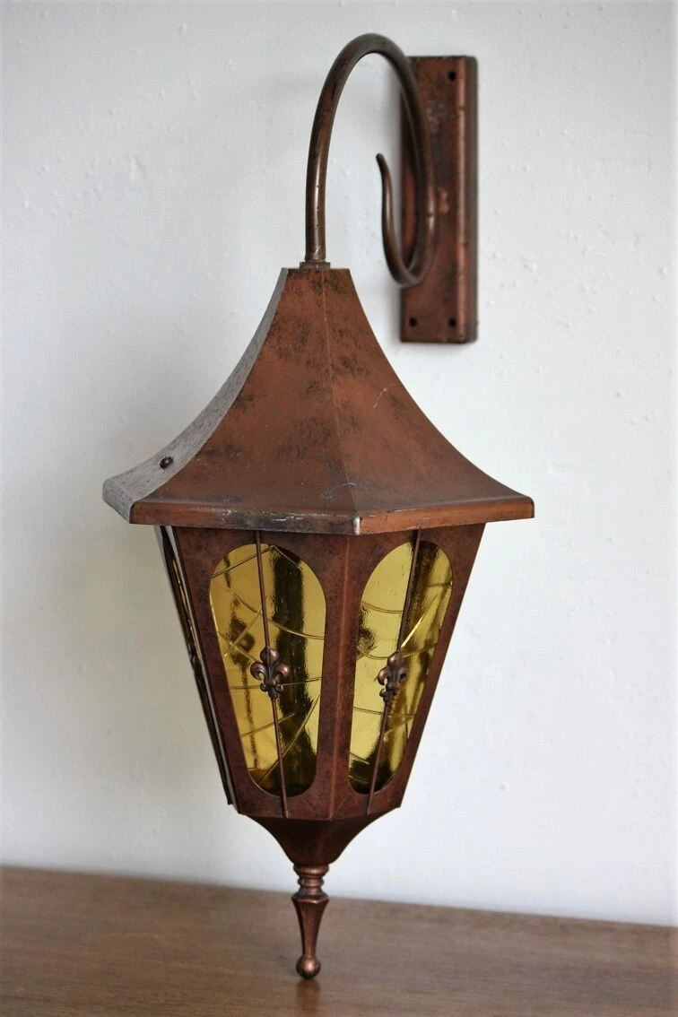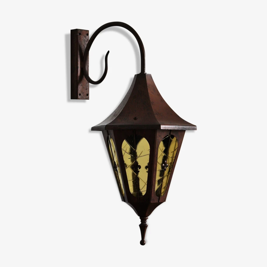 Lanterne murale composée d’une volute avec au bout une lanterne à cage décorée de fleurs de lys et vitrée de 6 verres teintés jaunes et à motif traits et d’un chapeau 6 pans – la lampe est en métal couleur cuivre – dimensions hors tout: hauteur: +/- 47 cm cm – largeur: +/- 23 cm – profondeur: +/- 30 cm – dimensions de la lanterne (avec sa pointe du bas): h.35.5 cm – poids: 1.5 kg – le modèle est propre – a noter: pour l’envoi les verres seront démontés de la structure – le système électrique est d’origine – ce luminaire doit être branché conformément aux normes électriques du pays – pour votre sécurité, il est nécessaire d’effectuer une installation et d’une éventuelle mise aux normes électriques du luminaire par un électricien qualifié.