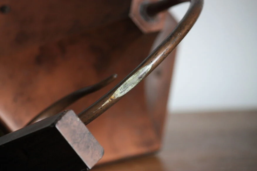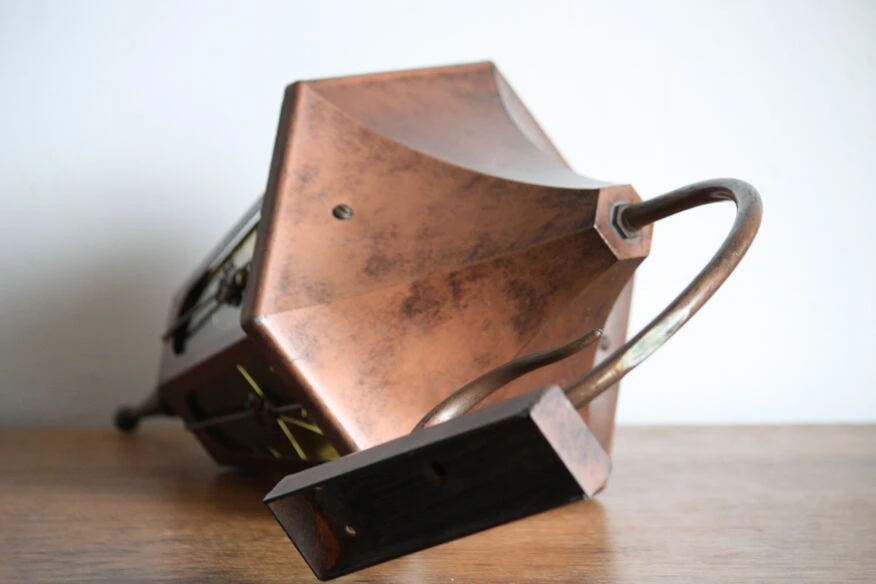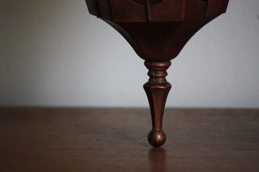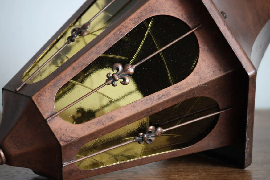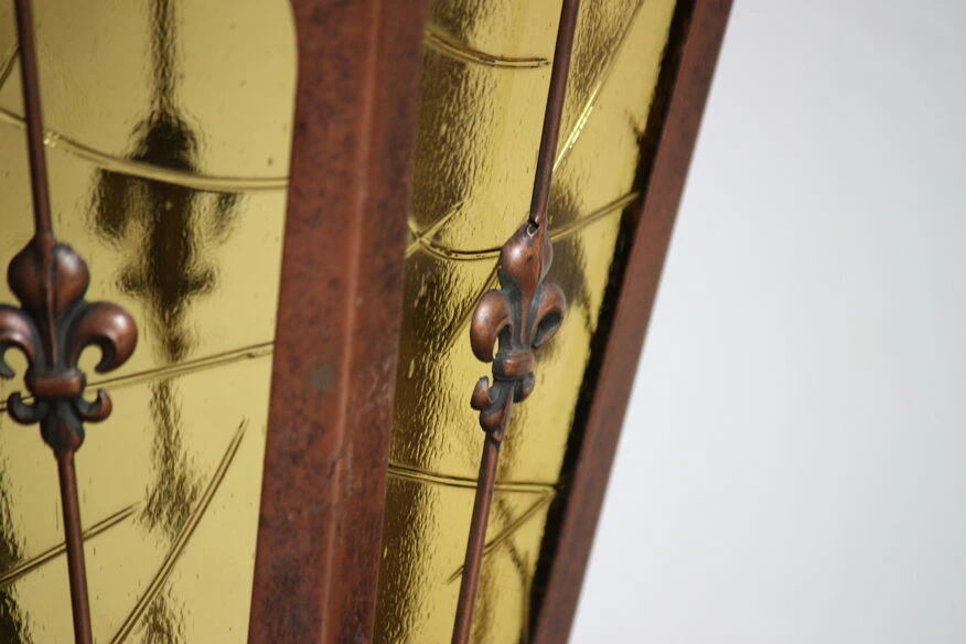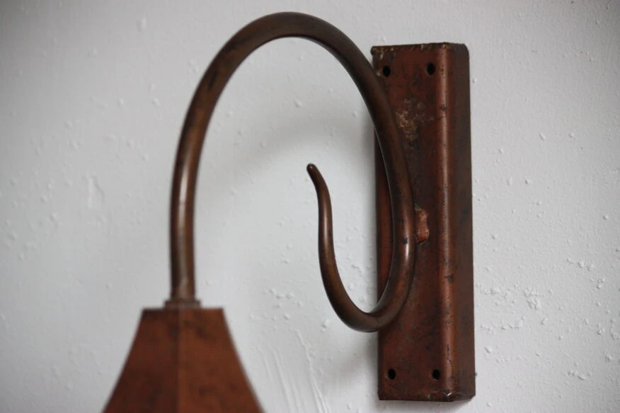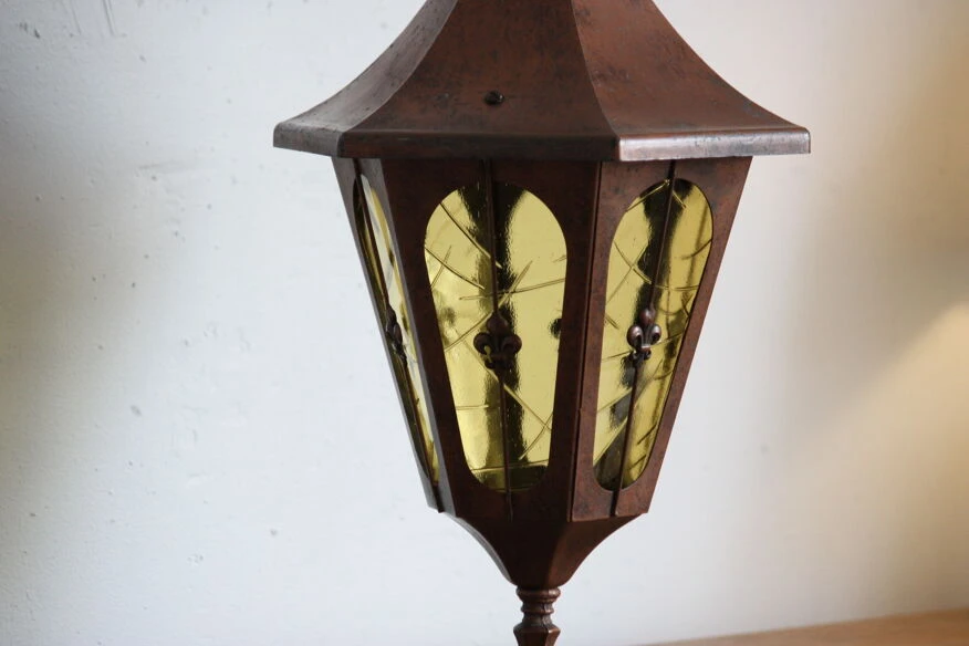Lanterne murale composée d’une volute avec au bout une lanterne à cage décorée de fleurs de lys et vitrée de 6 verres teintés jaunes et à motif traits et d’un chapeau 6 pans – la lampe est en métal couleur cuivre – dimensions hors tout: hauteur: +/- 47 cm cm – largeur: +/- 23 cm – profondeur: +/- 30 cm – dimensions de la lanterne (avec sa pointe du bas): h.35.5 cm – poids: 1.5 kg – le modèle est propre – a noter: pour l’envoi les verres seront démontés de la structure – le système électrique est d’origine – ce luminaire doit être branché conformément aux normes électriques du pays – pour votre sécurité, il est nécessaire d’effectuer une installation et d’une éventuelle mise aux normes électriques du luminaire par un électricien qualifié.