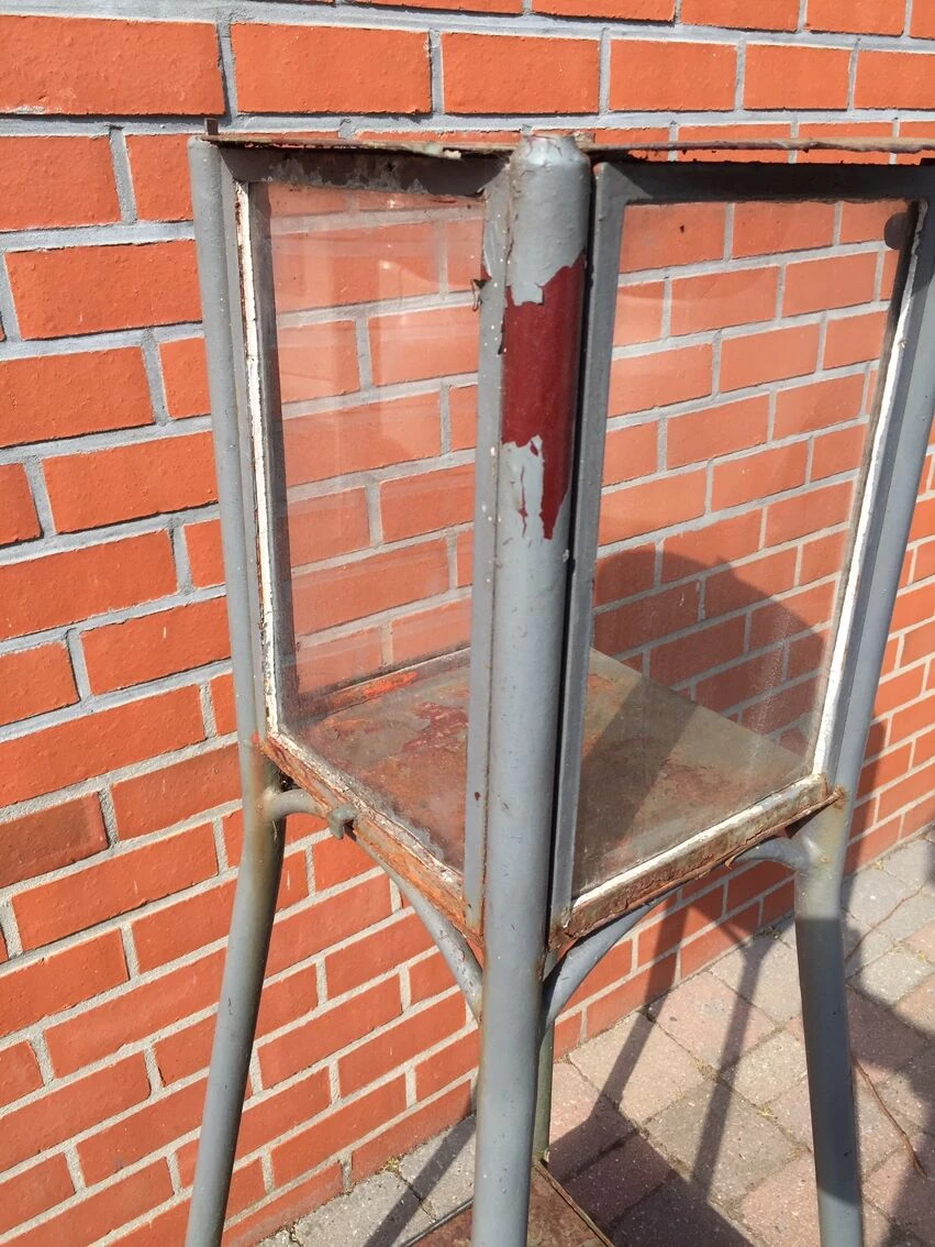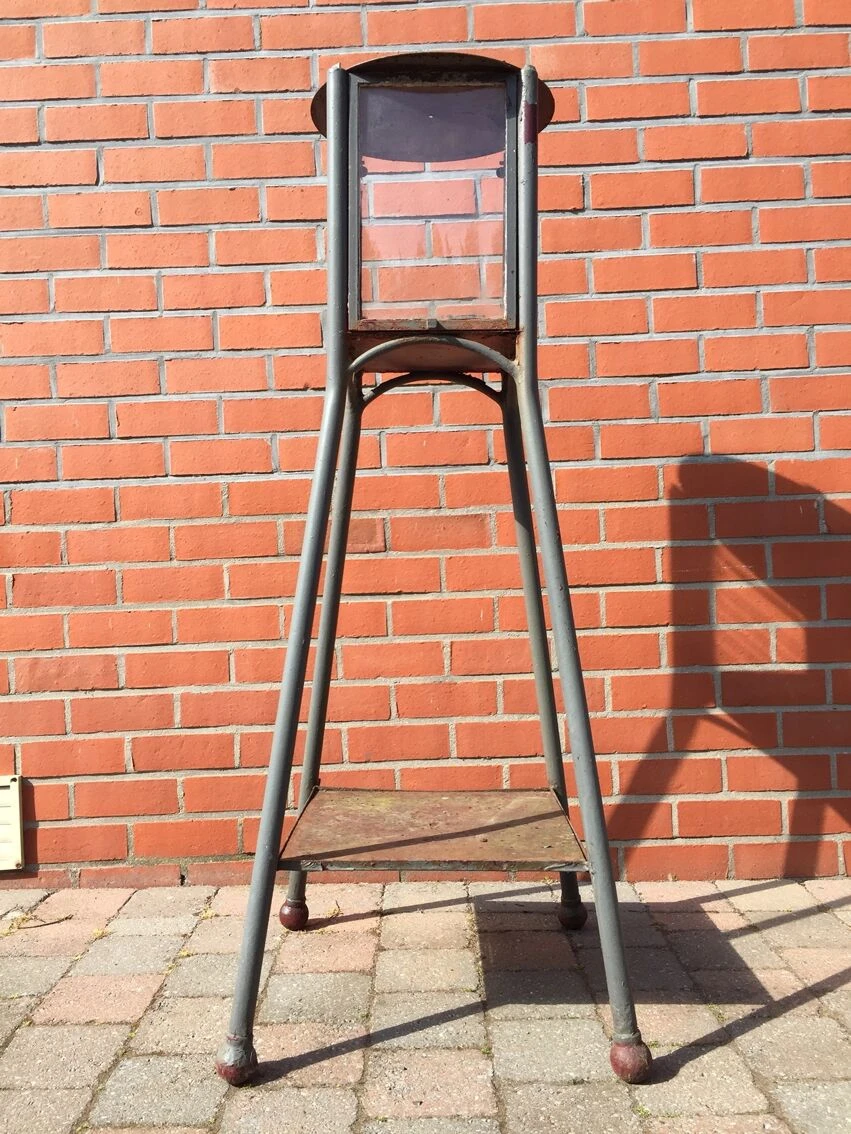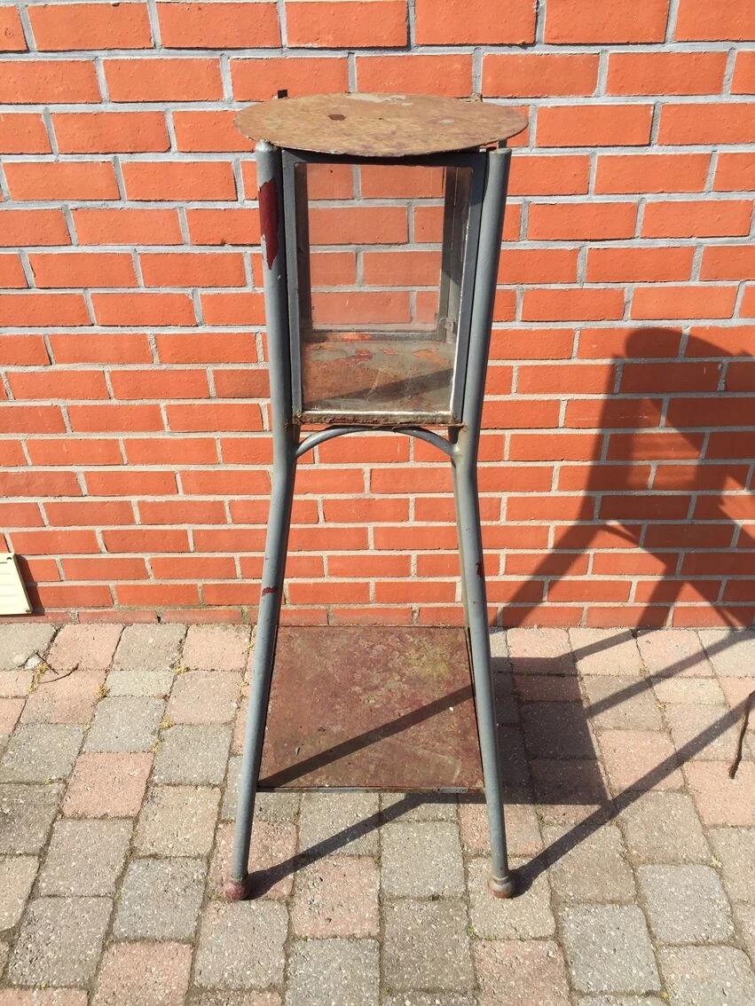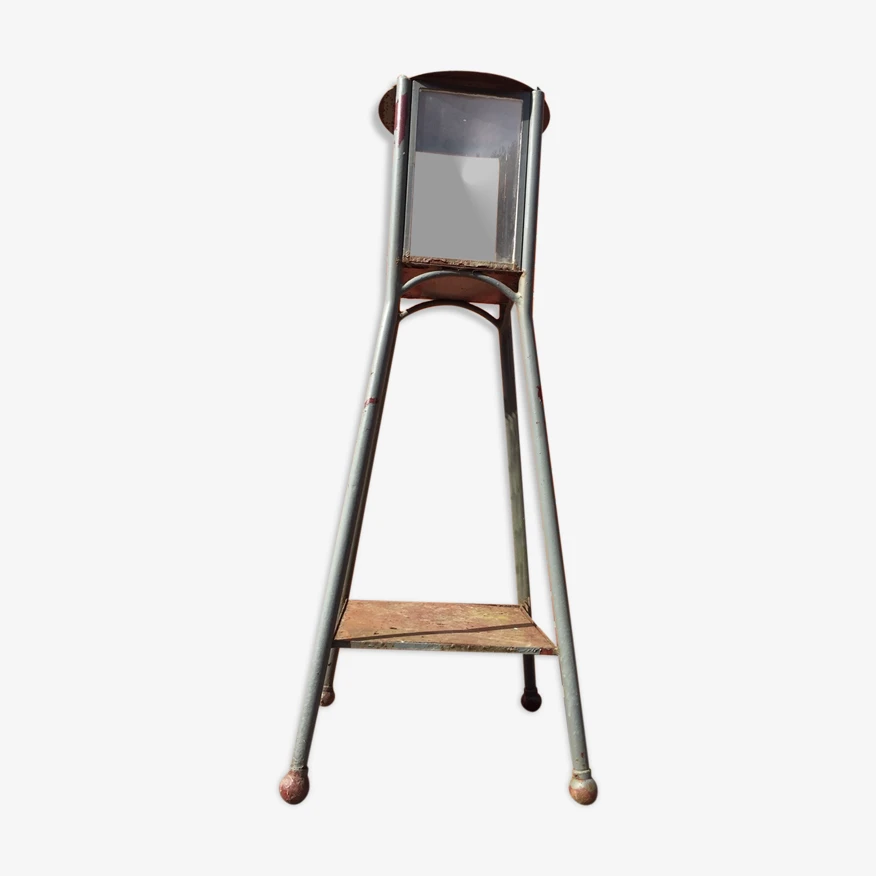 Ancien et rare photophore lanterne sur pied pour exterieur année 60 celui ci a été repeint en gris, sa couleur d origine est couleur rouille voir photo ou la peinture se détache, il, manque une des vitre et une autre a un petit eclat (voir photos) superbe objet assez lourd car en metal plein tres décoratif dans un jardin ou sur une terrasse.