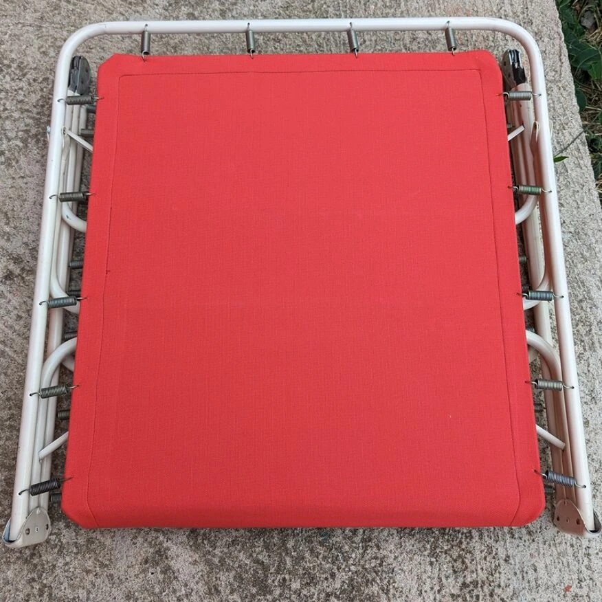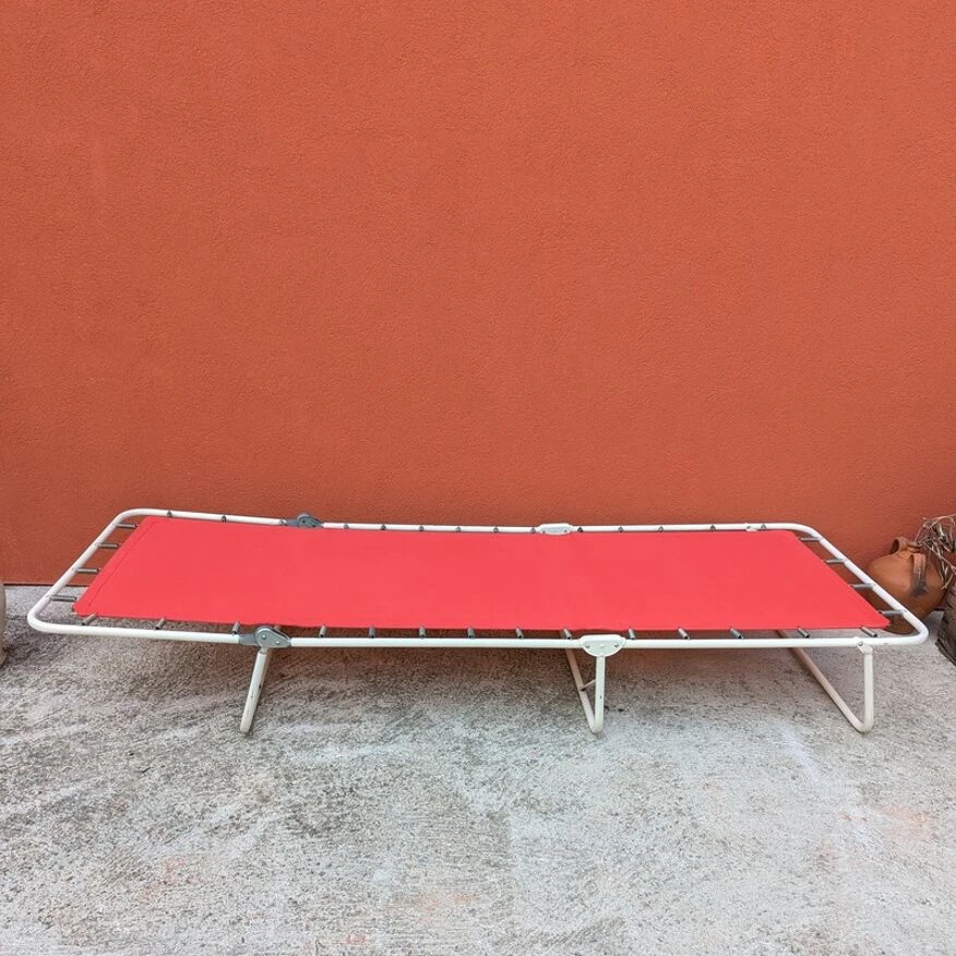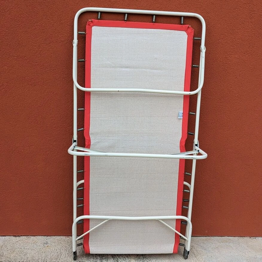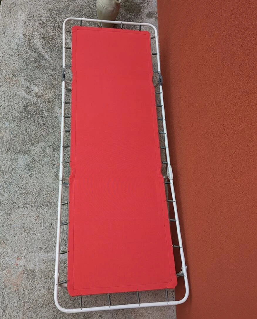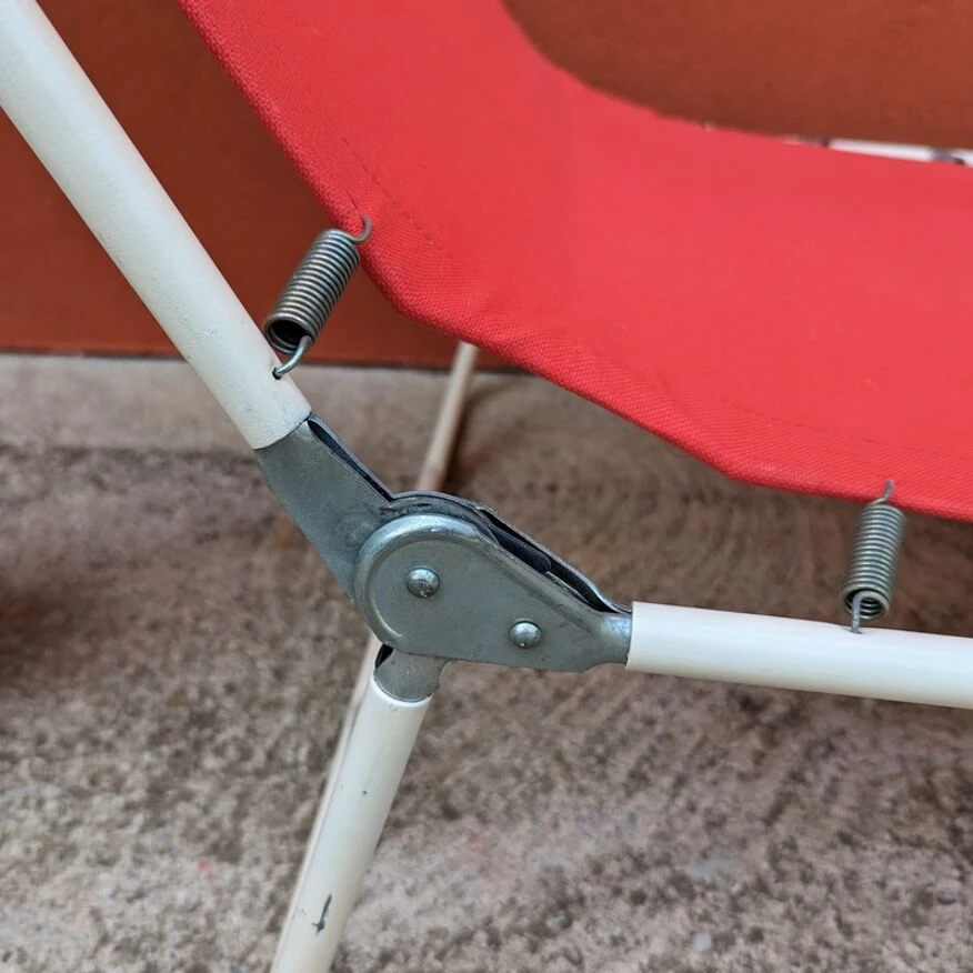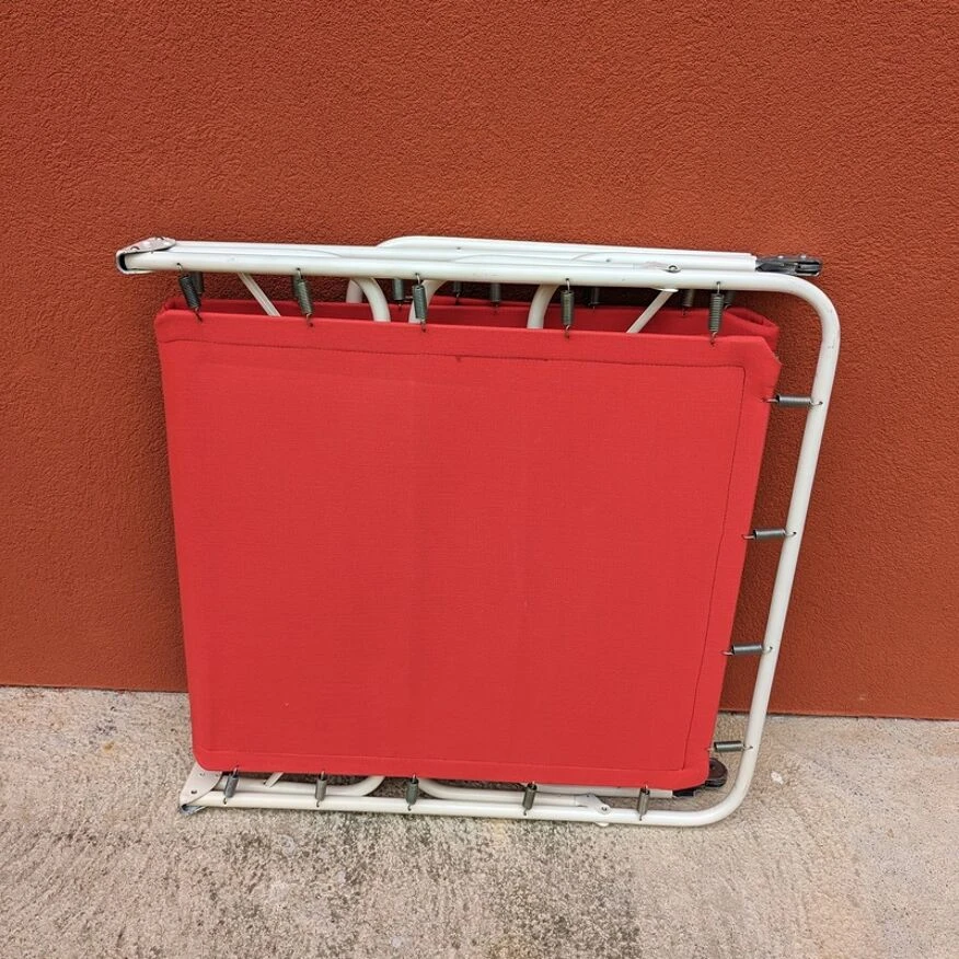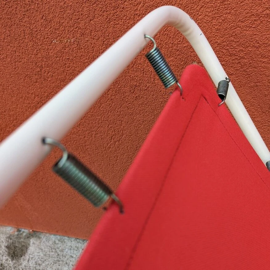La structure est en métal blanc laqué, la toile rouge est en laine de cellulose, elle est maintenue par des ressorts.