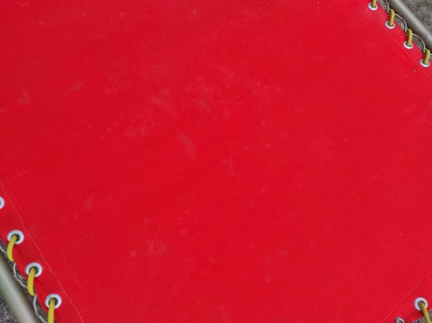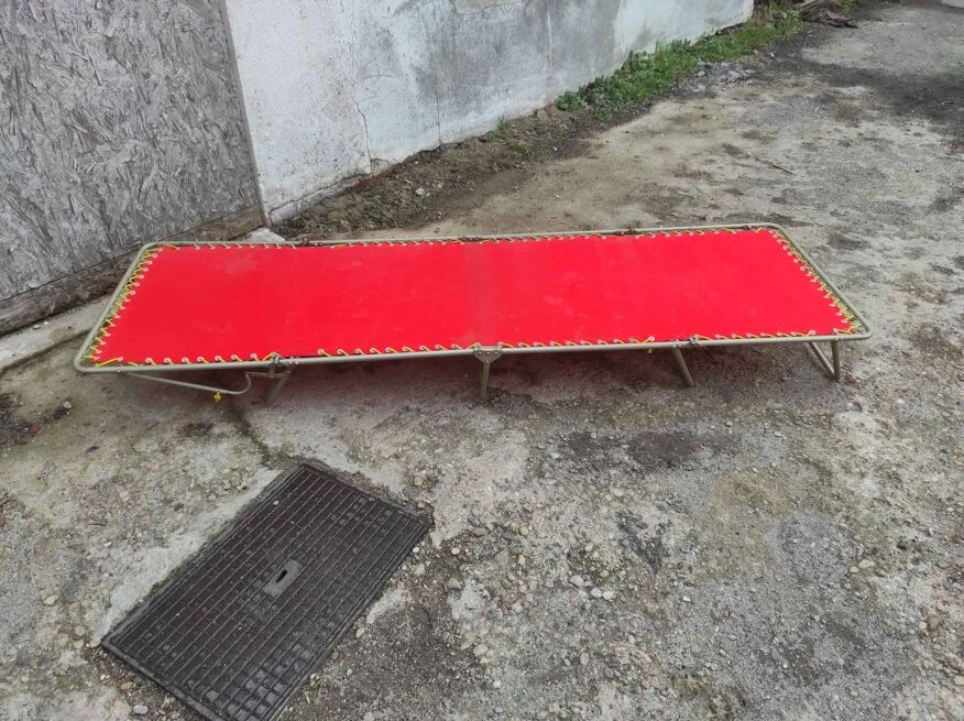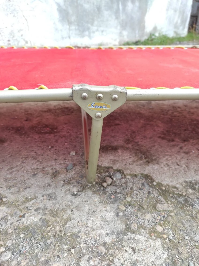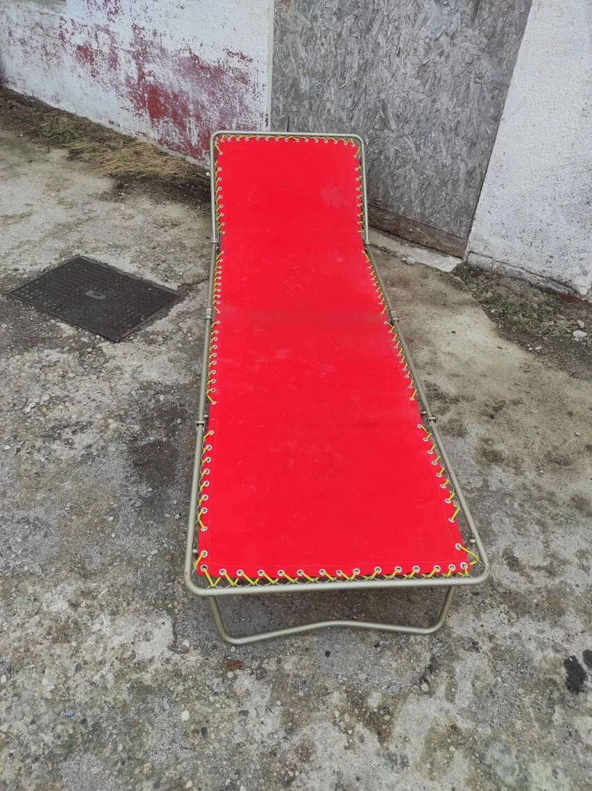 Beau lit de camp pliant vintage de la marque samti d’une belle toile rouge.