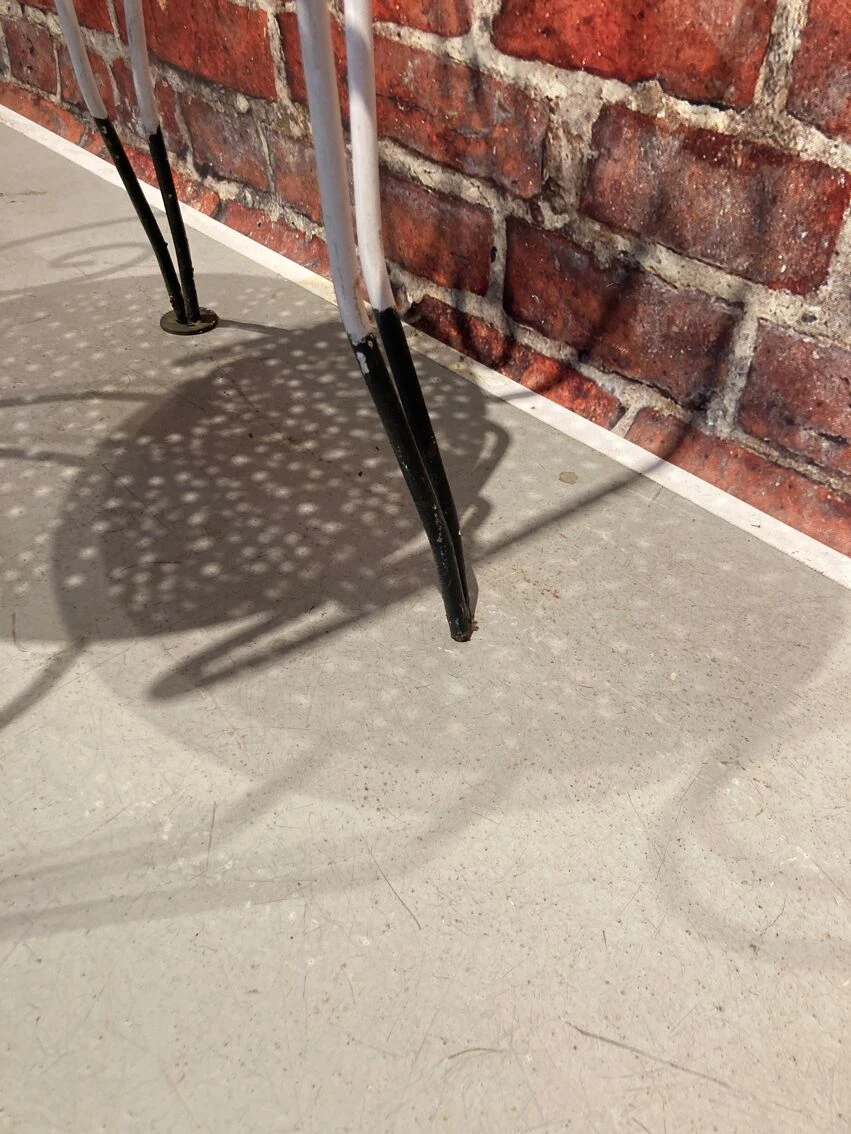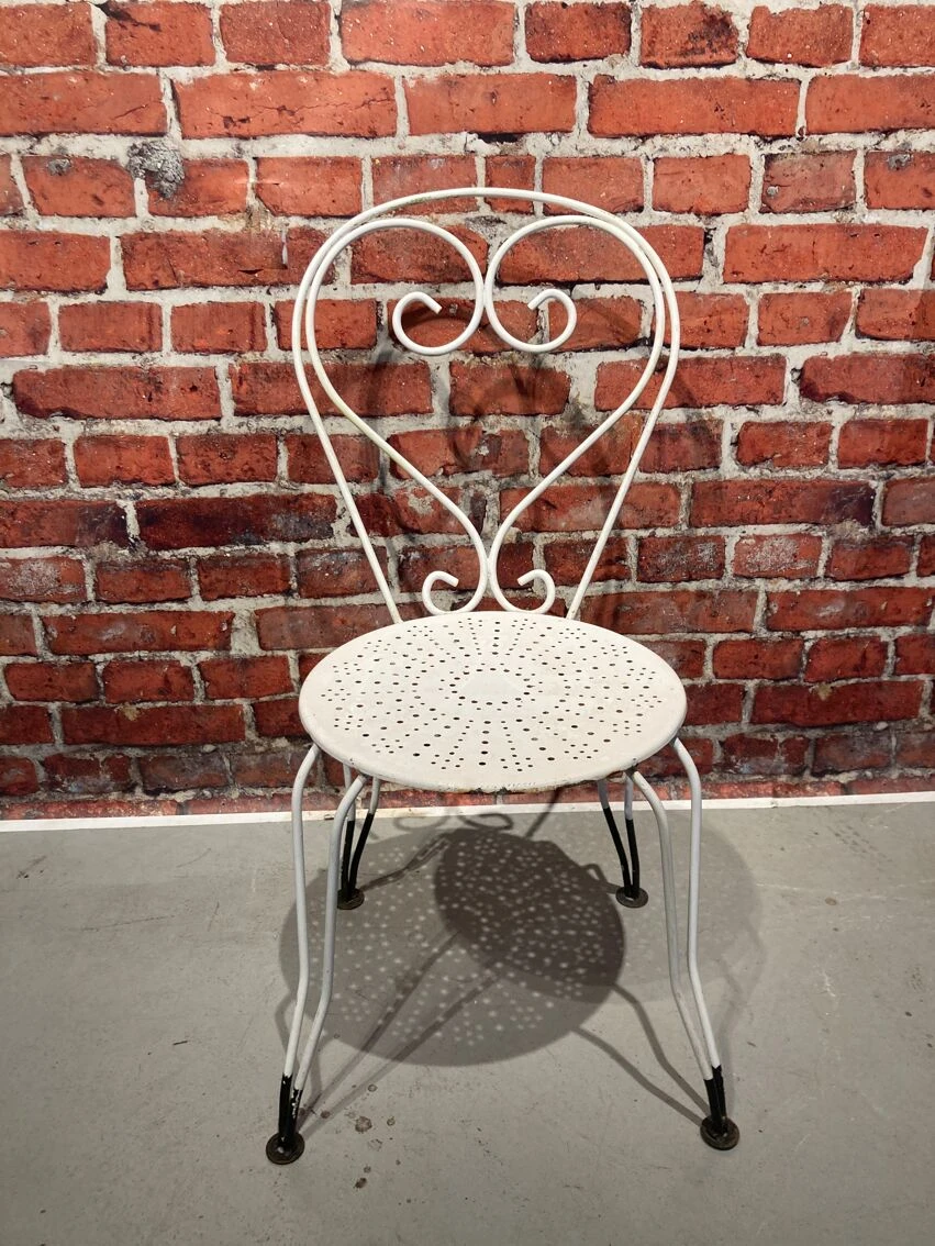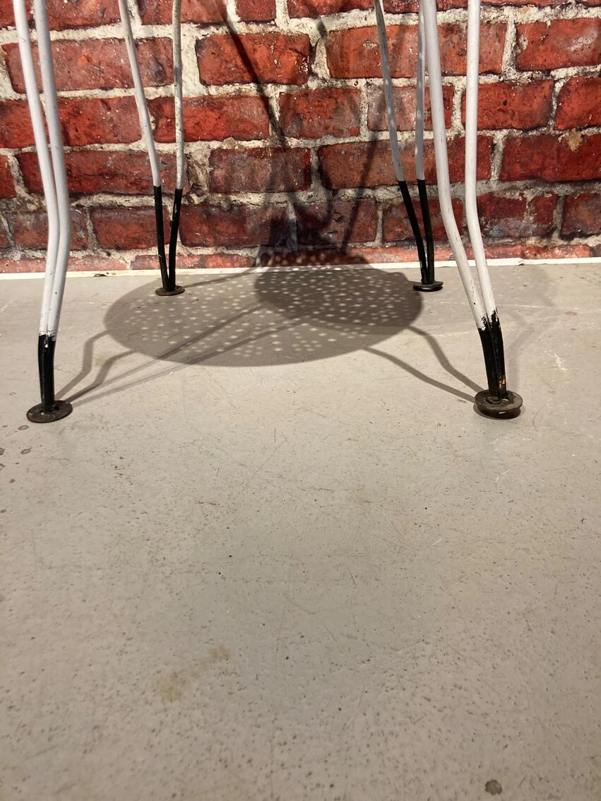 Plusieurs défauts sont présents: tâches de rouille, manque de peinture, manque d’une platine sous un pied, un côté de dossier est dessoudé, une chaise est bancale.
