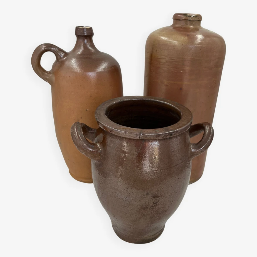 Superbe lot de 3 terres cuites se compose d’une bouteille de 40 cm de haut sur 18 cm de diamètre, une bouteille avec anse 37 cm de haut sur 13 cm de diamètre et pot avec deux anses de 26 cm de haut sur 15 cm de diamètre.