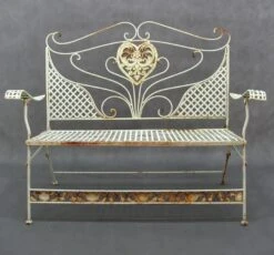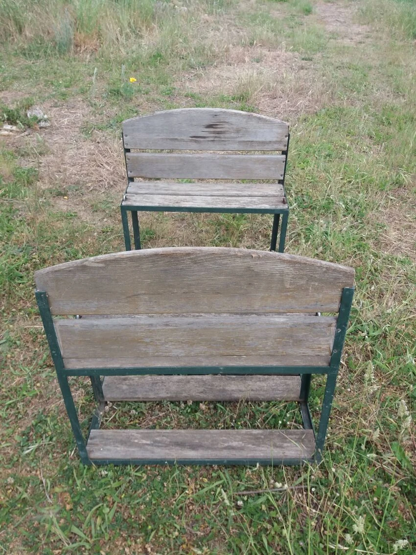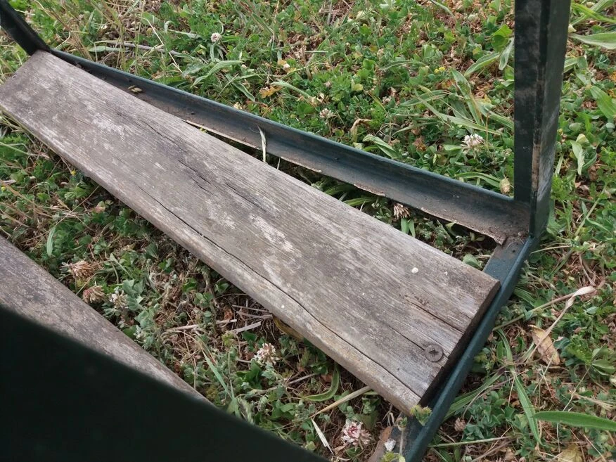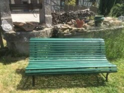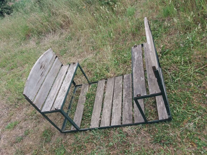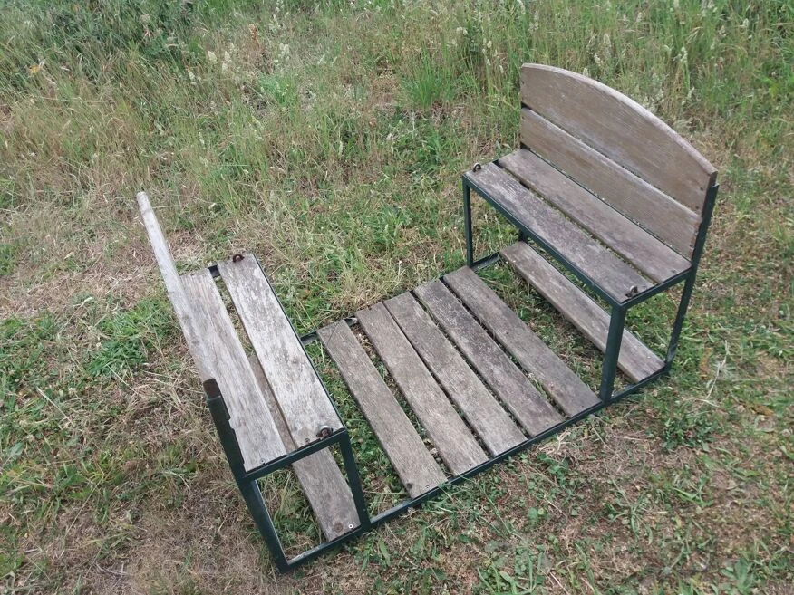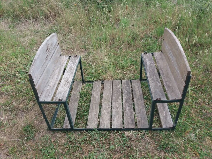 Mais avant cela, il lui faut effectivement une restauration : une petite fissure à souder sur le montant en fer d’un des dossiers et quelques planches de bois du plancher à refixer voire à poncer, peindre, ou changer si l’aspect qu’elles ont pris, après surement des années dehors, ne vous convient pas.