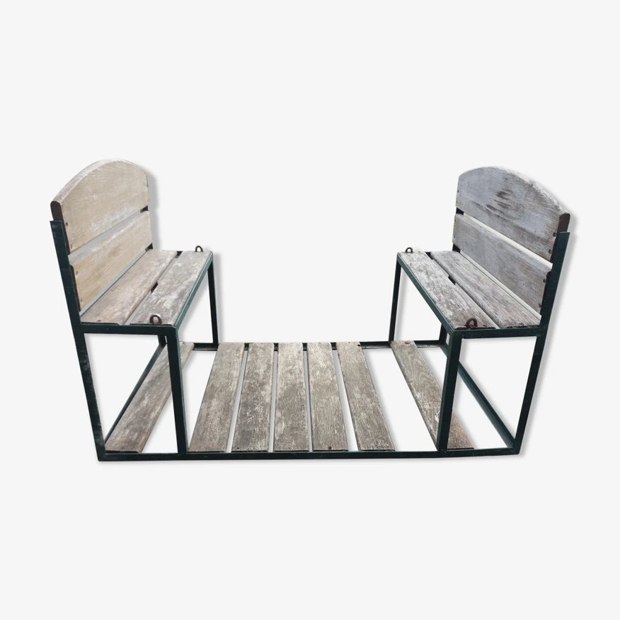 Jolie et rare nacelle de balançoire dans un style industriel, avec ses planches de bois patiné sur une structure en métal peint en vert.