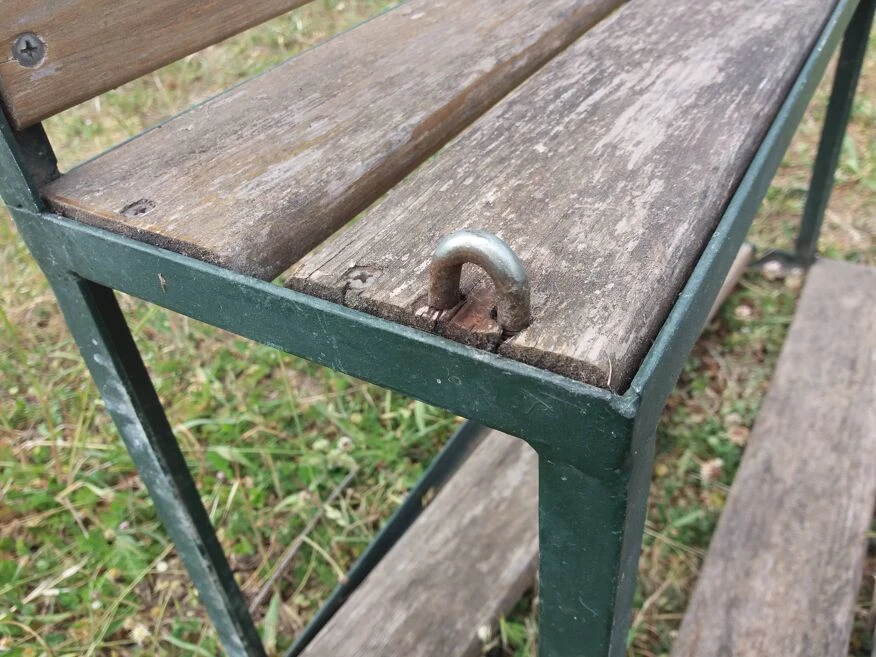 Les 4 « anneaux » de fixation (en u renversé) sont insérés et soudés directement sur le cadre métallique, sous la planche d’assise, ils me paraissent encore bien solides.