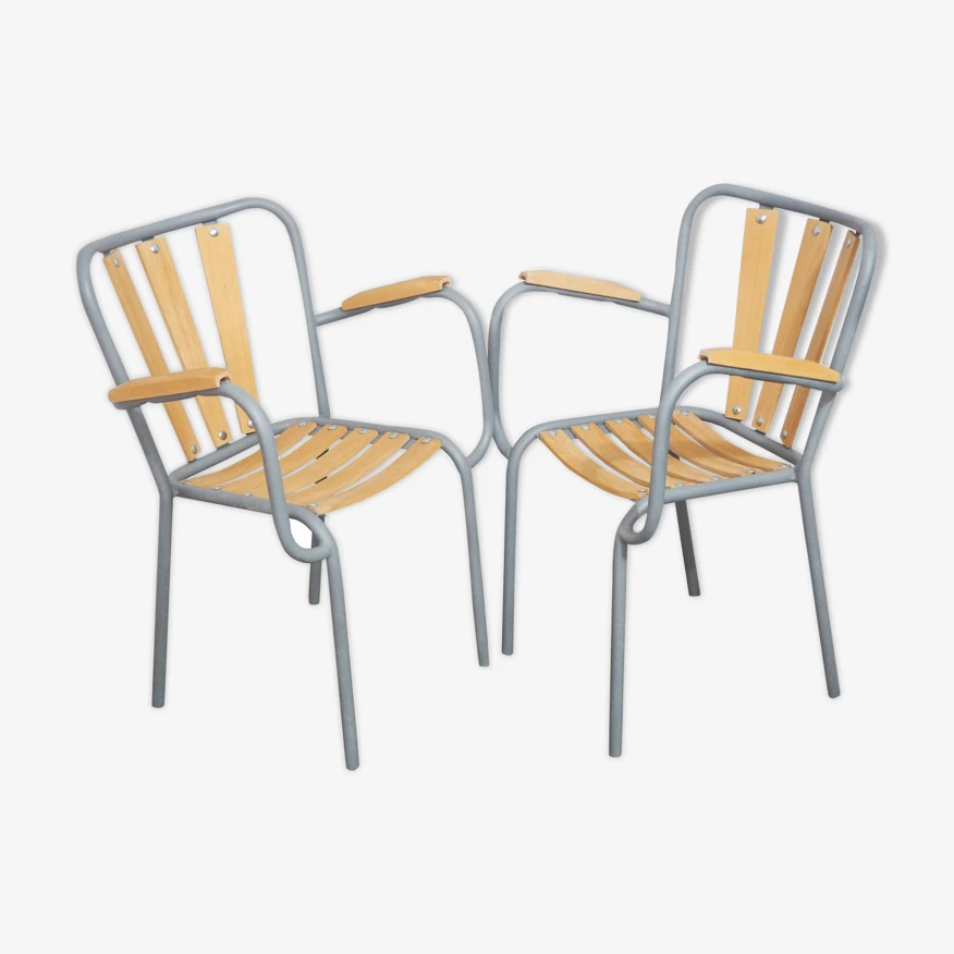 Paire de chaises – fauteuils années 60 entièrement rénovées, en acier repeint gris clair et bois poncé et vernis mat.