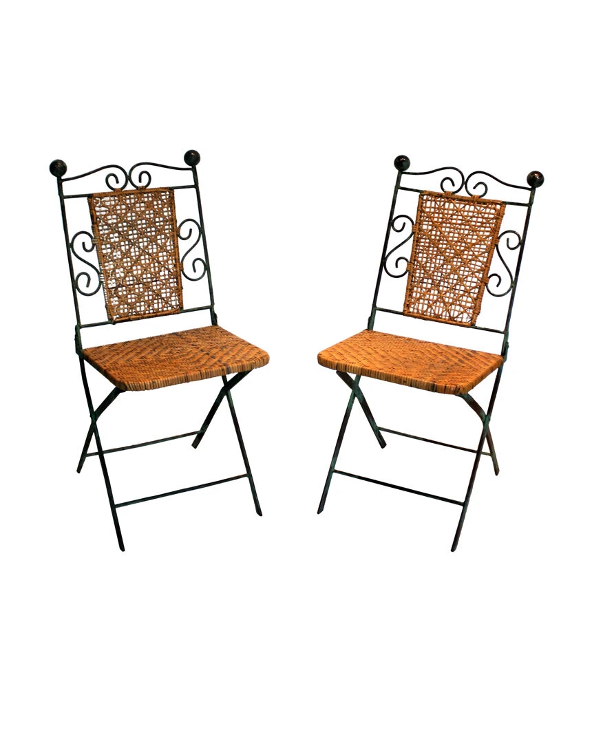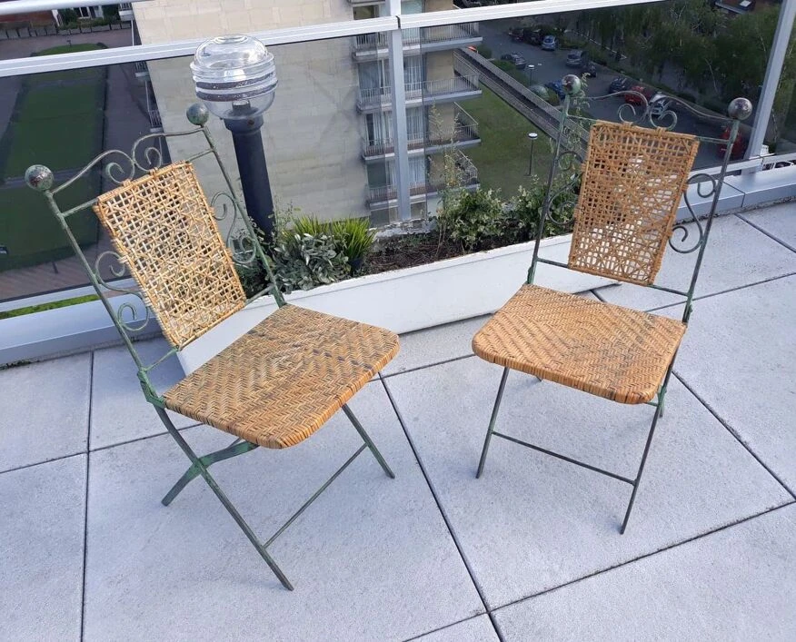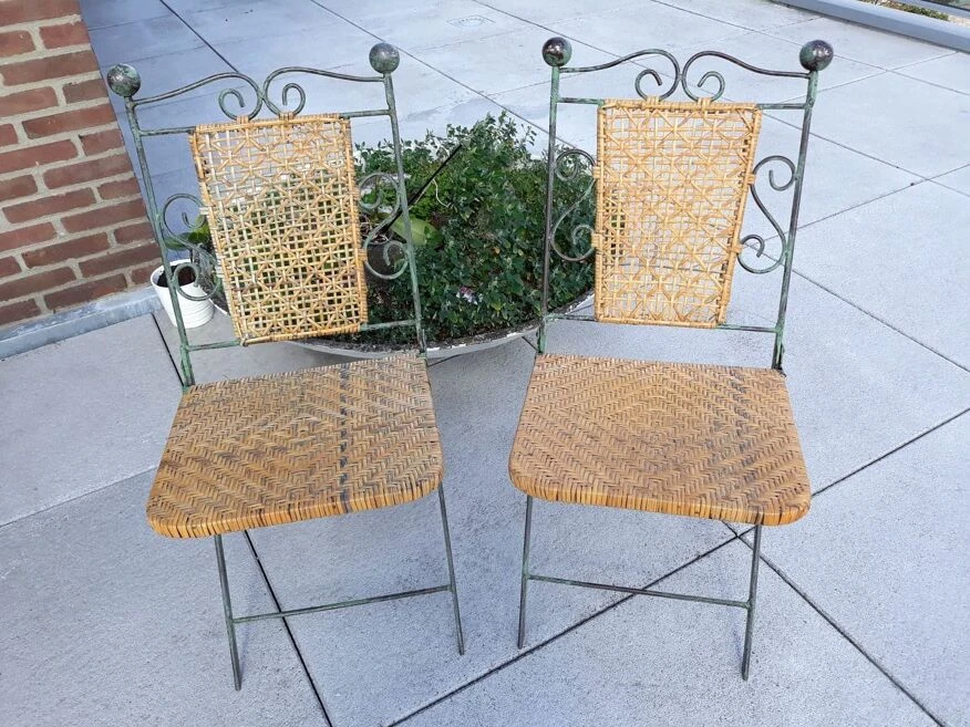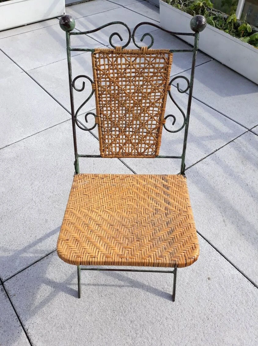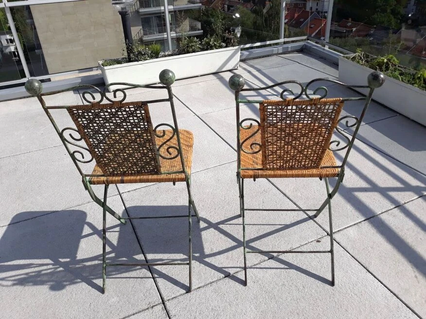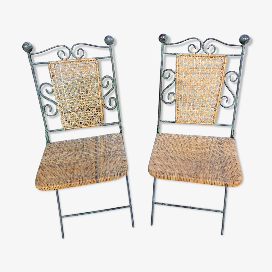 Élégantes et originales paire de chaises pliables en fer forgé, assise et dossier en rotin.