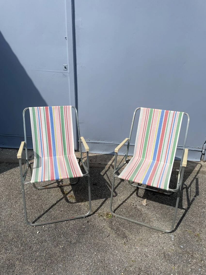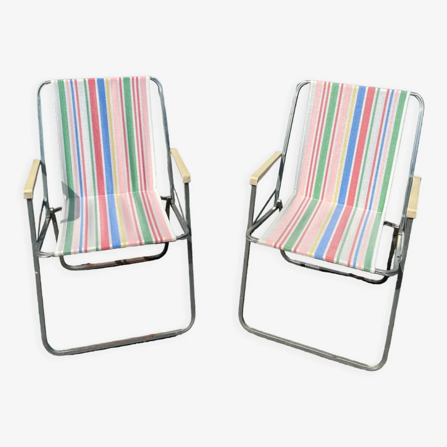 Paire de fauteuil pliant des années 70 en métal et tissu bayadère, avec accoudoirs en plastique.