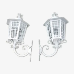 Très jolie et magnifique, paire d’anciennes et grandes lanternes en fer forgé blanc, avec vrai verre transparent. Quelques manques de peinture (voir photos).