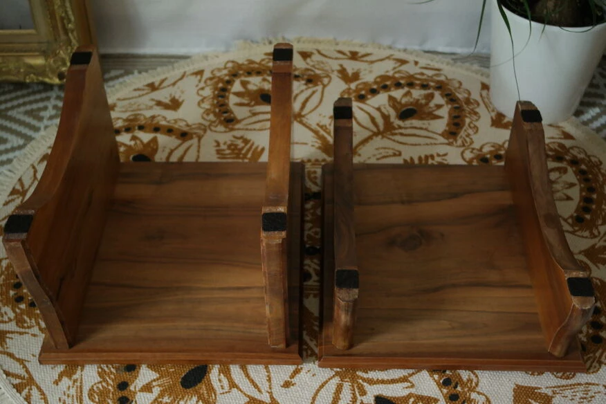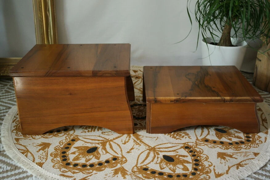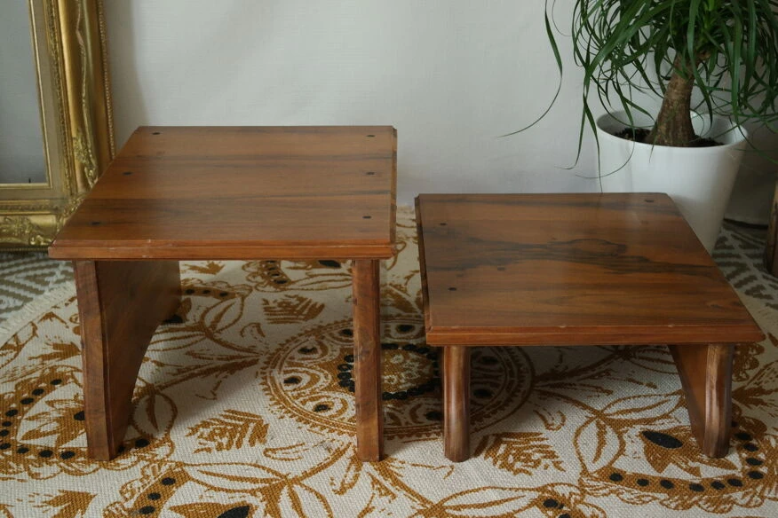 Paire de porte plantes, sellettes, artisanale en noyer massif avec de légères traces d’usure conforme à l’âge et l’utilisation.