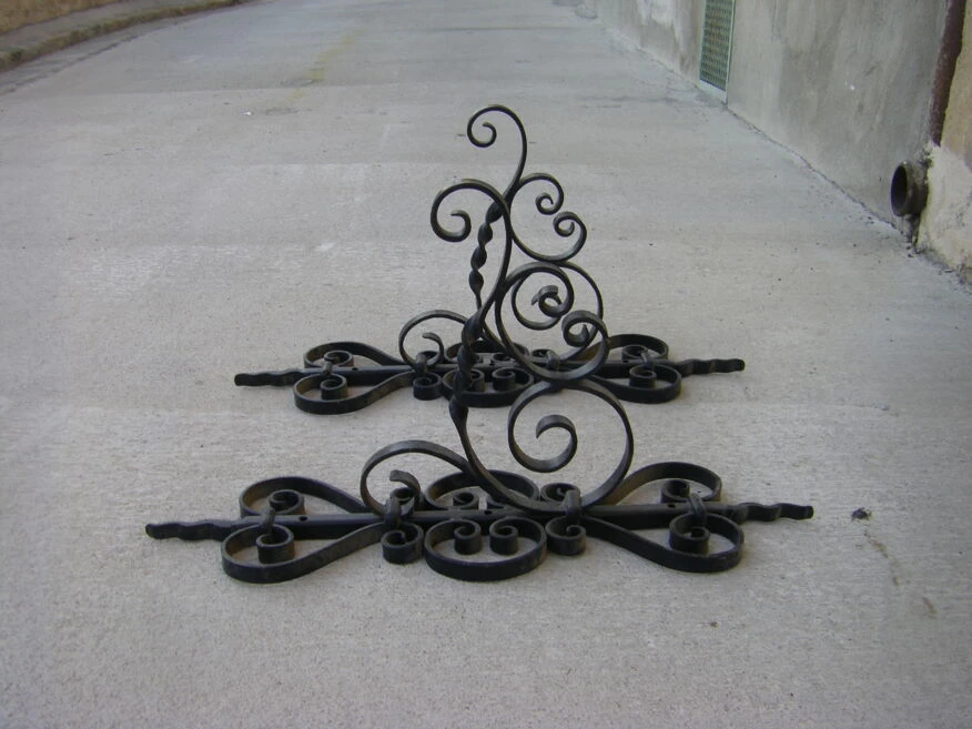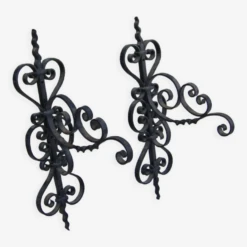 Paire de potences de lanterne de jardin en fer forgé.