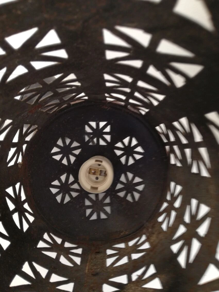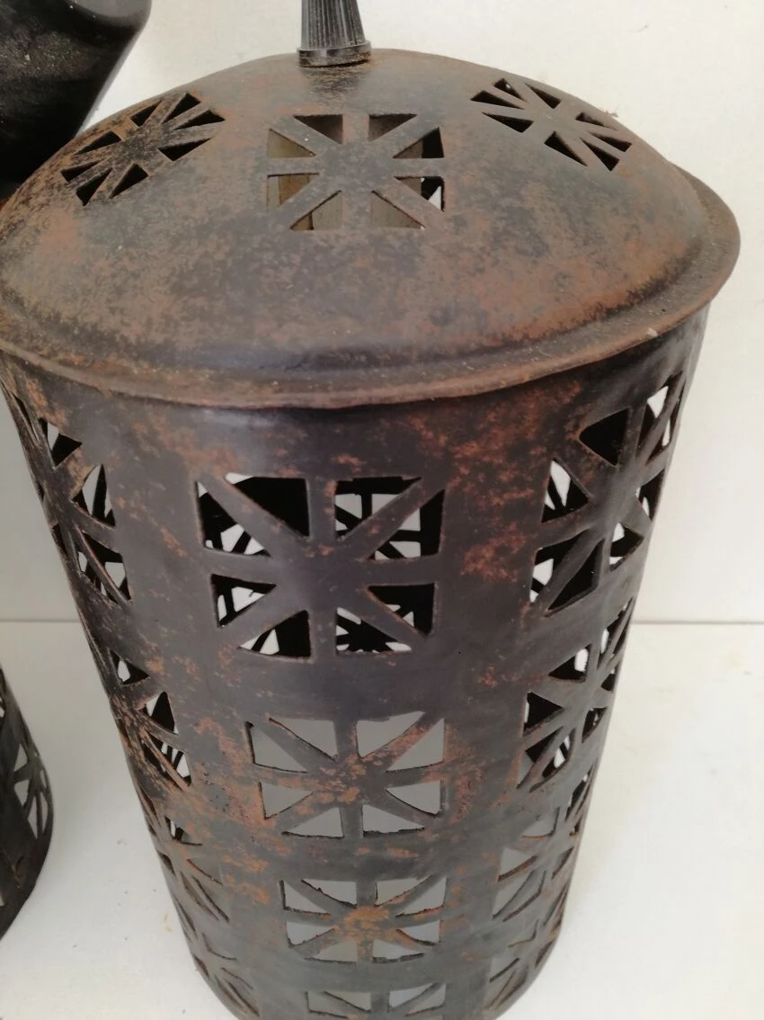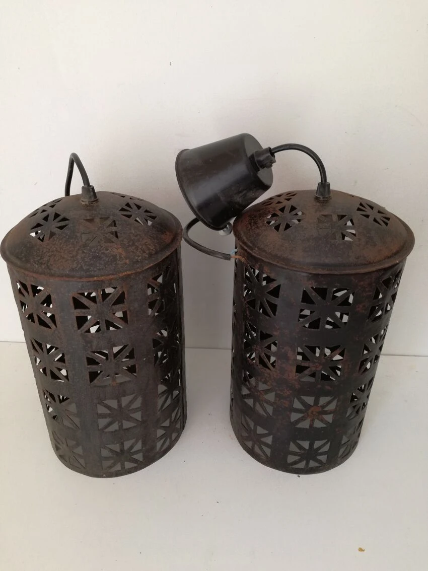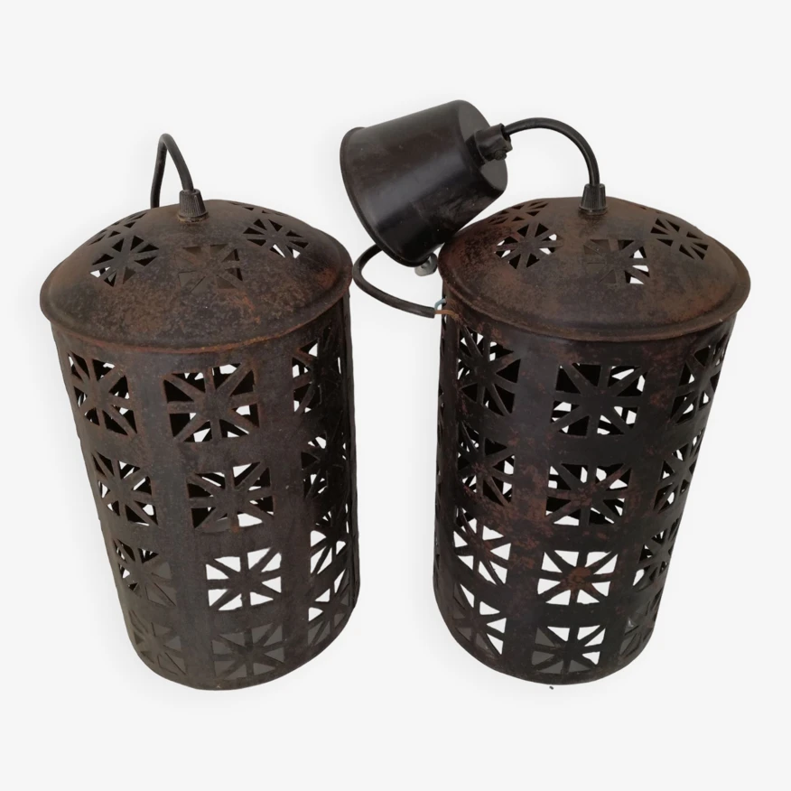 Paire de suspensions en métal ajouré noir, légèrement oxydé (usage en extérieur), un des pavillon en plastique est abimé et à remplacer.