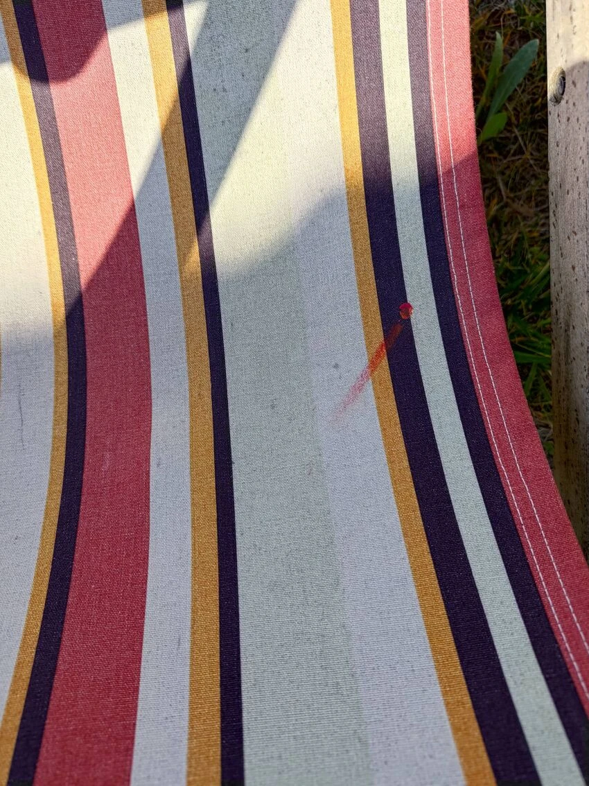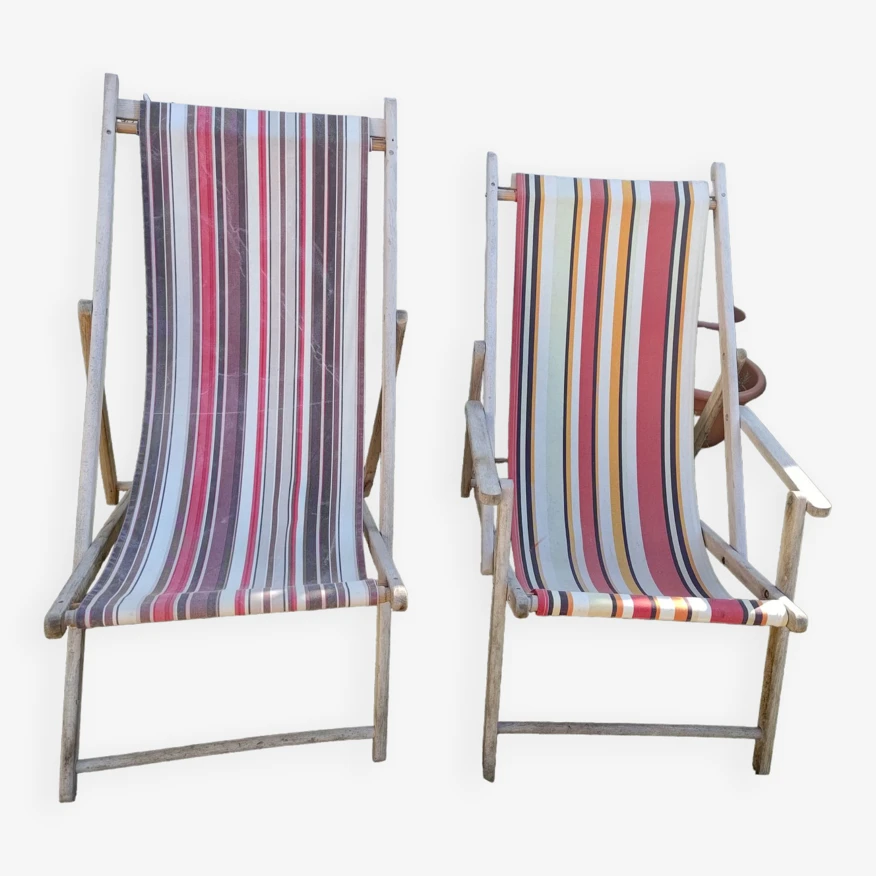 Paire de transats vintage avec toile style pays basque solide aux coloris différents ( quelques tâches d’usage ).