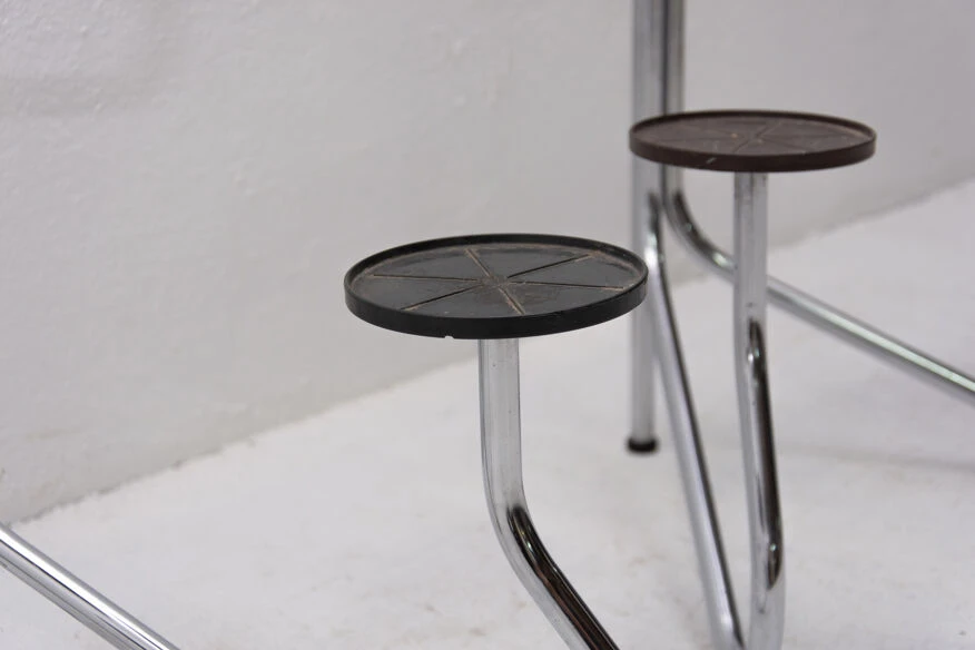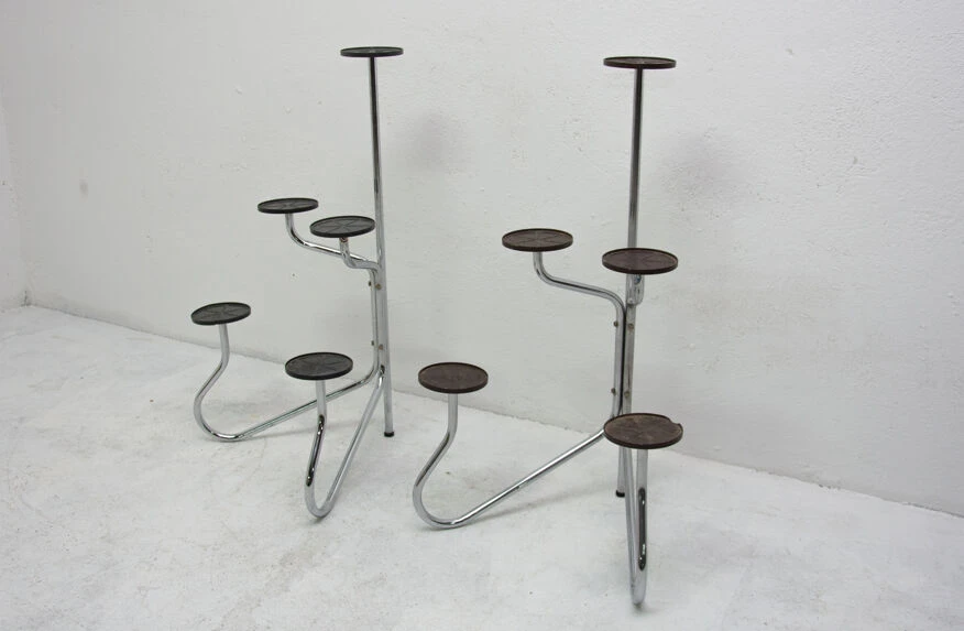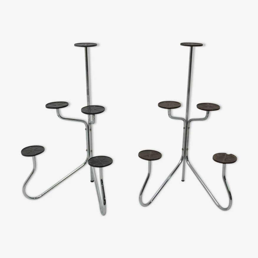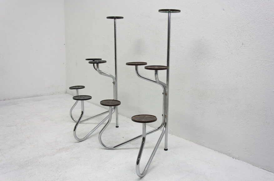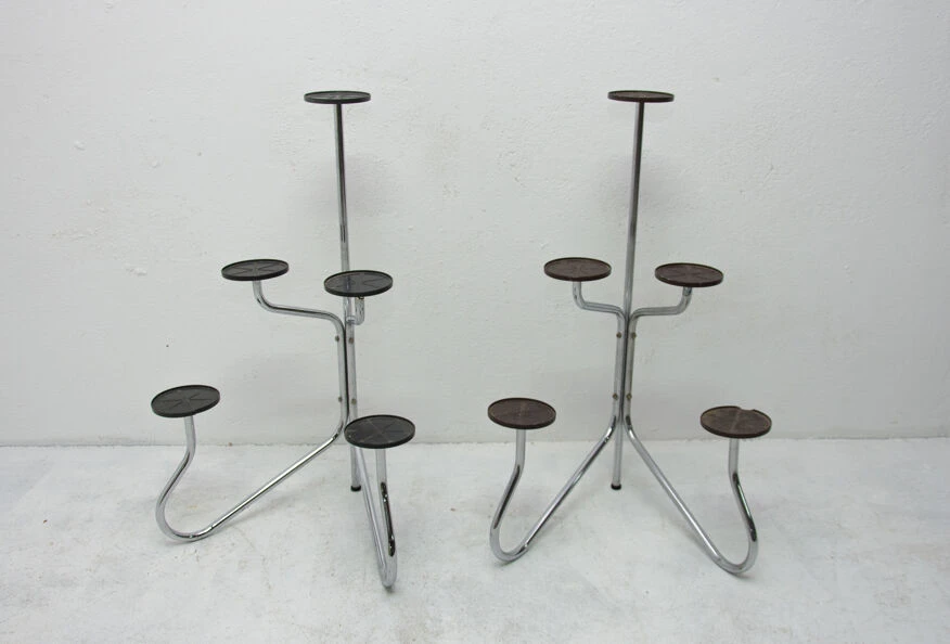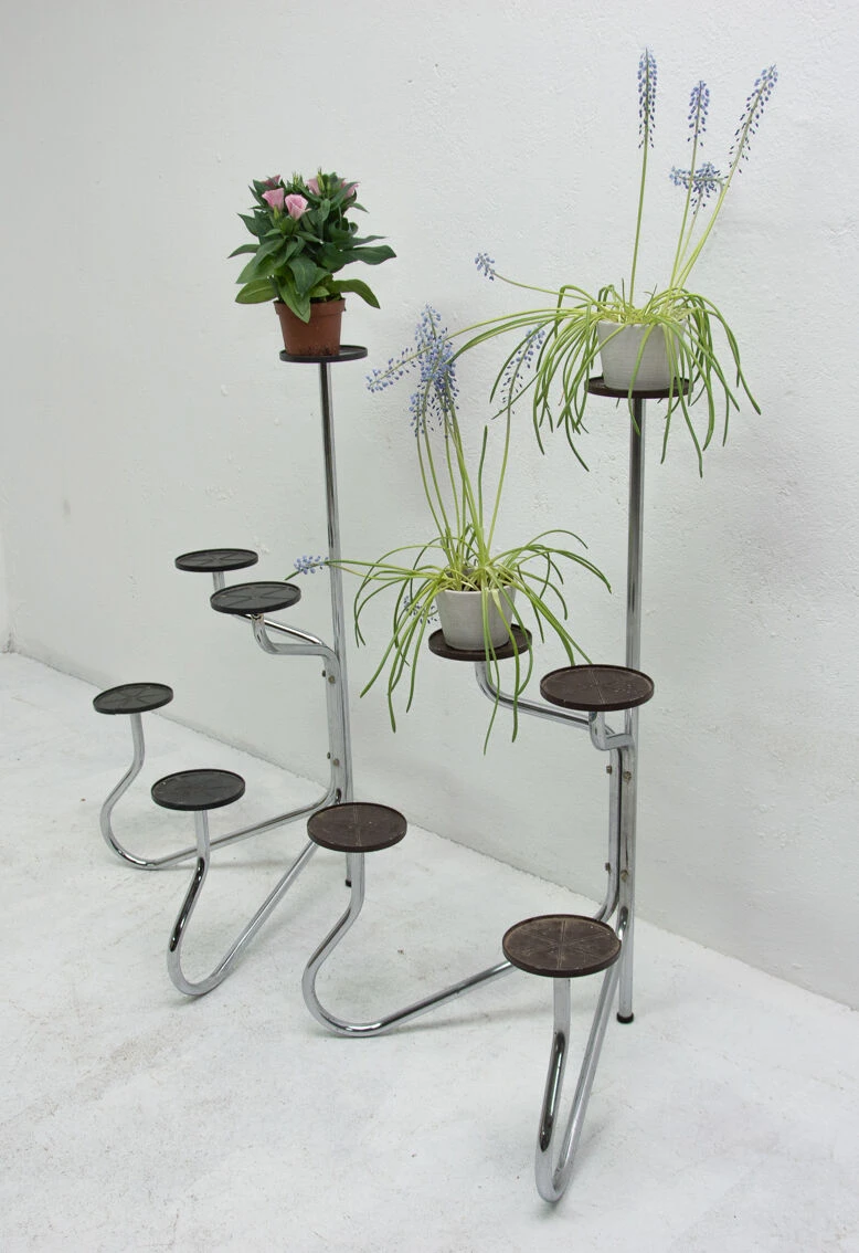Paire de supports de plantes chromés du milieu du siècle. Les stands ont été construits dans l’ancienne Tchécoslovaquie dans les années 1960. Ils se caractérisent par une structure chromée et des plateaux en plastique. Sur un support, une cuvette est partiellement endommagée mais entièrement fonctionnelle – voir photos. Dans l’ensemble, les stands sont en bon état Vintage ainsi que le chrome qui est sans dommage.