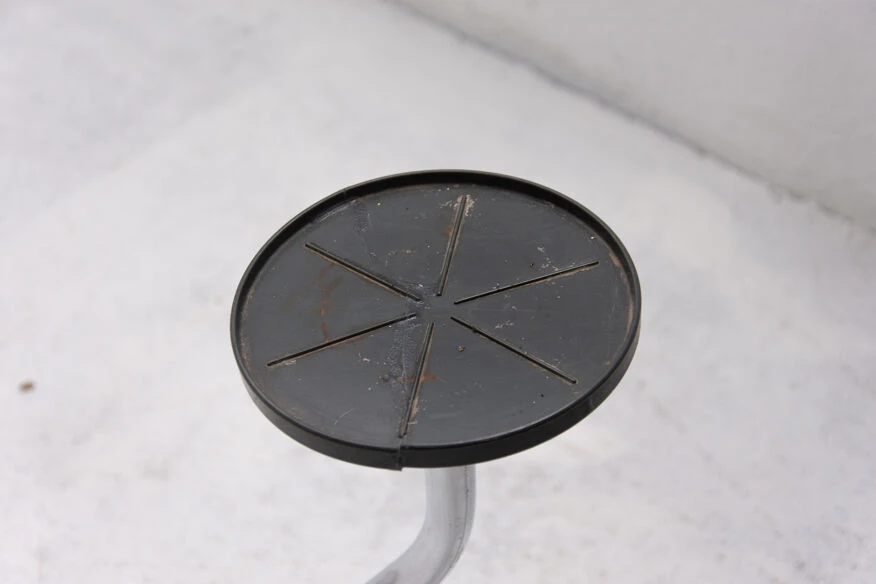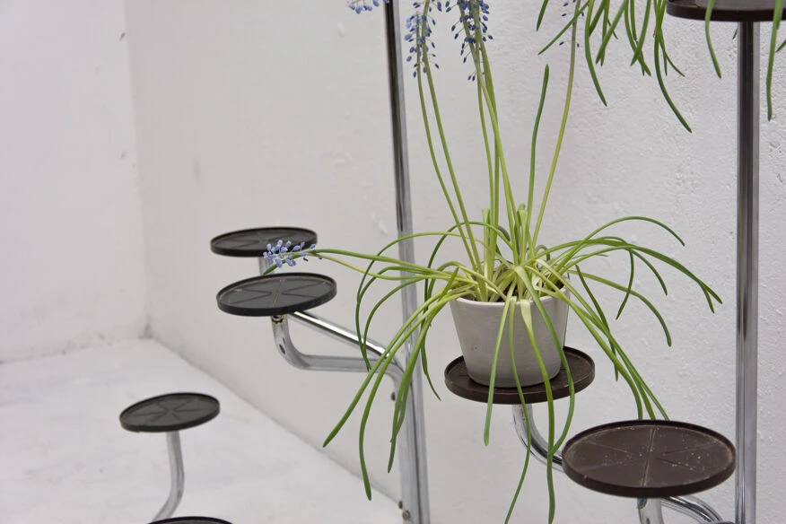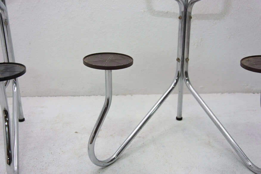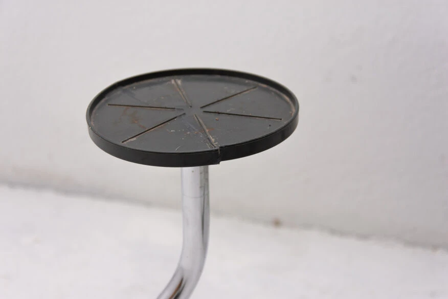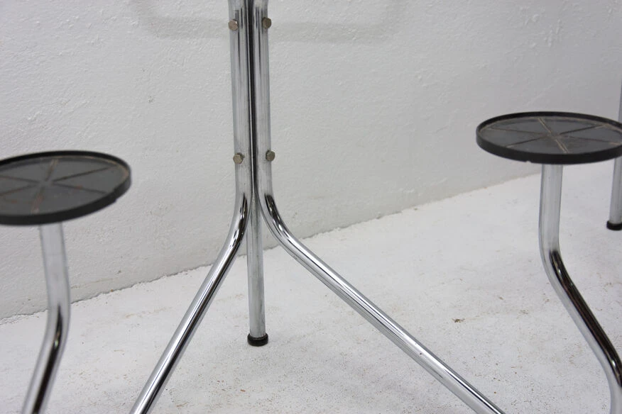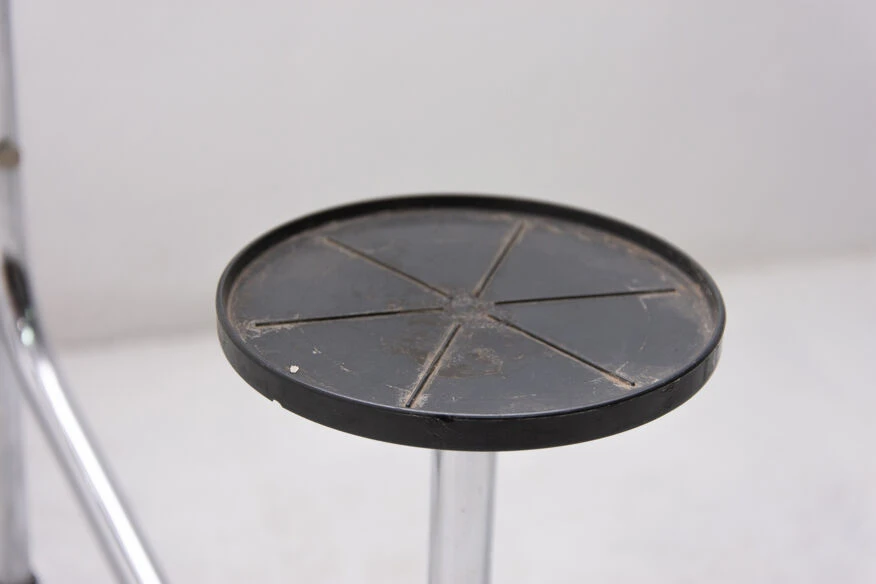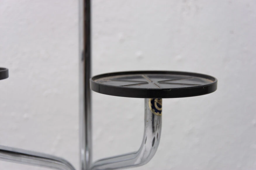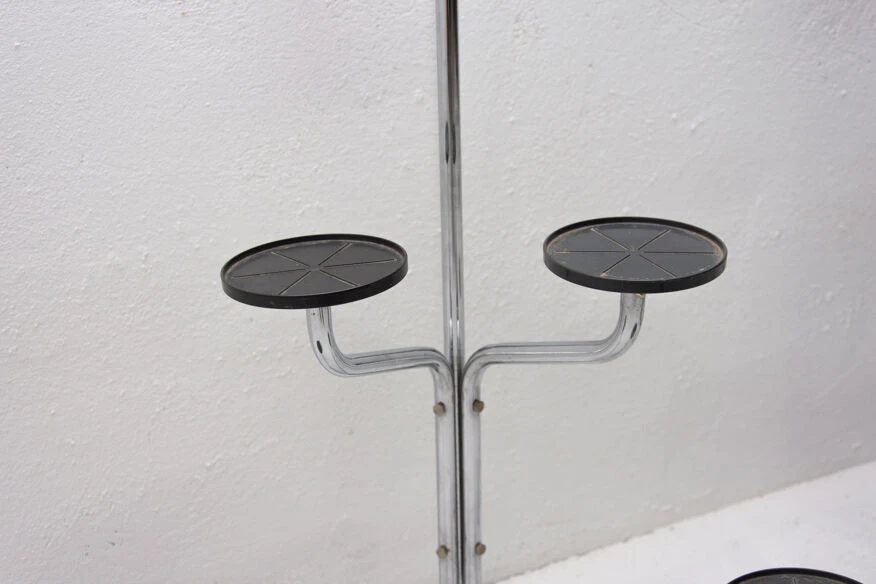 Paire de supports de plantes chromés du milieu du siècle. Les stands ont été construits dans l’ancienne Tchécoslovaquie dans les années 1960. Ils se caractérisent par une structure chromée et des plateaux en plastique. Sur un support, une cuvette est partiellement endommagée mais entièrement fonctionnelle – voir photos. Dans l’ensemble, les stands sont en bon état Vintage ainsi que le chrome qui est sans dommage.