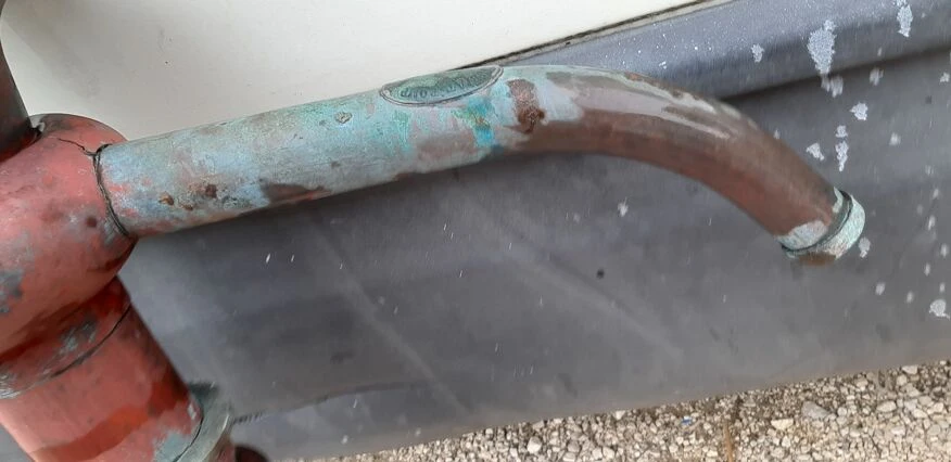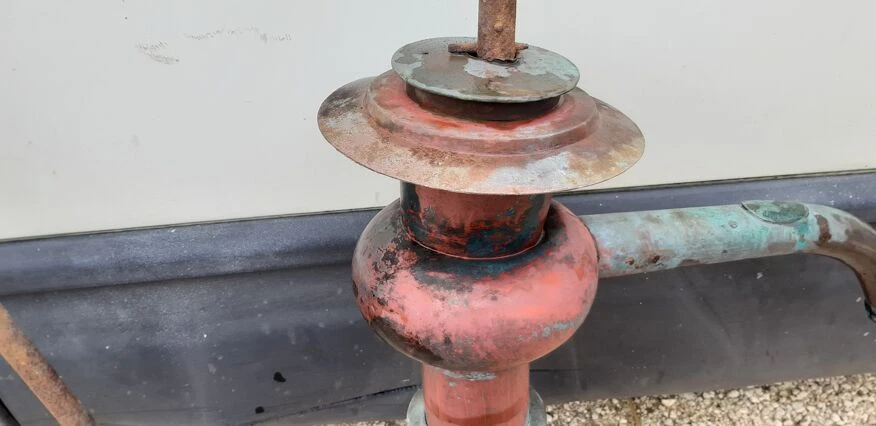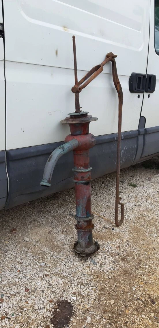 Pompe de puit de jardin en cuivre rouge 19 ème, haut: 150 cm, long et larg: 76 cm sur 21 cm, 11, 5 kg de fer et 16 kg de cuivre.