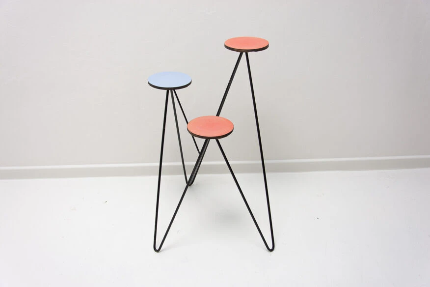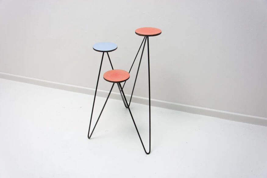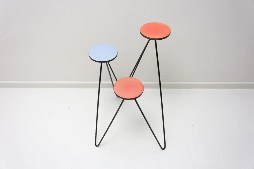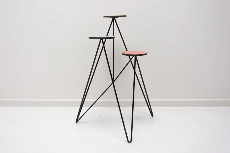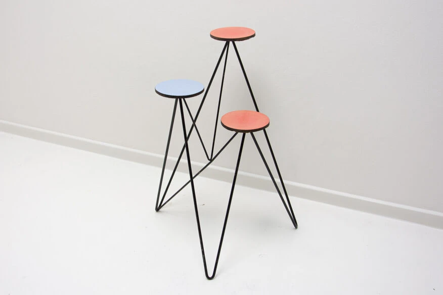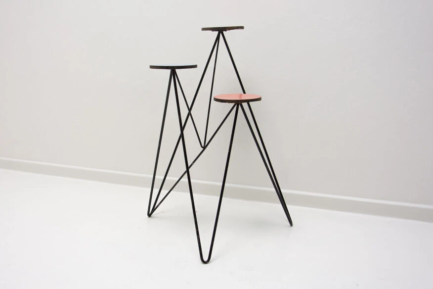 Structure métallique avec plaque de plastique colorée à l’extrémité de chaque bras, trois au total.