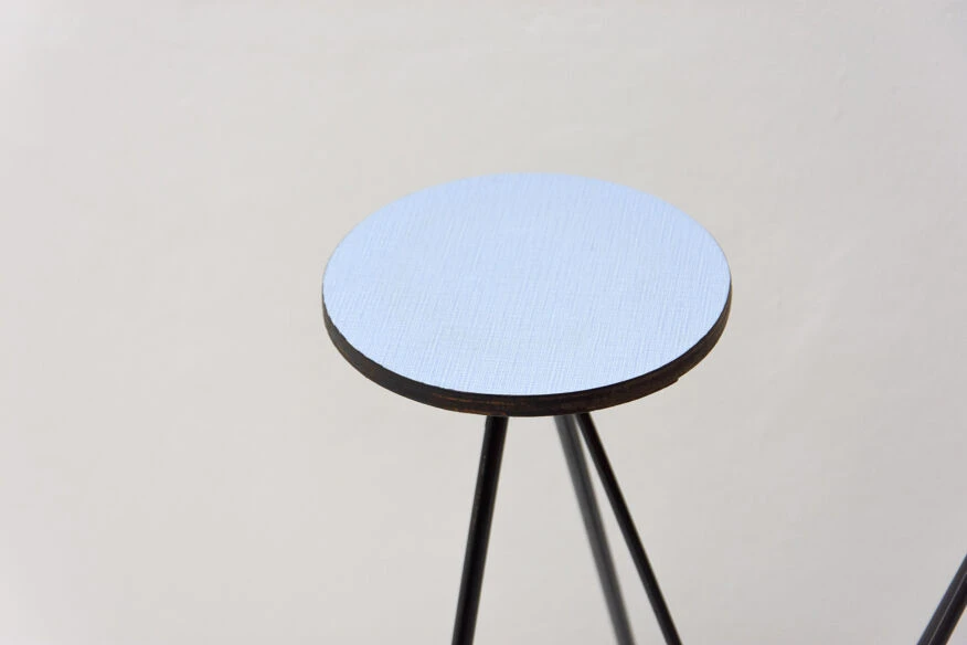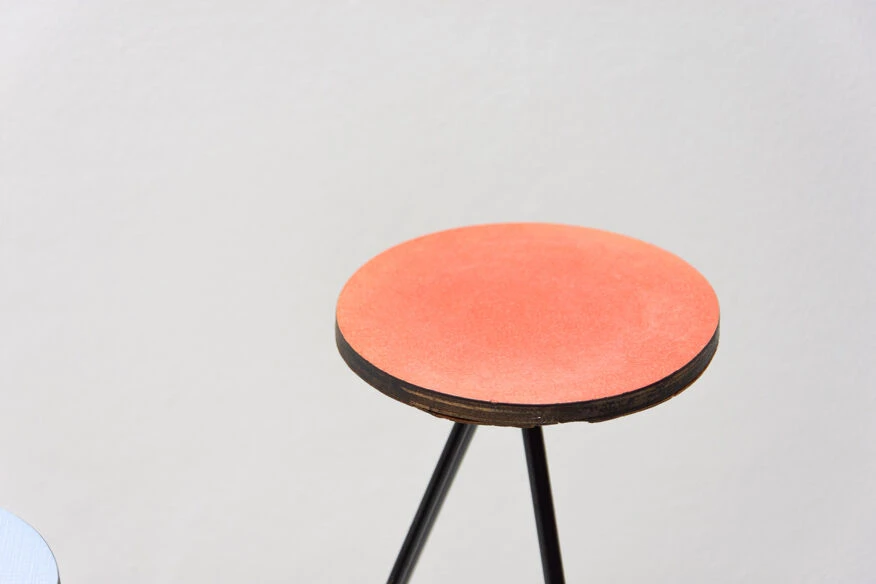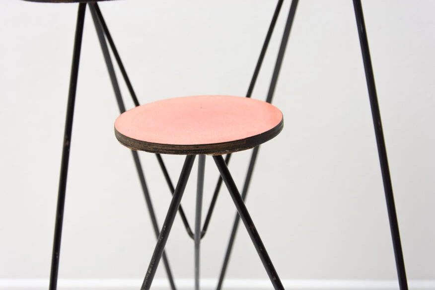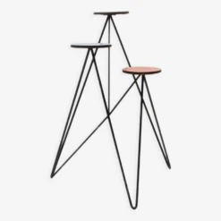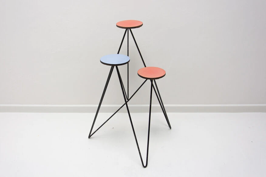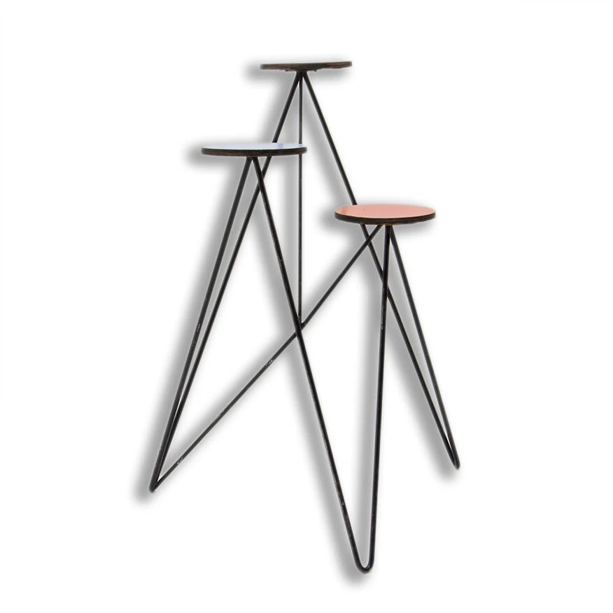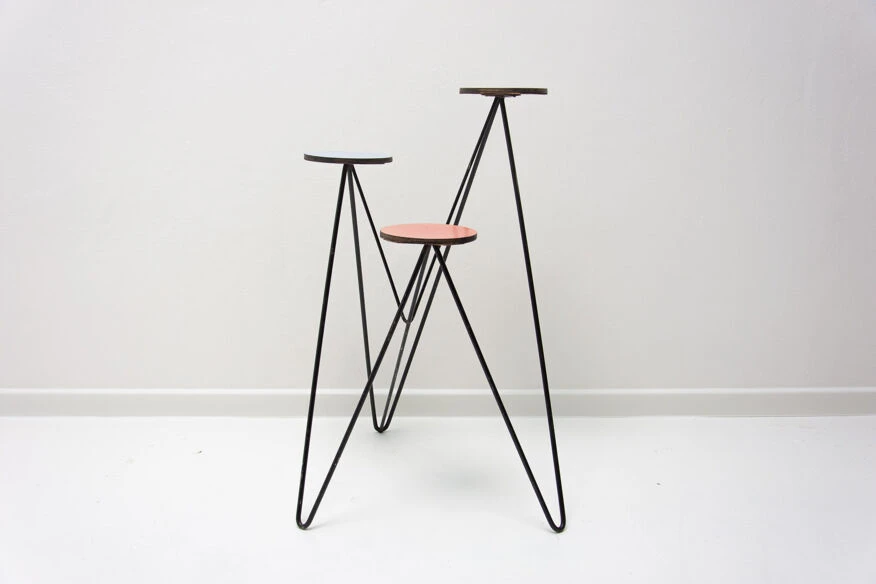 Structure métallique avec plaque de plastique colorée à l’extrémité de chaque bras, trois au total.