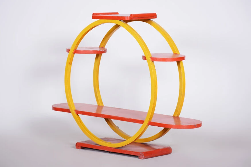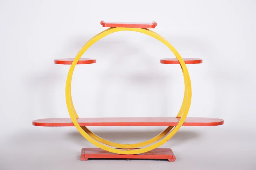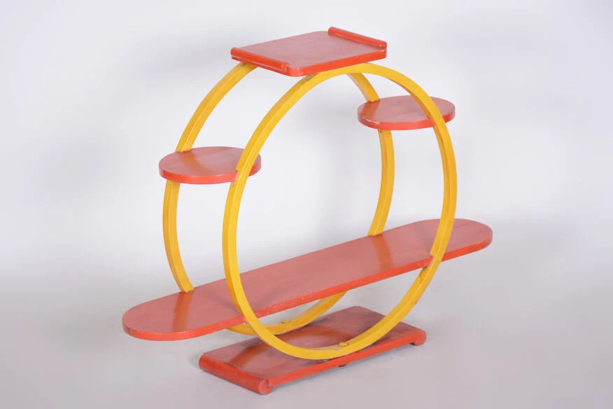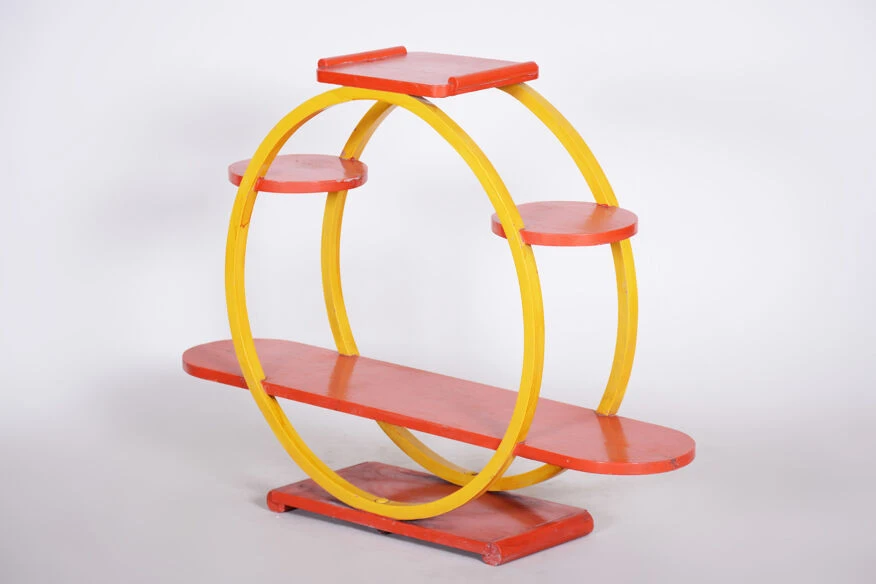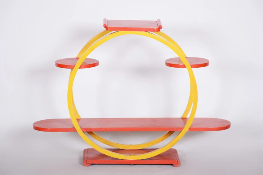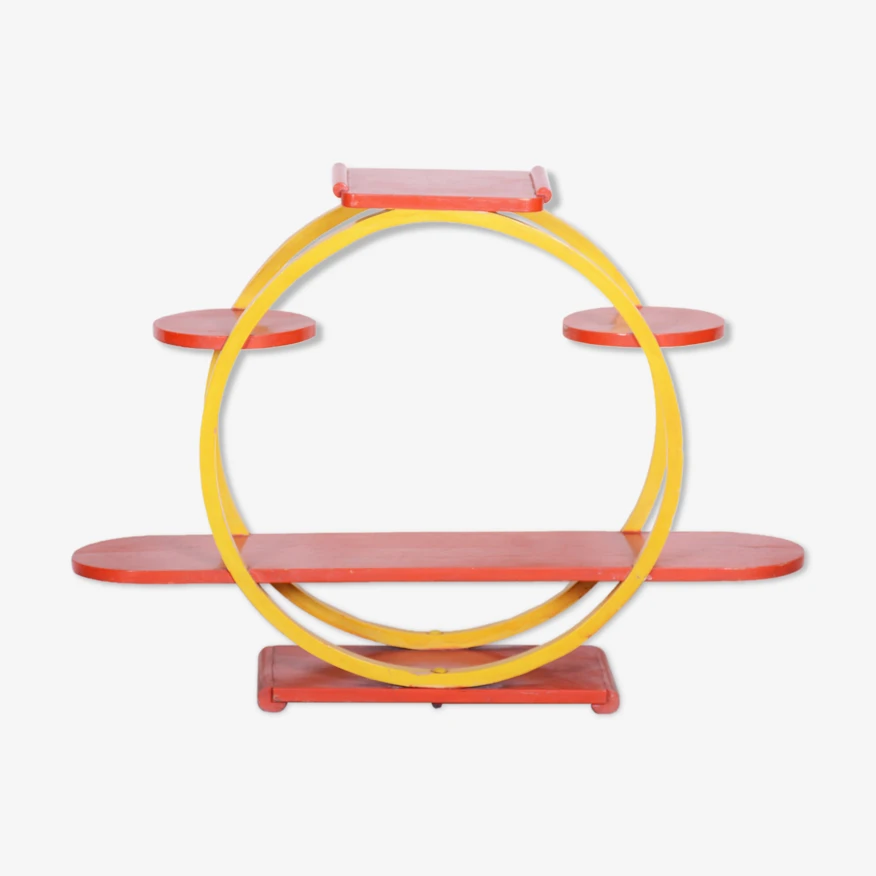 Le stand de fleurs comporte trois petites plates-formes en bois rouge pour les petites plantes et une plus grande au fond.