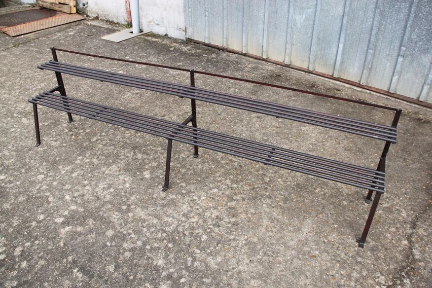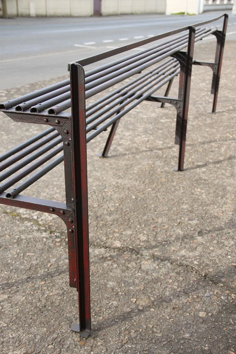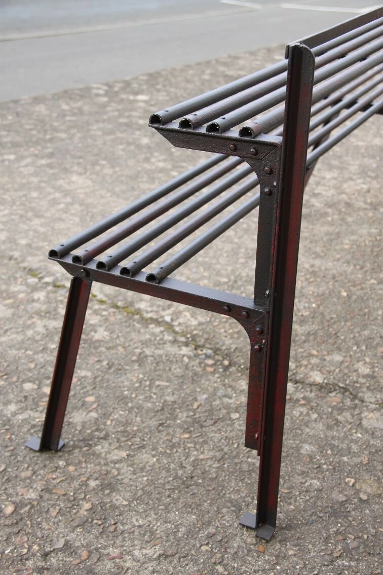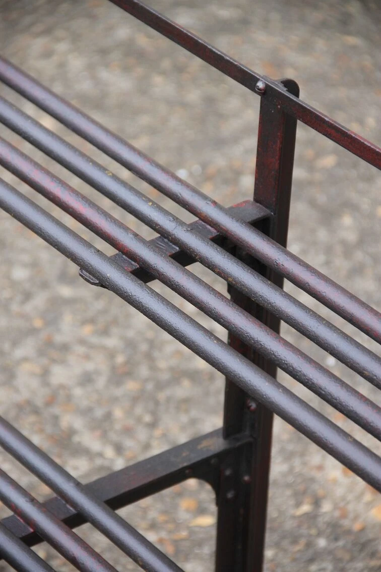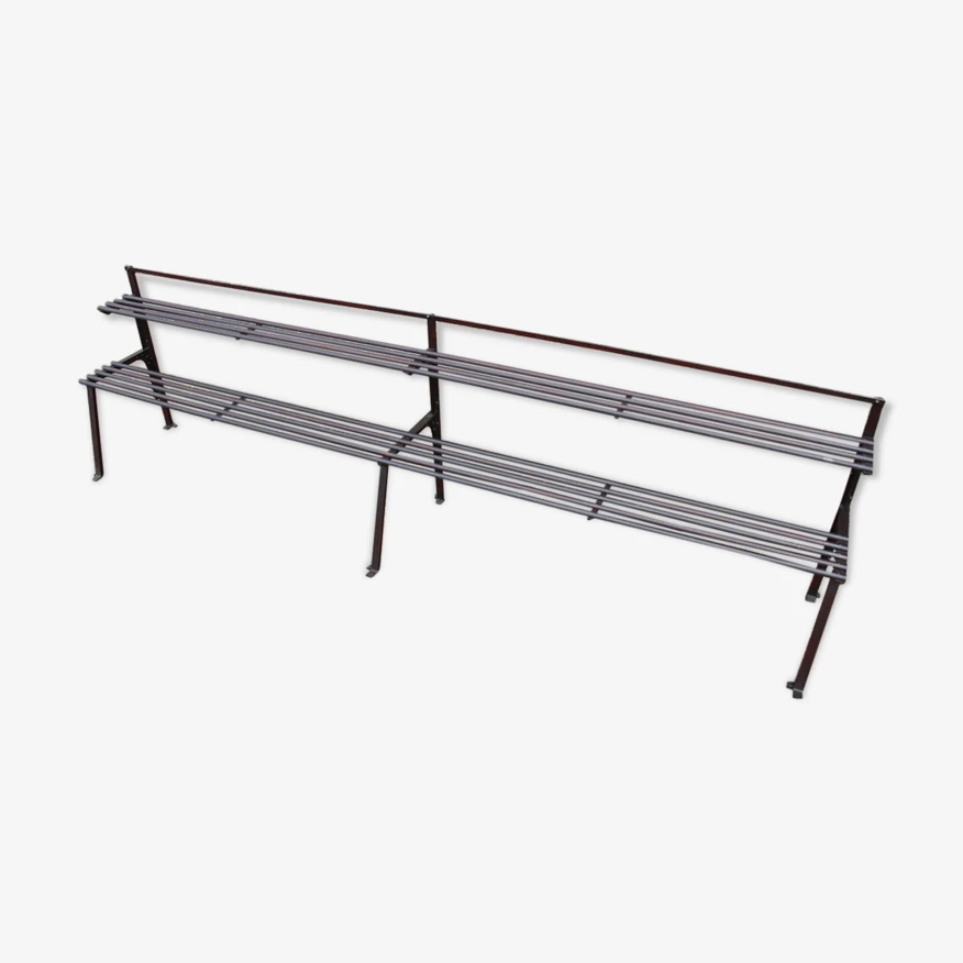 Ancien porte plante tout en métal riveté, patine d’origine grenat entièrement restauré, application vernis antirouille, très bel aspect !