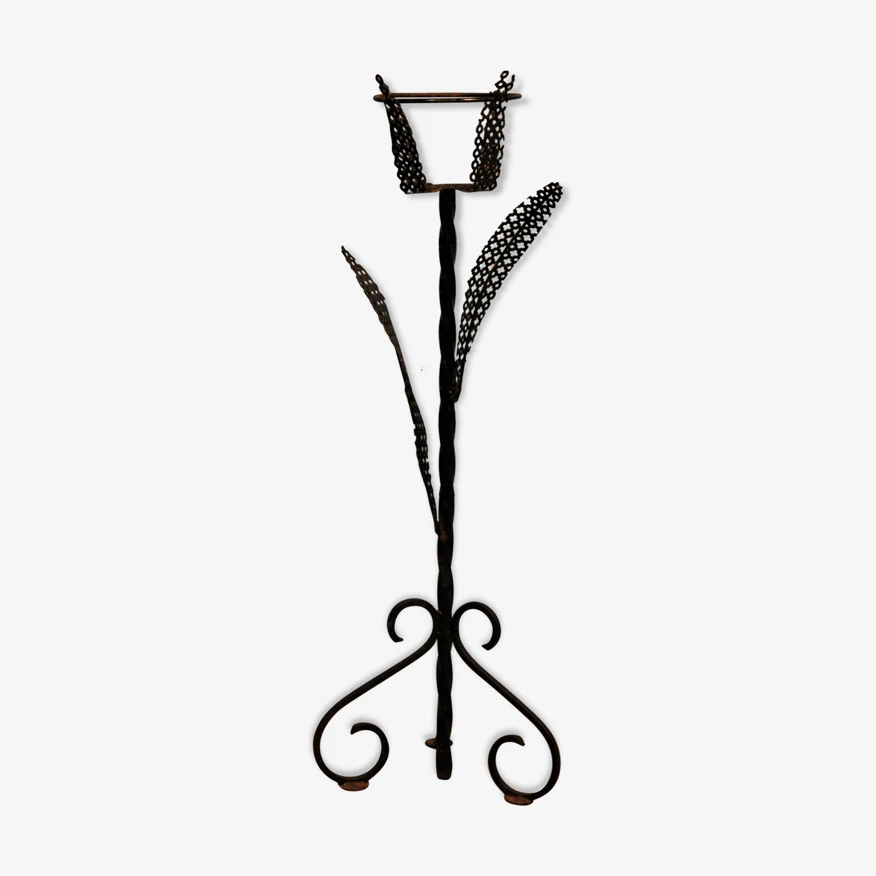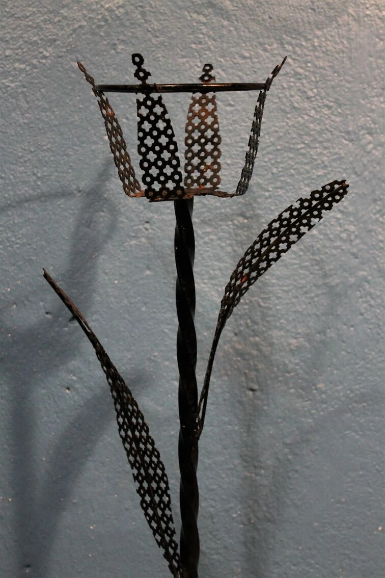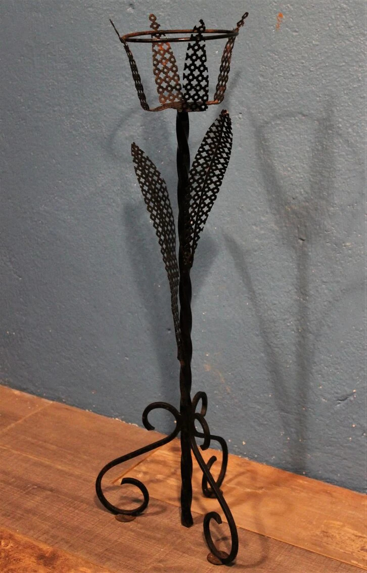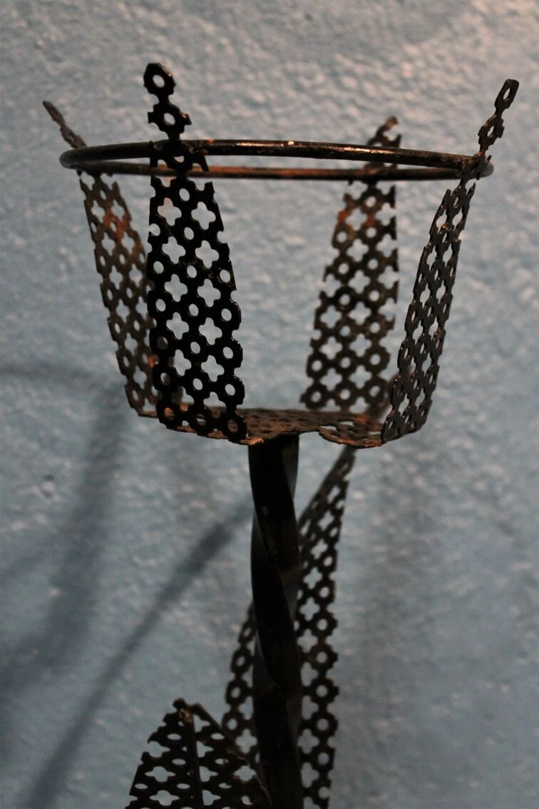 Original porte plante en forme de fleur ! Une édition Française des années 50 très décorative avec une structure à décor de feuilles en métal perforé sur piétement tripode forme volute..