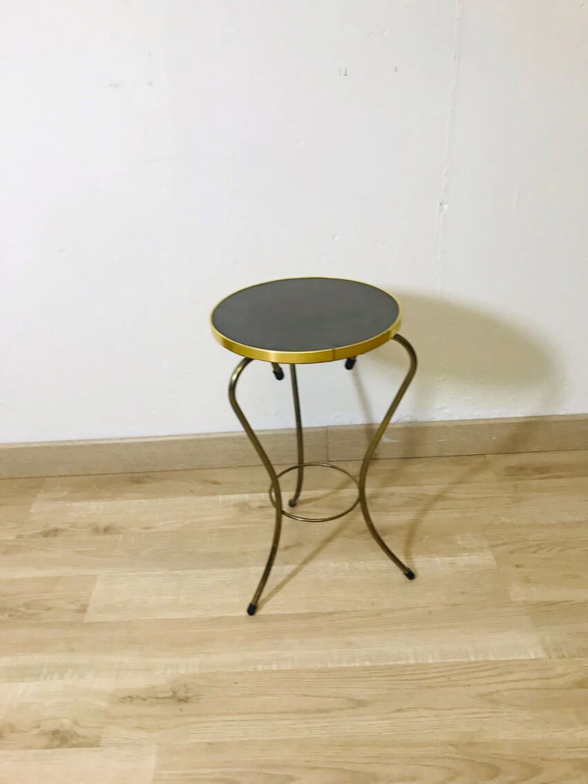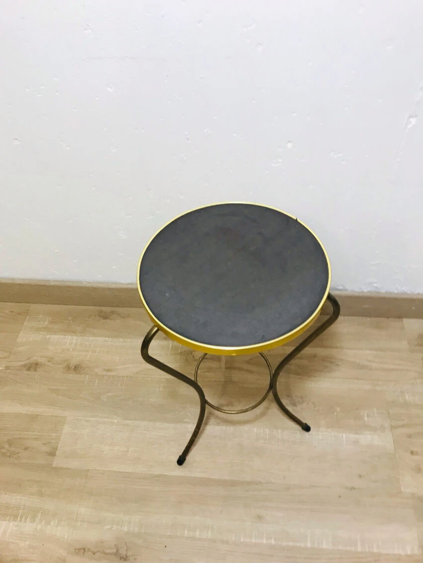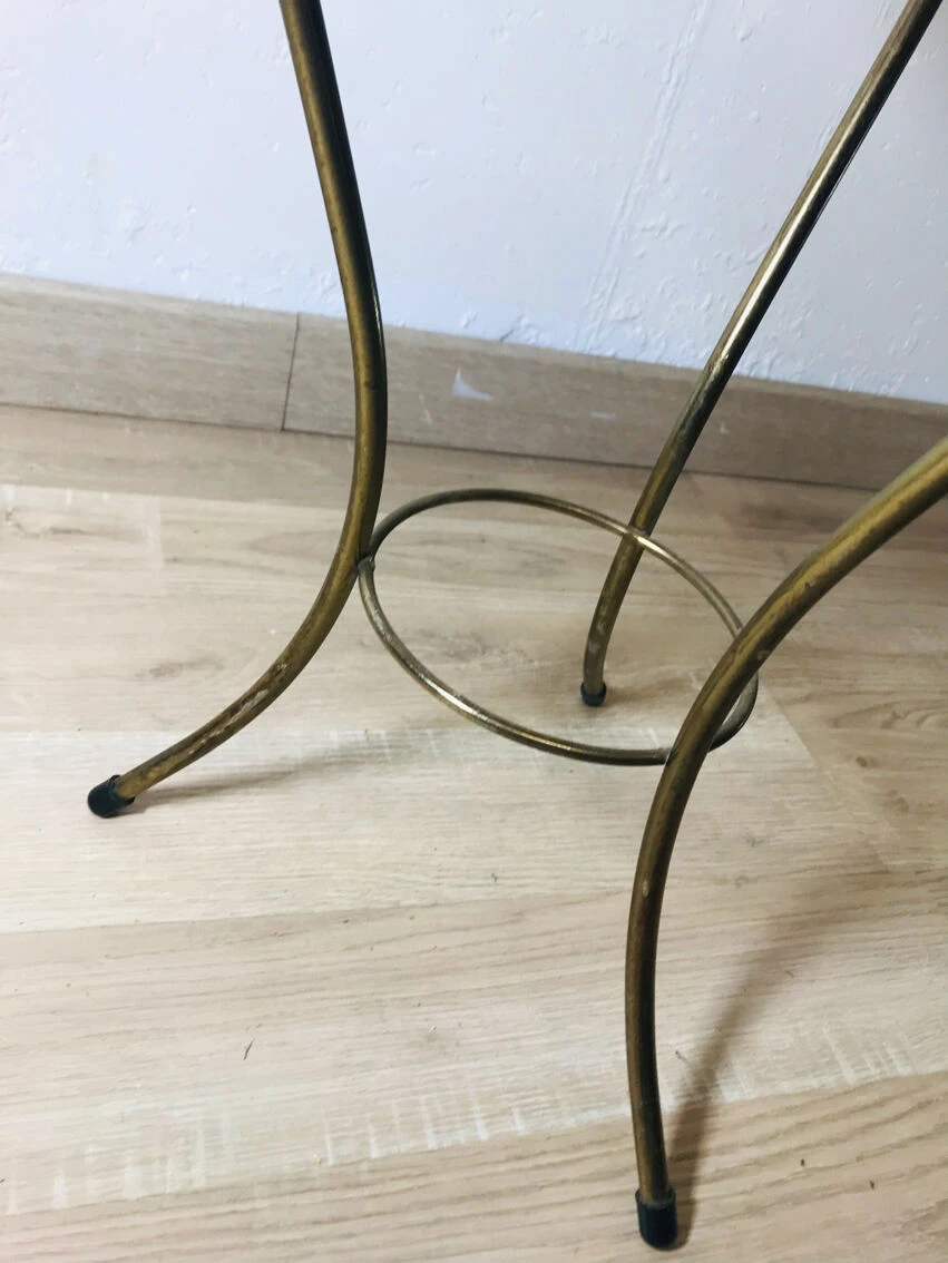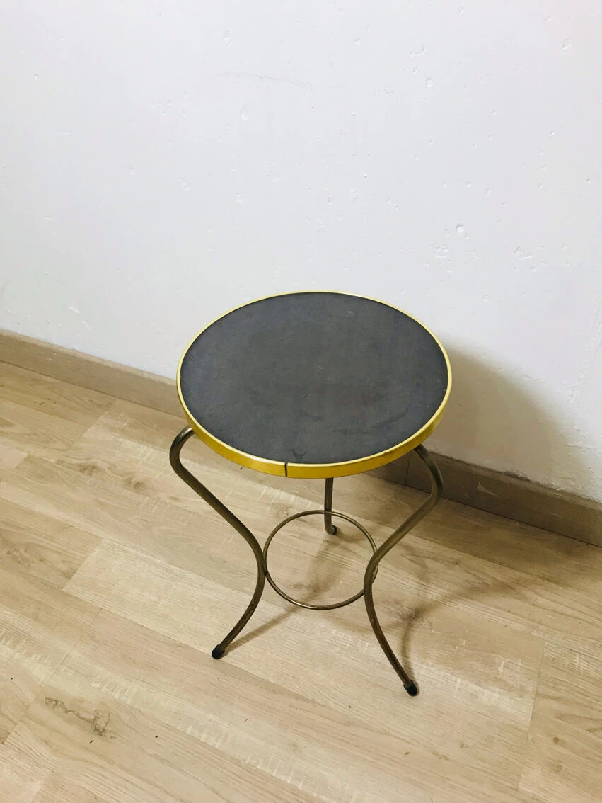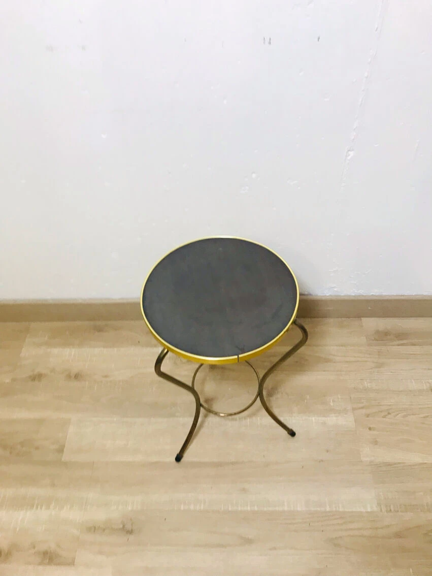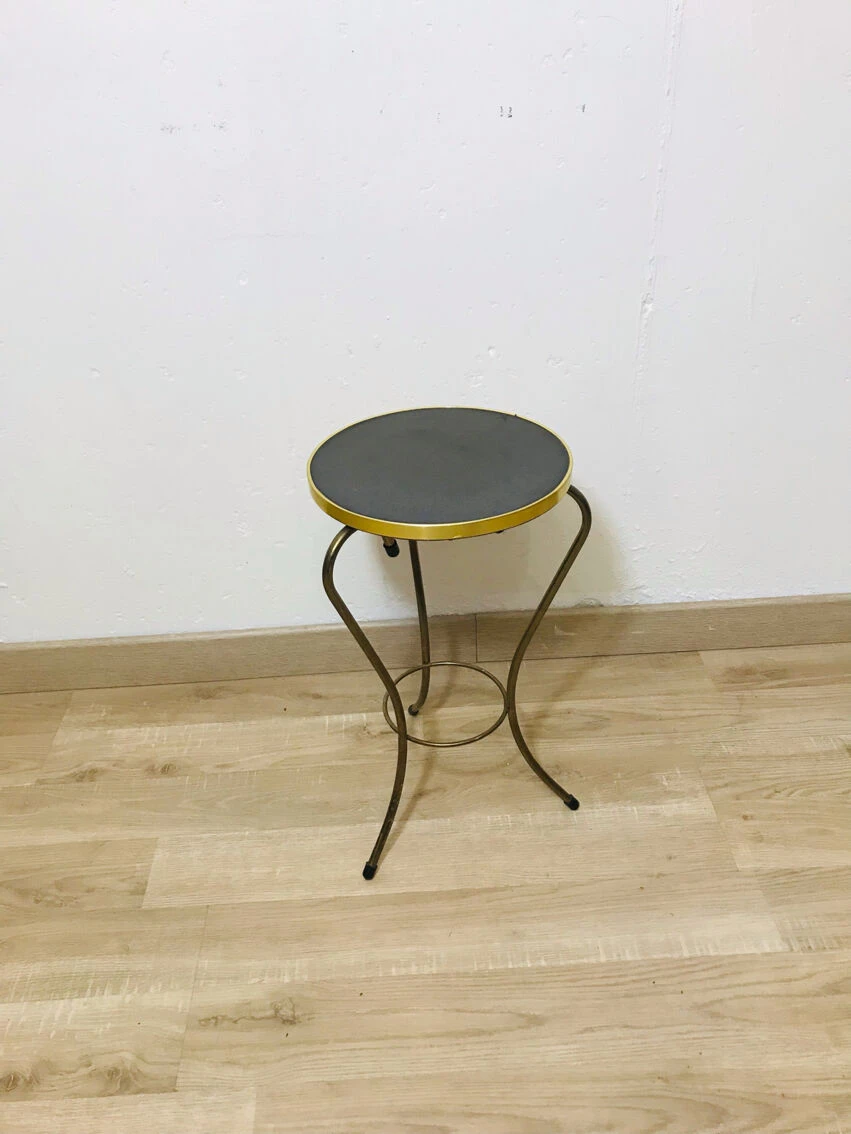 Le plateau est en formica brun (usure) le piétement tubulaire est en métal doré (également de l’usure).