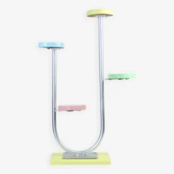 La construction est faite de tubes d’acier courbés et finie avec des étagères rondes en bois trouvées à l’origine pour contenir les pots de fleurs.