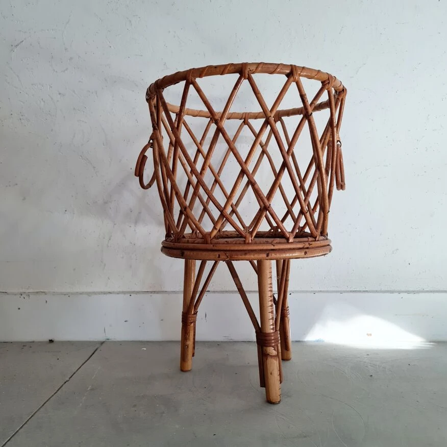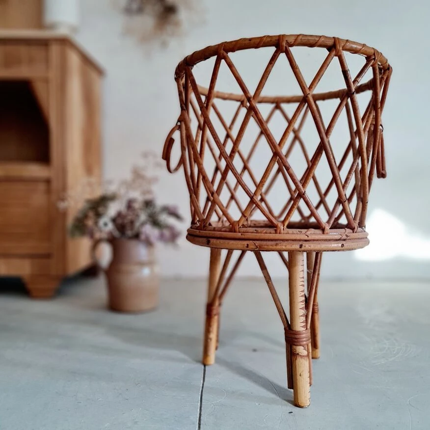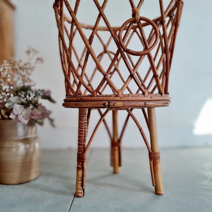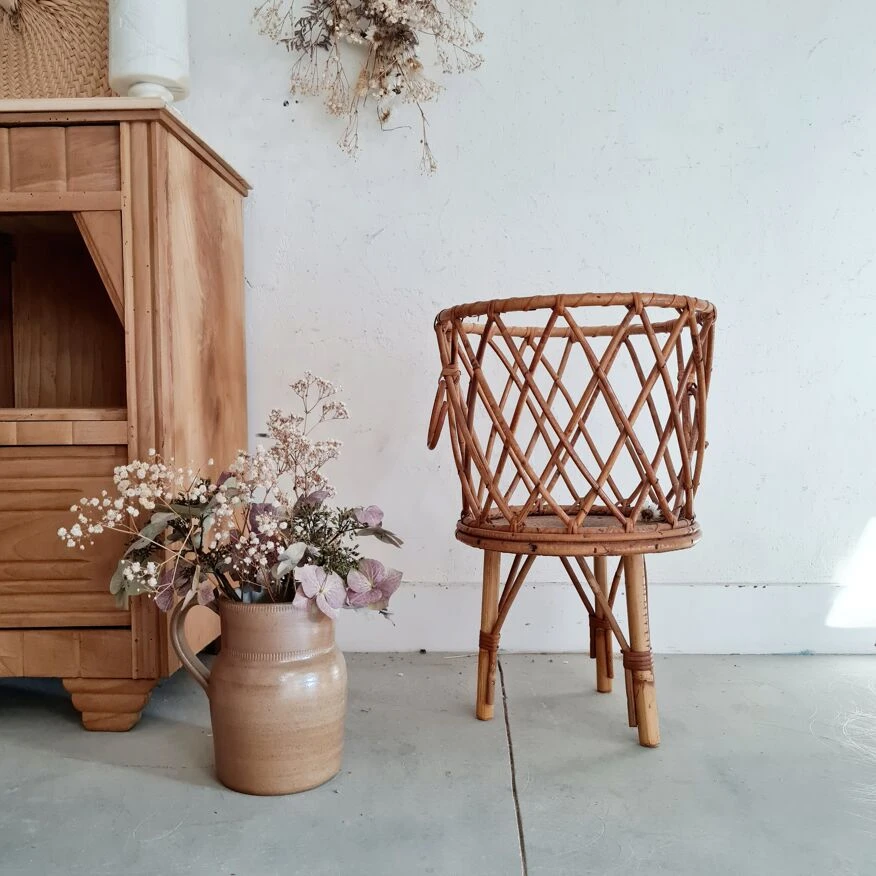 Chouette porte-plantes ou coffre juché sur un piétement tripode en rotin et bambou.