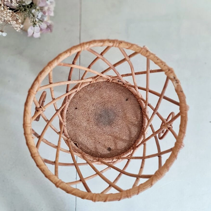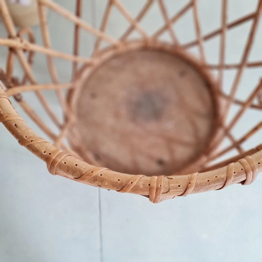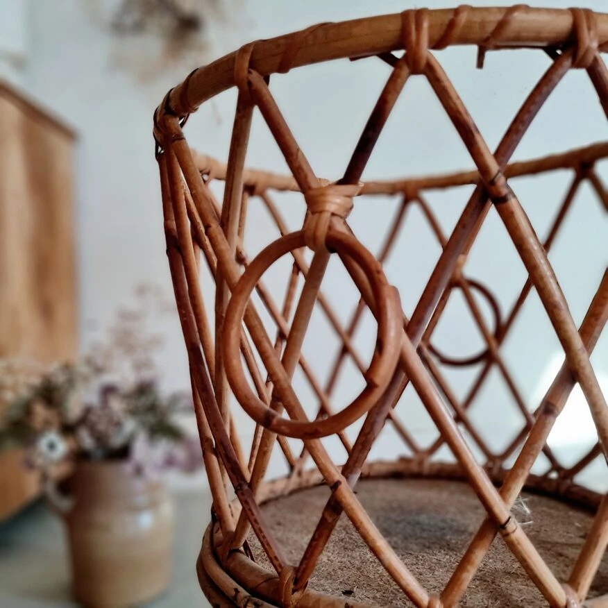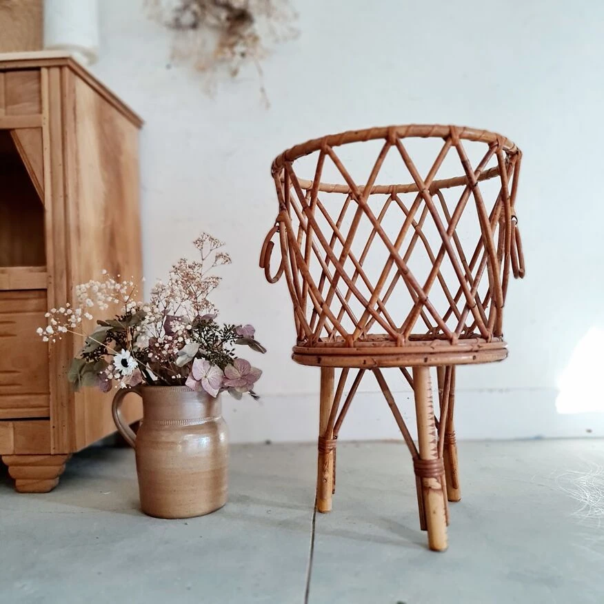 Chouette porte-plantes ou coffre juché sur un piétement tripode en rotin et bambou.