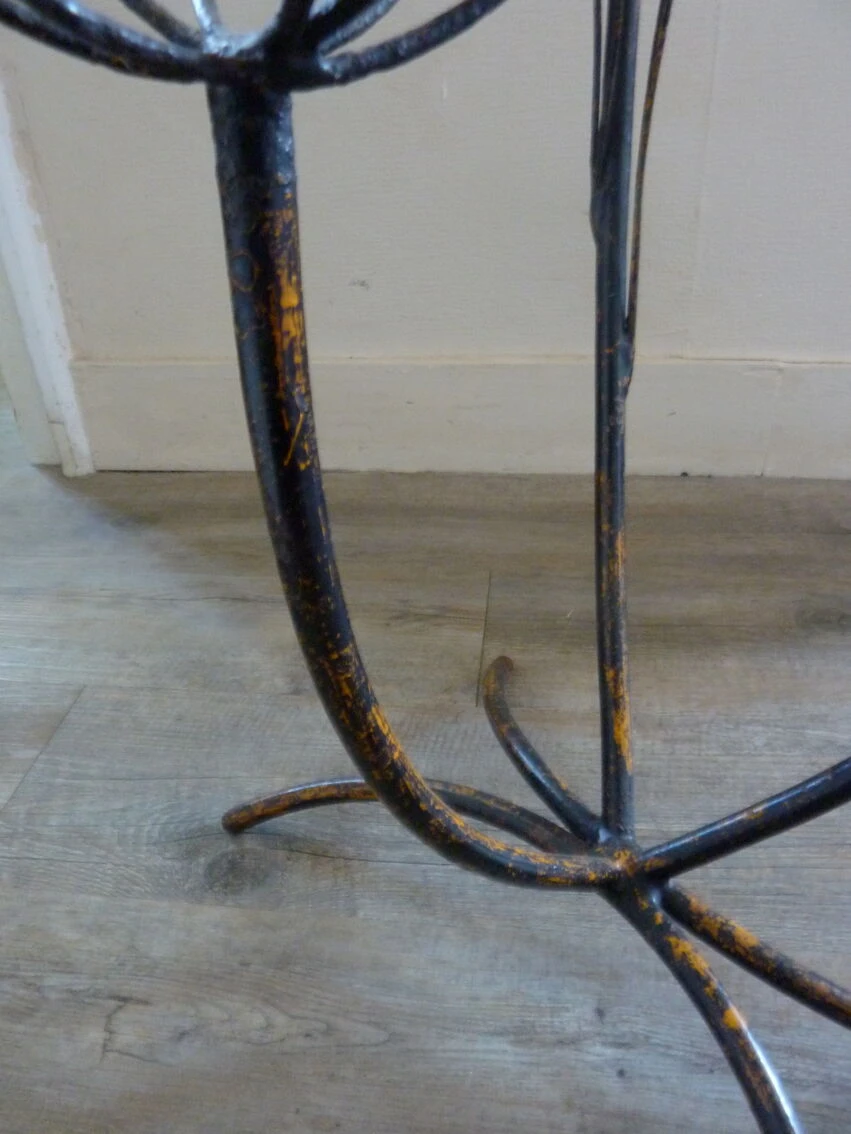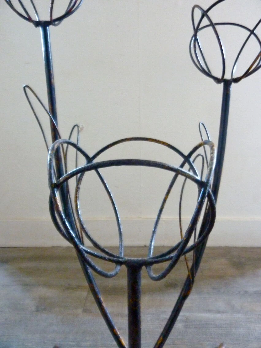 Ancien porte plantes des années 50, avec 3 supports en forme de fleurs. Porte plantes en métal noir avec d’anciens restes de peinture jaune. Porte plantes en très bon état, jolie patine. Dimensions : hauteur max 75 cm // diamètre max support pot 12 cm // largeur max 45 cm // profondeur 38,5 cm