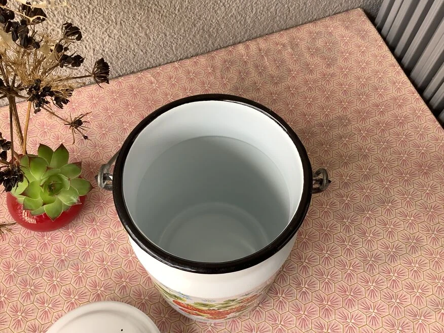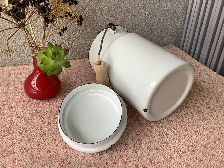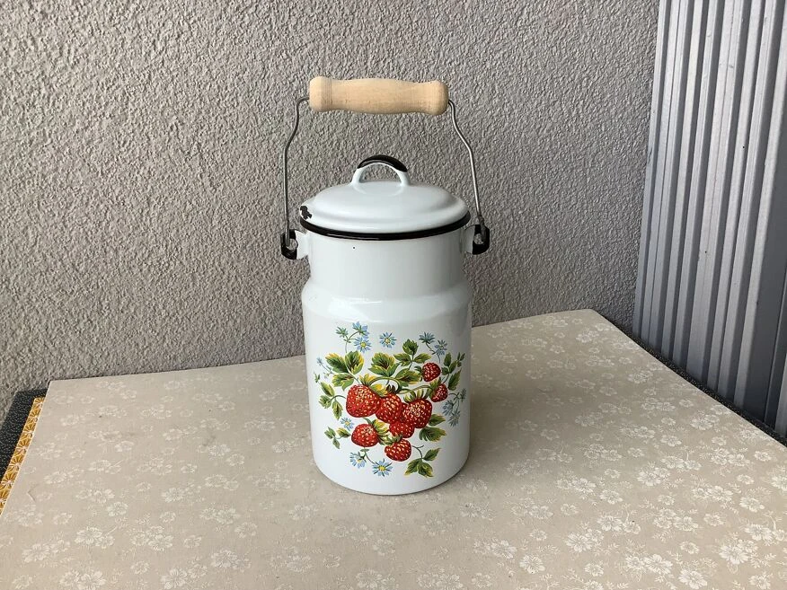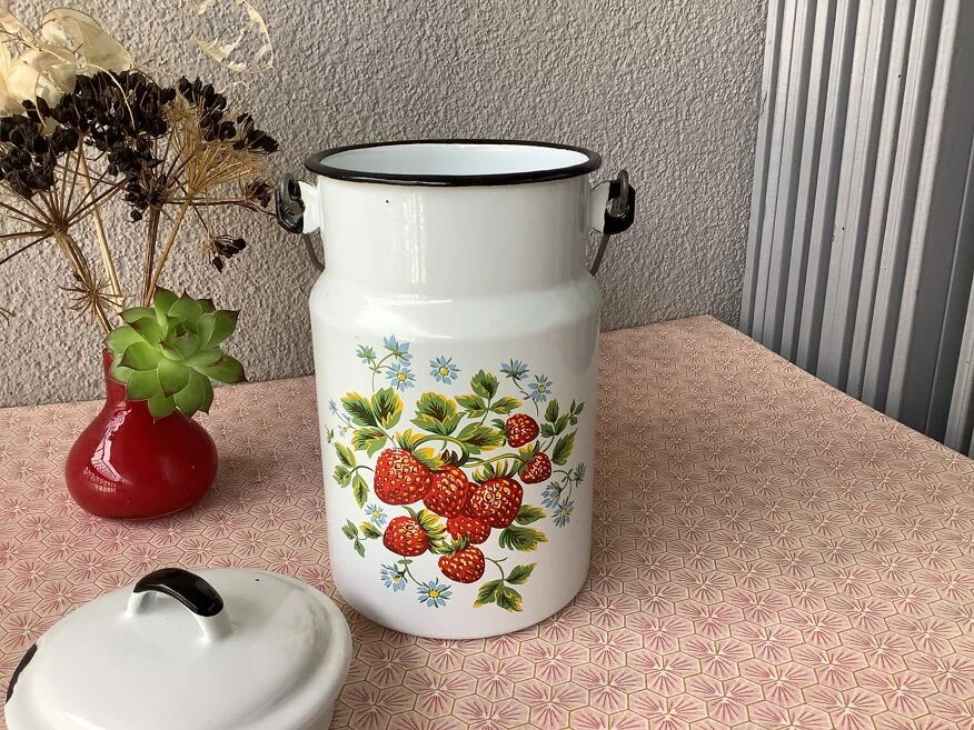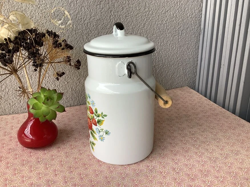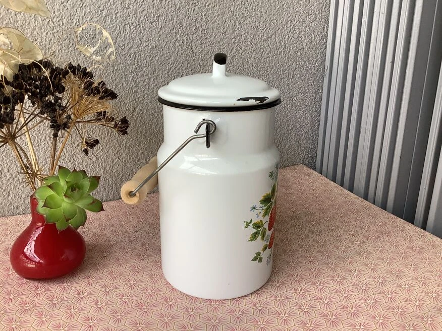 Pot à lait émaillé blanc avec son joli décor de fraises et sa poignée en bois.