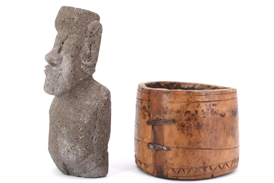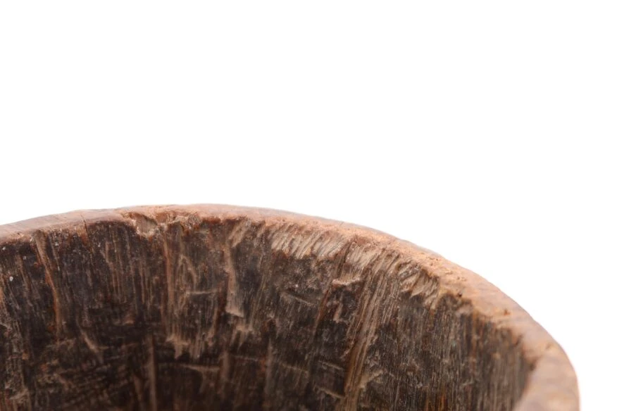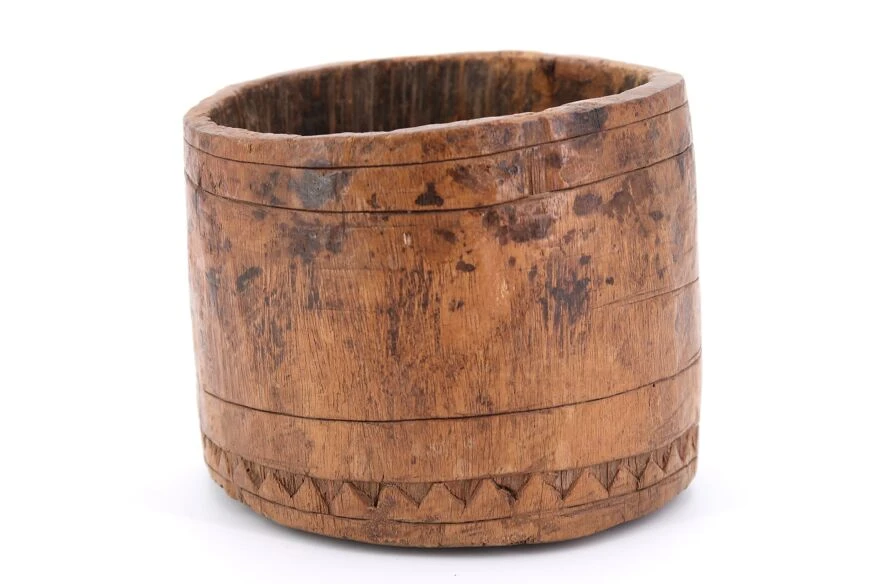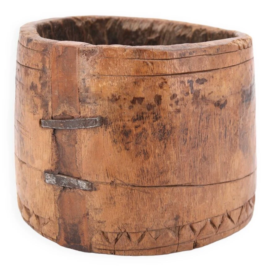 Pot en bois avec décor scarifié et agrafes en métal, années 70.
