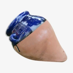 Pot de fleur mural en terre cuite vernissée bleu craquelé.