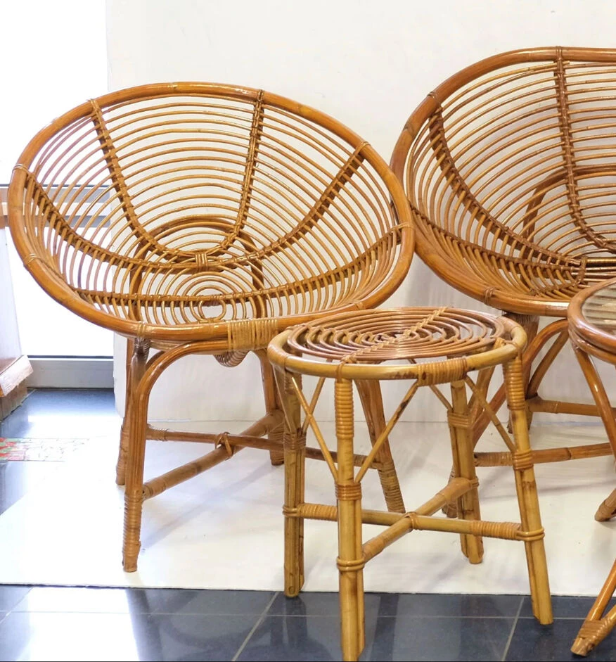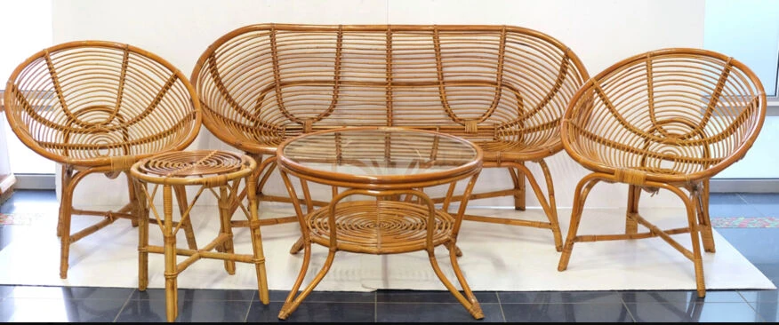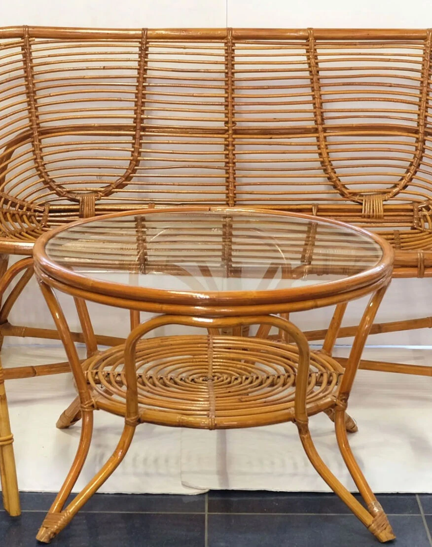 Salon de jardin en rotin comprenant une banquette deux fauteuils et une table basse.