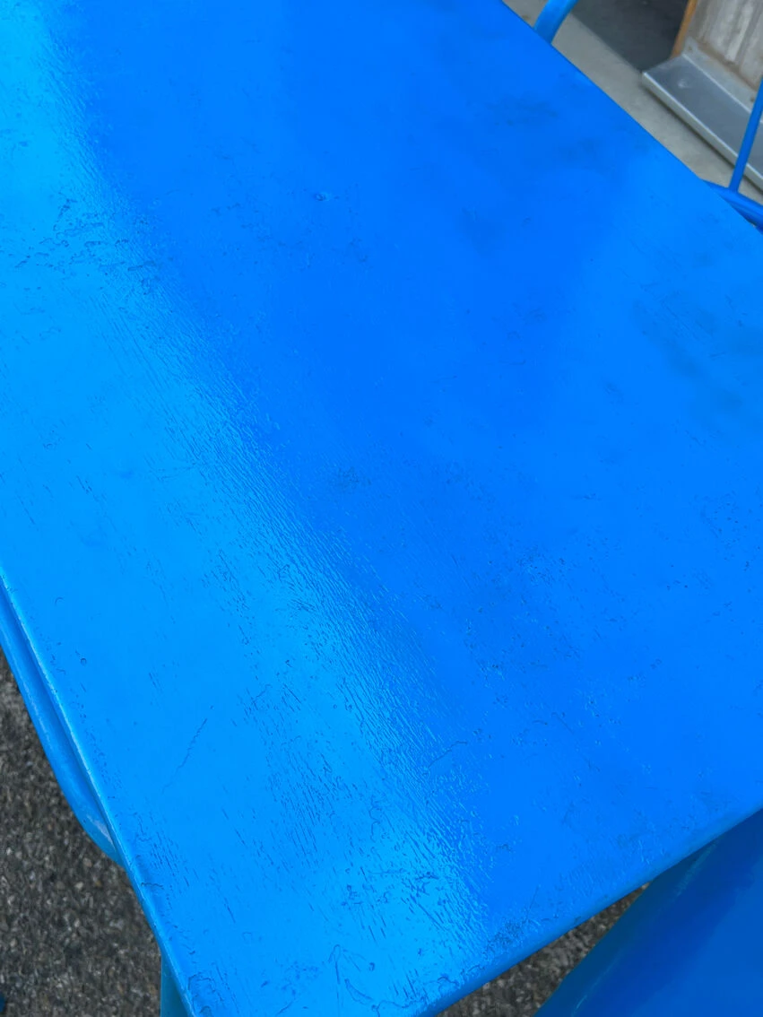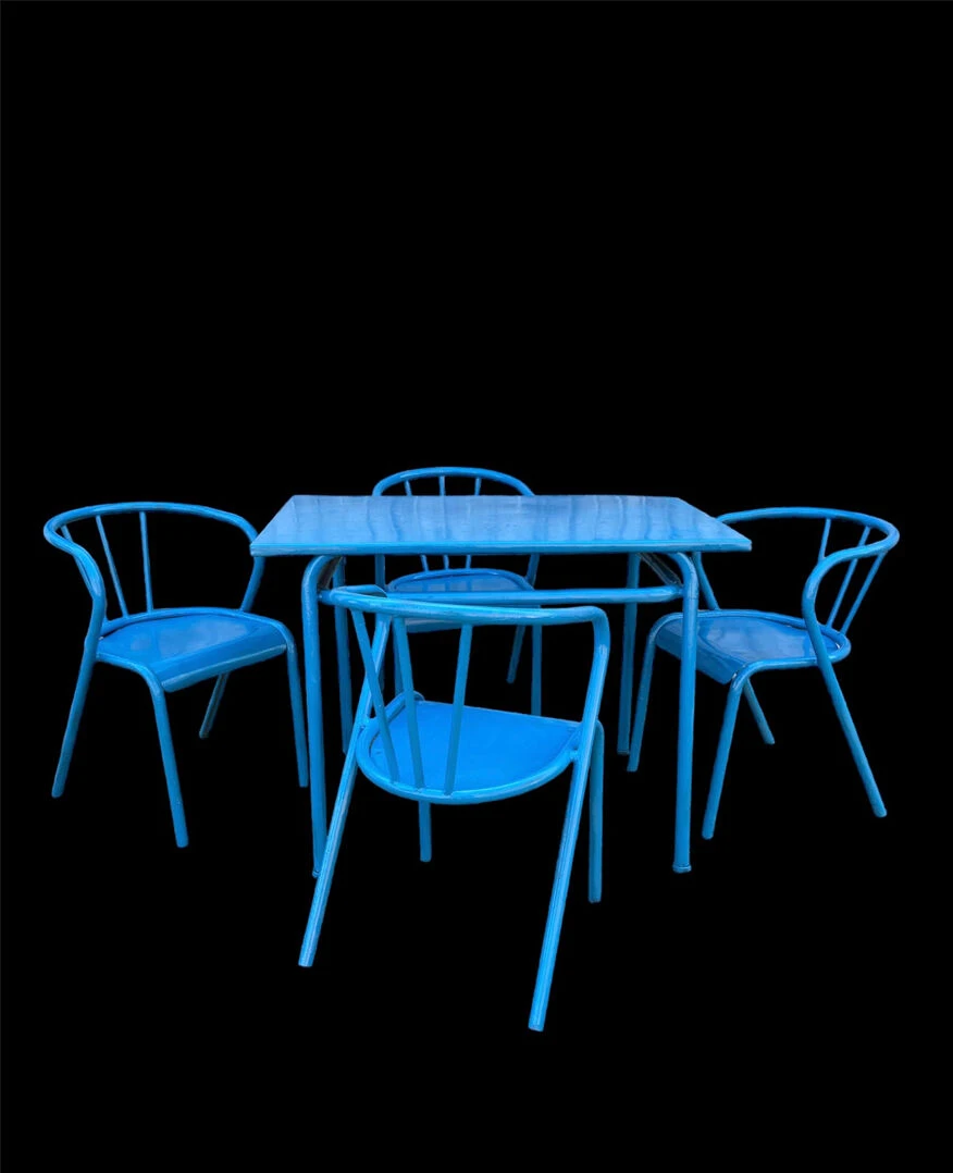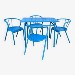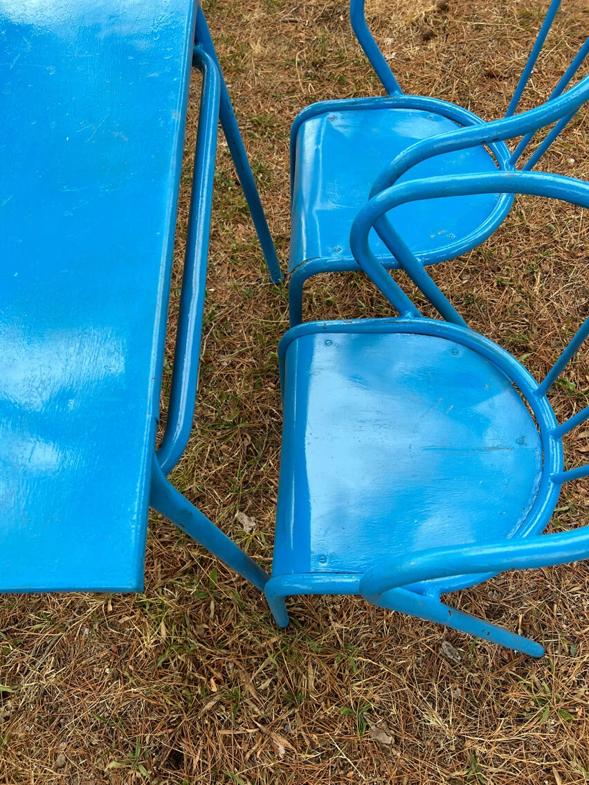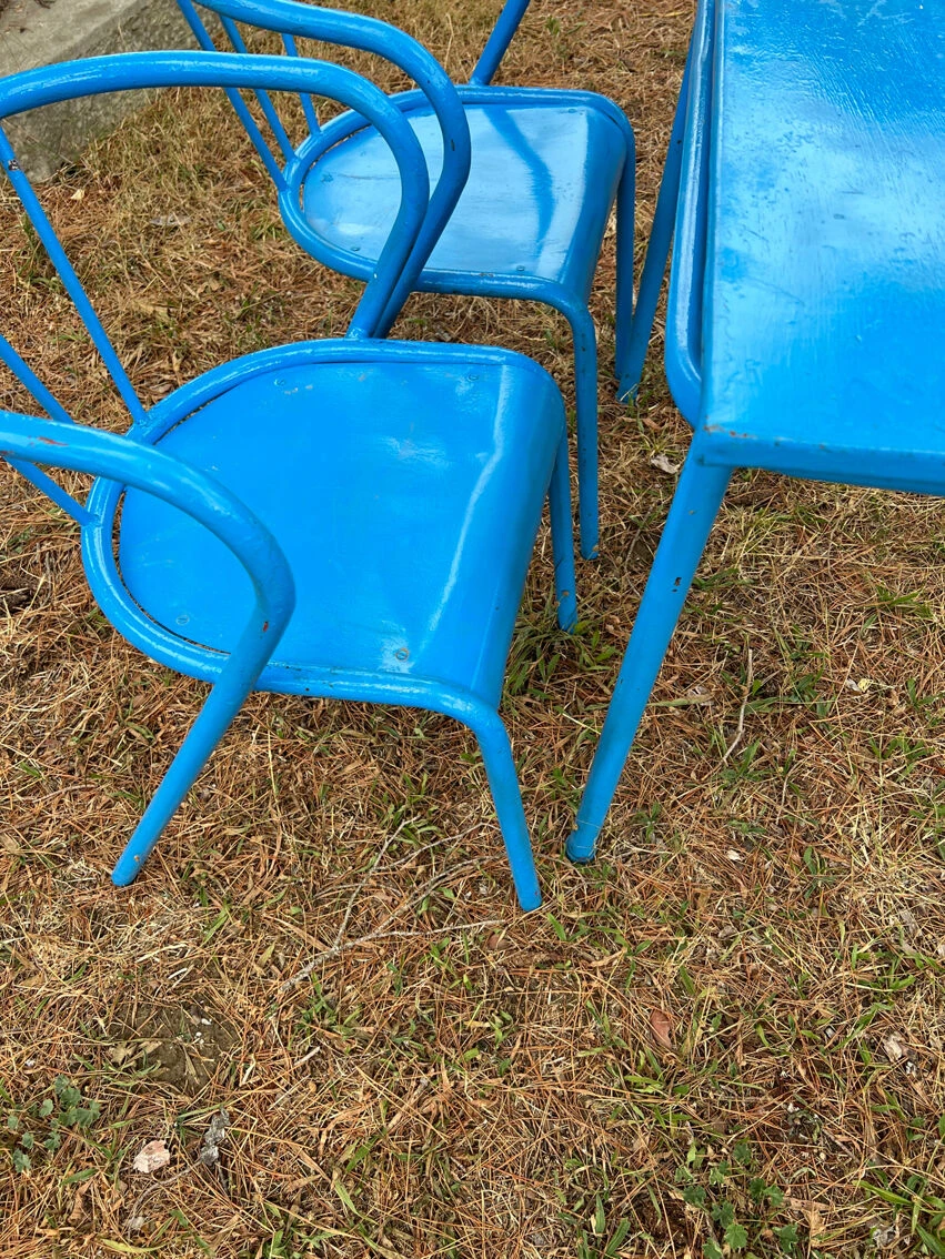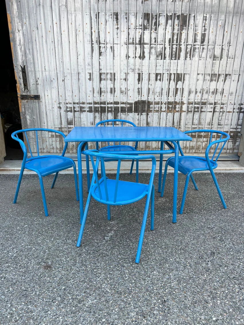 Une table et quatre fauteuils dans l’esprit « tolix », peinture rénovée.