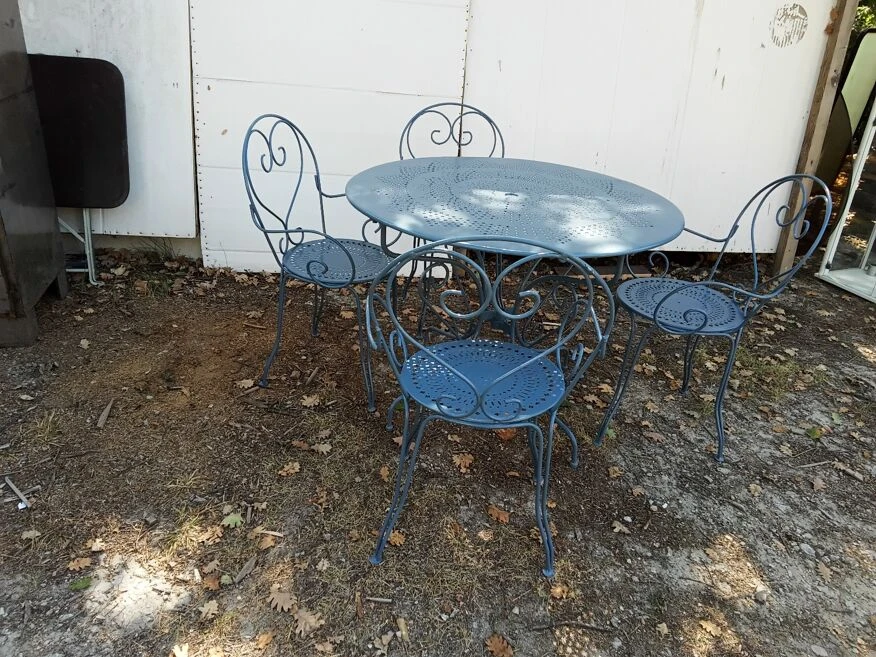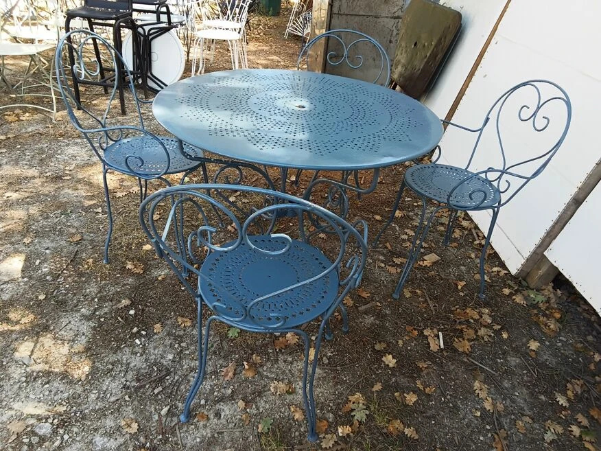 Salon de jardin en fer forgé comprenant une table ronde, diamètre 96cm et 4 fauteuils, largeur 50cm, profondeur 37cm, hauteur 87cm.