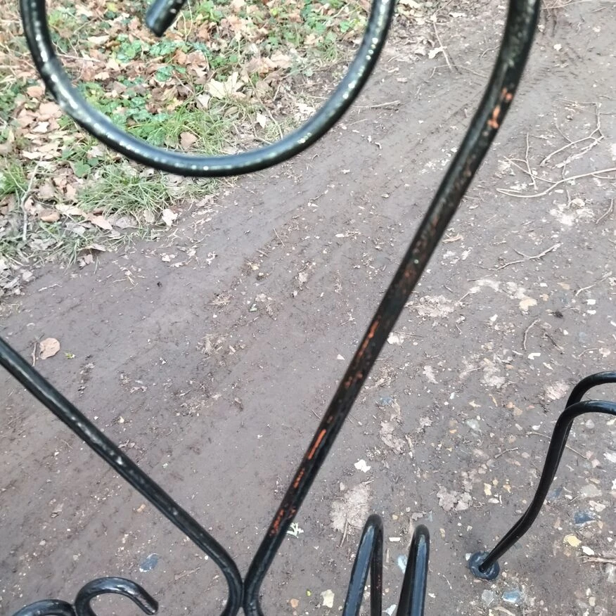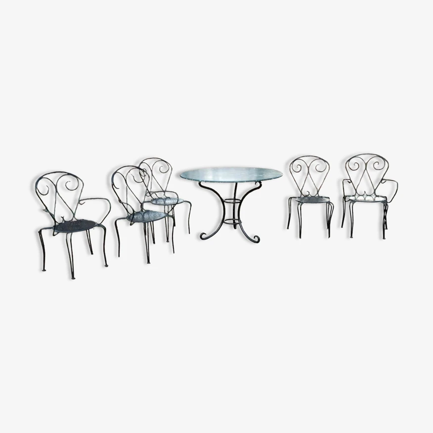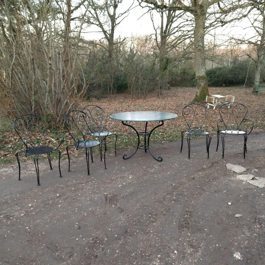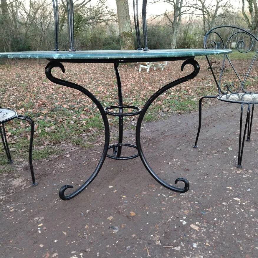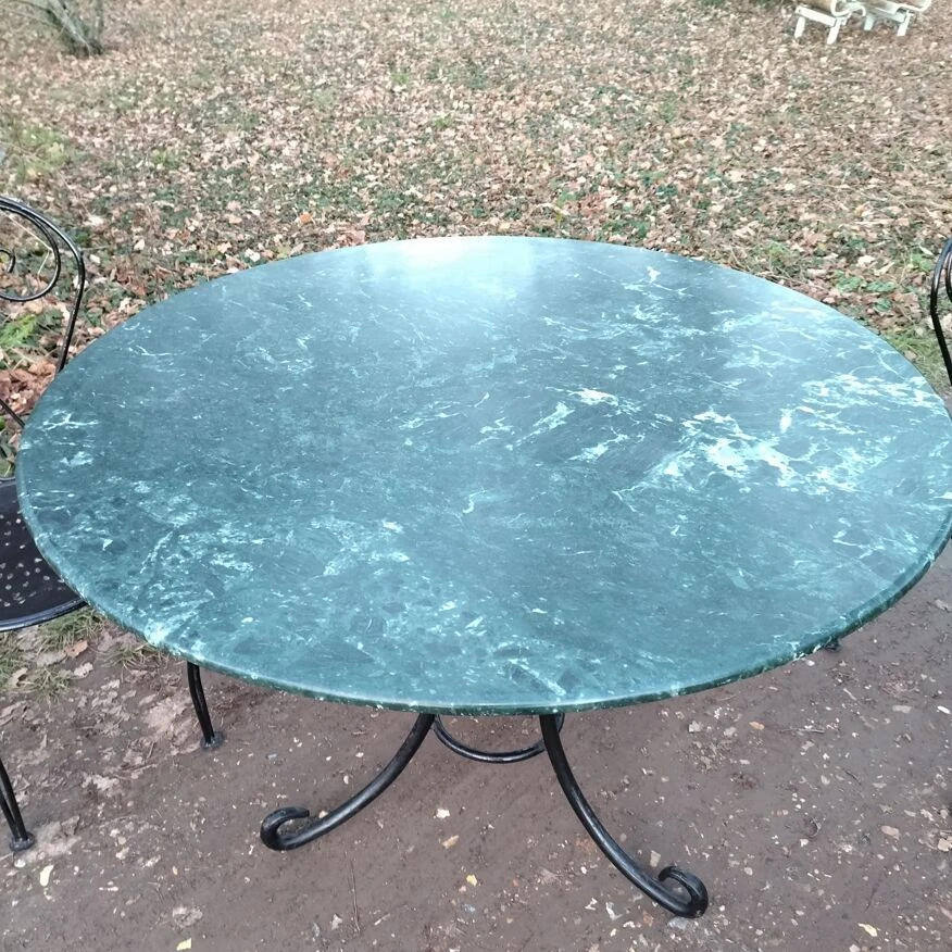 Salon de jardin comprenant 1 table composée d’un lourd pieds en fer forgé et d’un plateau en marbre, épaisseur: 1, 8 cm, diamètre: 119, 5 cm, hauteur: 76 cm.