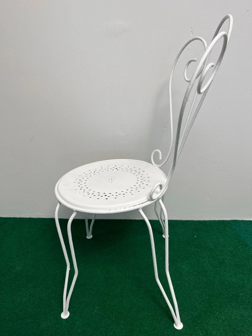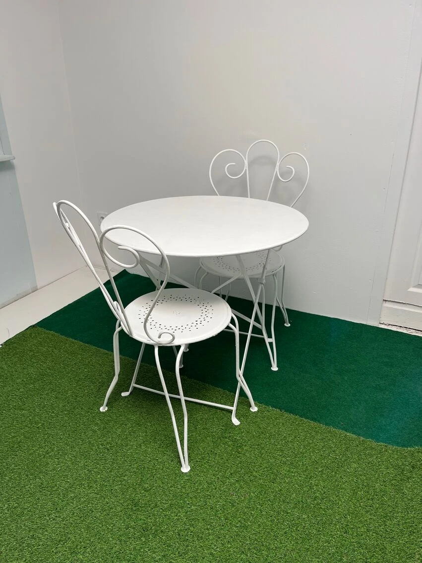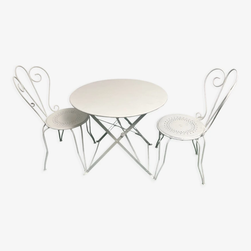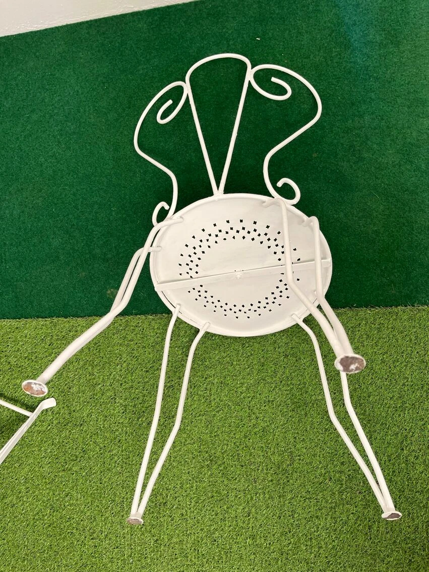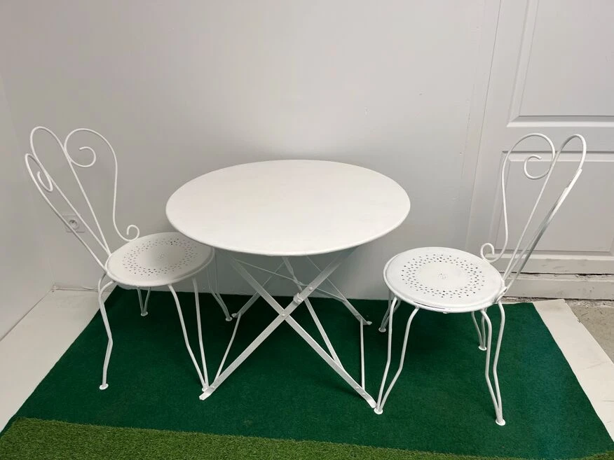 Salon de jardin fer forgé pliante année 50-60, 2 chaises identiques et une table facile à plier, idéal pour balcon ou petite pièces.