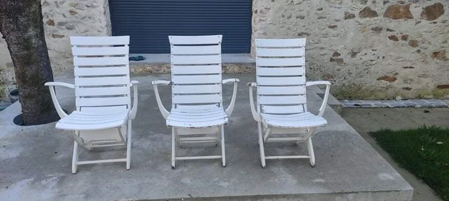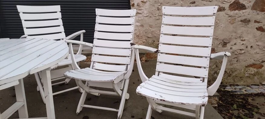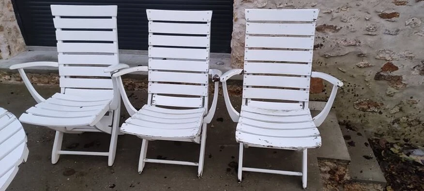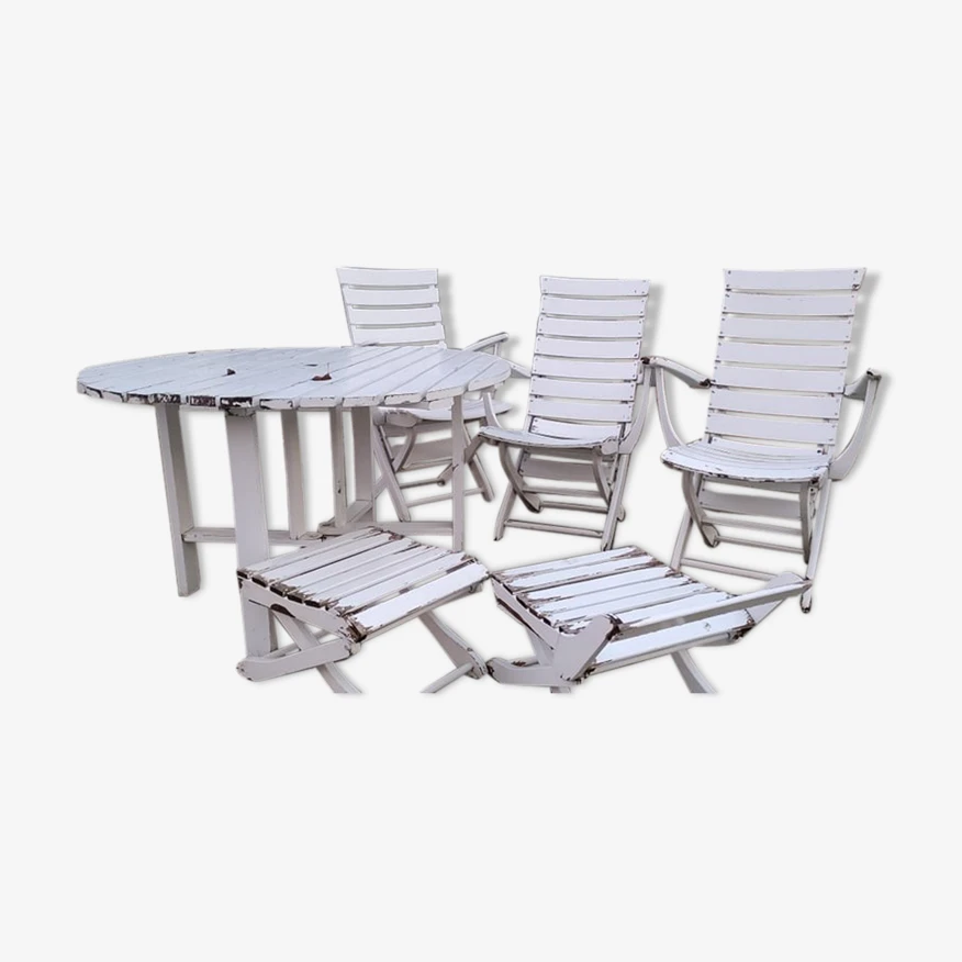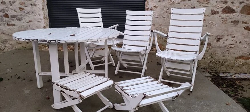 Salon de jardin r.gleizes années 60/70 comprenant une table ronde, deux repose pieds, trois fauteuils ajustable.